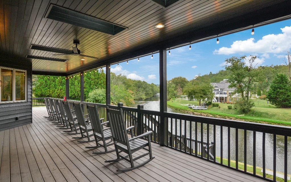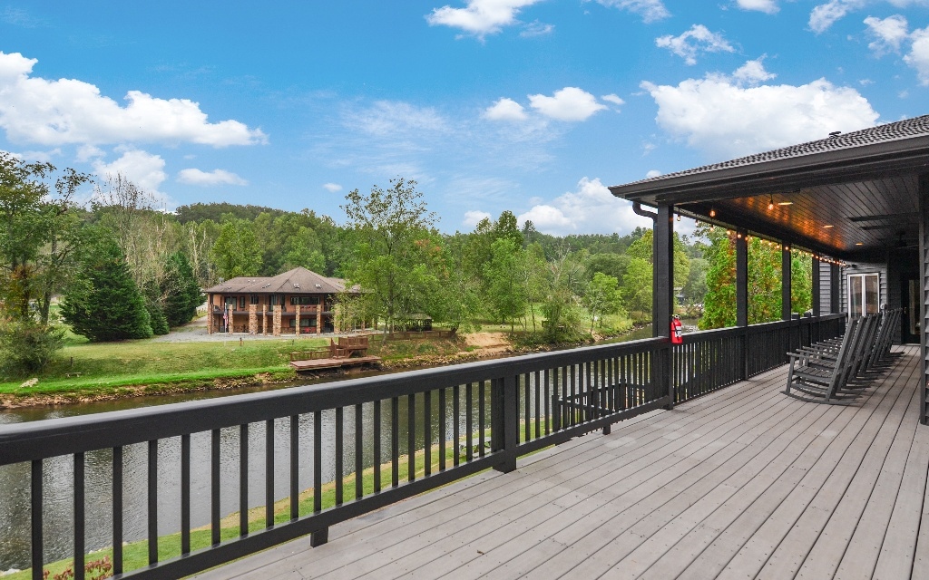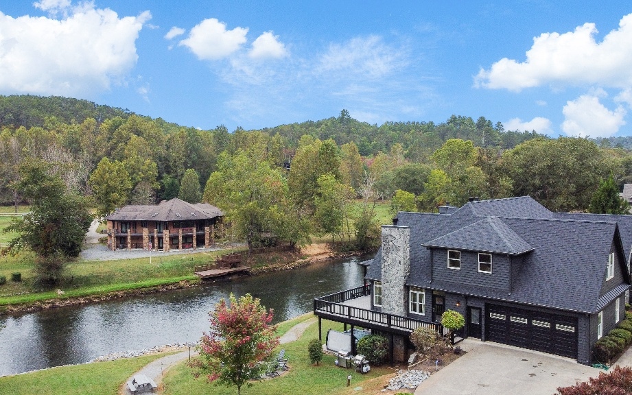 Paradise found! This stunning custom built lodge just steps from the Toccoa River has 140 ft. of river frontage and is just minutes away from the beautiful town of Blue Ridge. Located on the outer bend of the Toccoa River provides you with long river views from the porches and many rooms in the house. This three-level charmer has six spacious bedrooms, each with its own ensuite bathroom. The main suite is located on the main level and has a gorgeous river view and cozy fireplace. The main level also has a second ensuite bedroom, the main kitchen, a family room, a keeping room, formal dining room, laundry room, and half bath. Upstairs you will find a large loft as well as two ensuite bedrooms. The terrace level has a large family room (currently being used as a theater room), a second recently updated kitchen, and two ensuite bedrooms. This fantastic riverside retreat is perfect for full time living, a wonderful second home, or as a short term rental investment property! No HOA! STR ok.