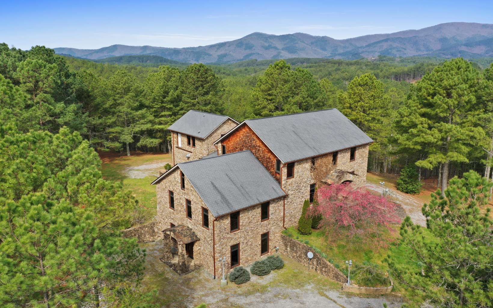 One of a kind home, 8800 sq. ft. Custom built from top to bottom 860 tons of stone covers the exterior of home. Lots of possibilities in this home, 3 master bedrooms, Large Chef Style Kitchen, All very open rooms for entertaining, Full Finished Basement with wet bar, large game room ,office, 800 sq. ft. safe room for guns, or storm shelter. Gated Entrance, house sits on 12.92 acres, Year round mtn. view, 6 car garage with power and water, lots of extra parking, 60 KW. full home generator, Zoned C/H/A. Also on property is a separate 2 story Building for workshop, Studio or office. Mechanical room has water and electrical supply lines identified for different parts of the home in case service is needed. No state tax and only 20 min. to Downtown Blue Ridge, or Murphy , N.C.