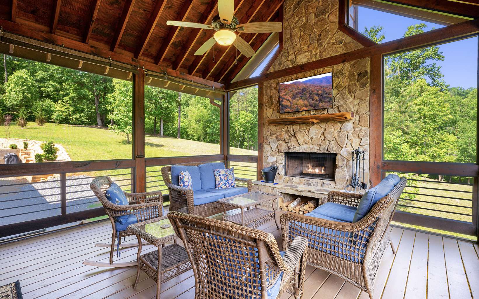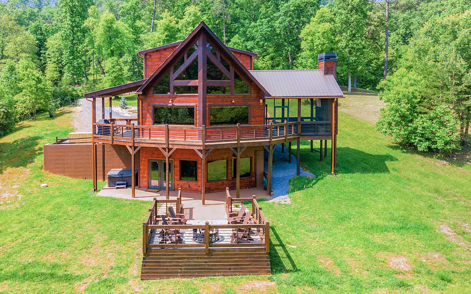 ~Down by the River~ Luxury vacation cabin perched above the Scenic Blue Ridge railway with 130ft of level frontage on the Toccoa River. Meticulously maintained inside and out. Rustic all-wood interior with mountain laurel railing and custom hand-hewn staircase, upgraded granite countertops throughout, and king-size bedrooms on each level. Open great room layout with several picture windows allowing river views and tons of natural light. An upper level master retreat with walk-in tile shower and walk-in closet. The full finished lower level is complete with media/gameroom and wetbar. Tons of outdoor areas including screened living area with fireplace, 2 firepit areas (one riverside), and hottub patio. Furnishings available for additional cost. Easy location off all paved roads between Blue Ridge and McCaysville. Current vacation rental with strong rental projections for 2023.