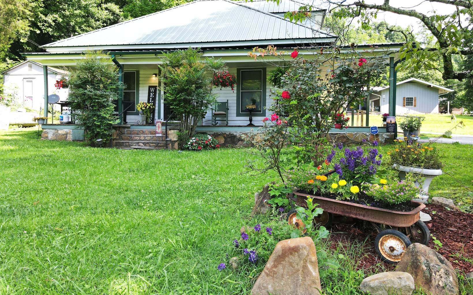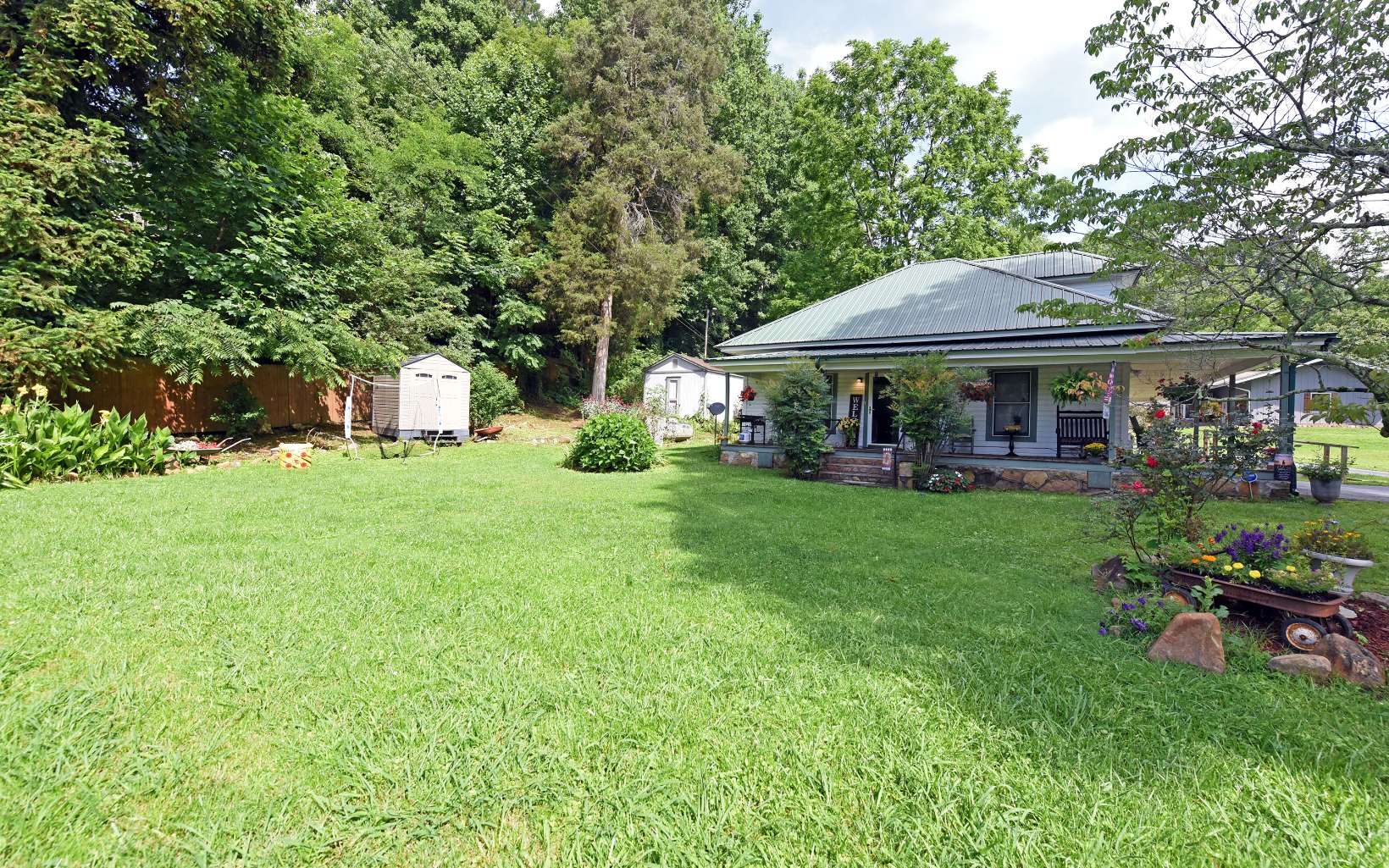 This vintage Home / Bungalow / Cottage is in great shape and cute as can be without being small. Large Dining room for large family gatherings. Located on a quiet street just outside of Downtown Andrews. Level usable yard with garden area with 2 out buildings / workshop, Two bedrooms on main floor, and a finished attic that could be an ultimate ART STUDIO. This would make a great Vacation Rental with all the charm of the turn of the century with its wrap around porch. Existing lease. Window A/C in attic does not convey. Renters lease will be up on Sept. 30th 2023.