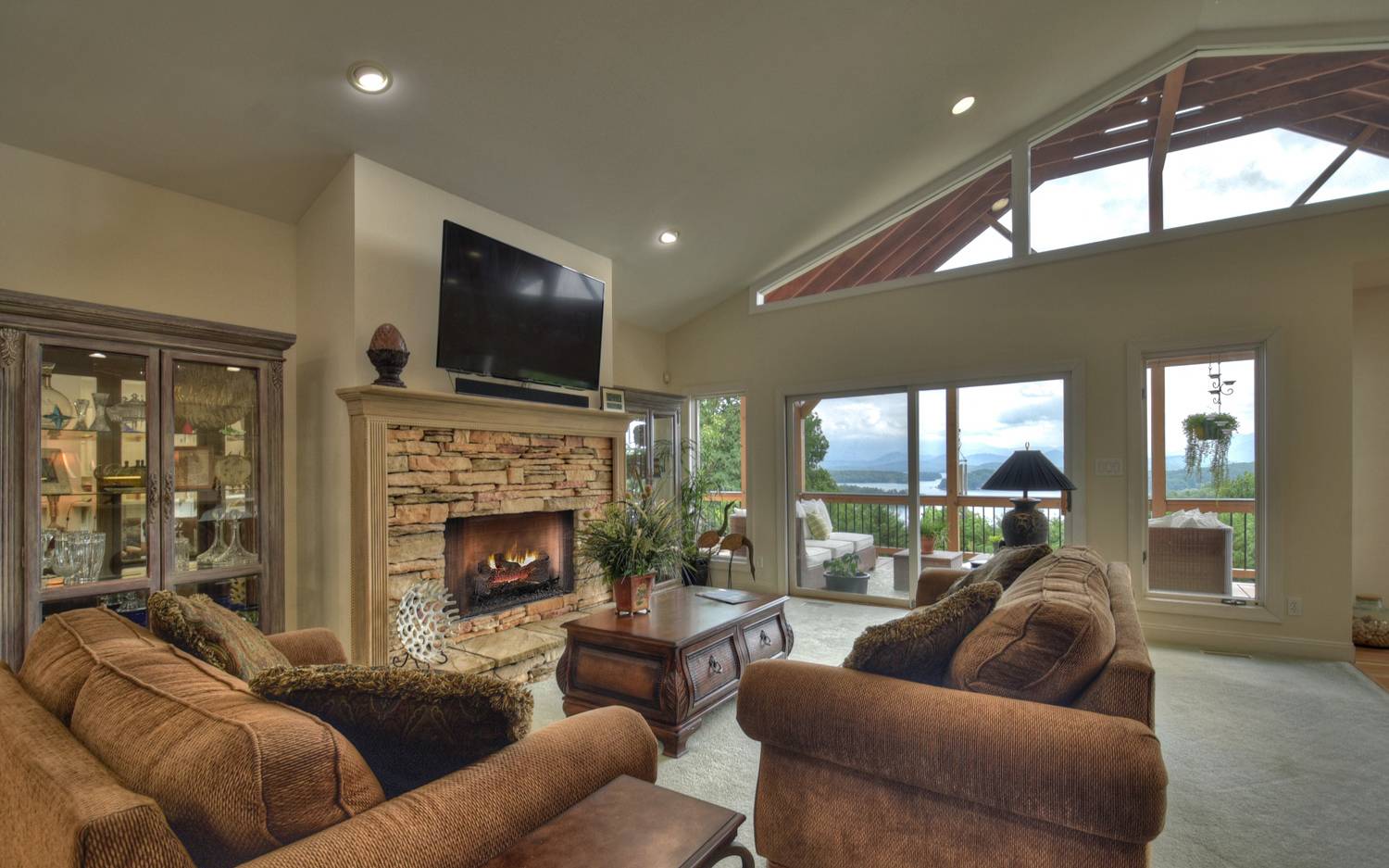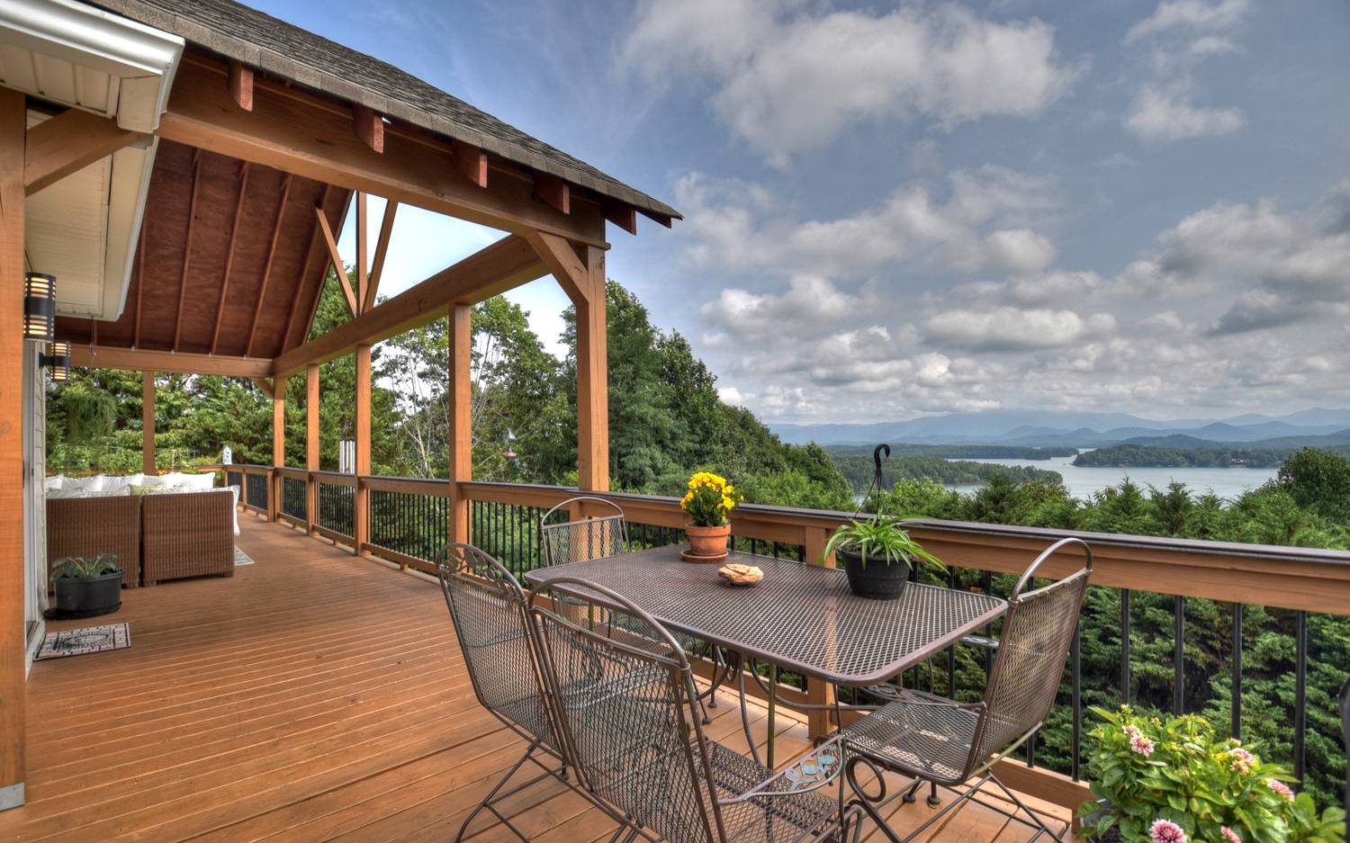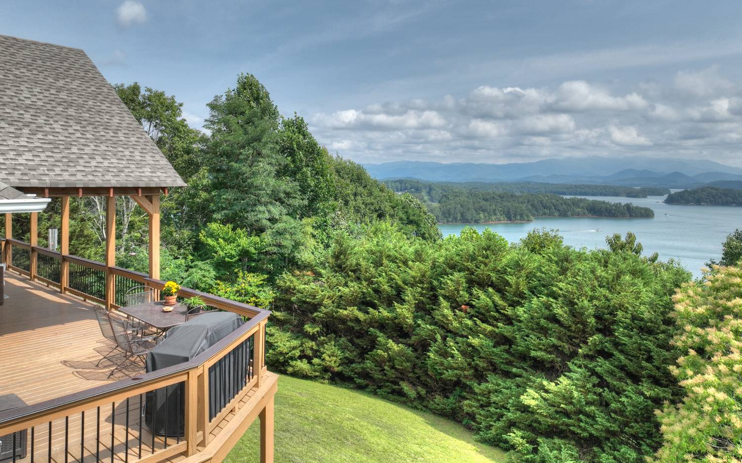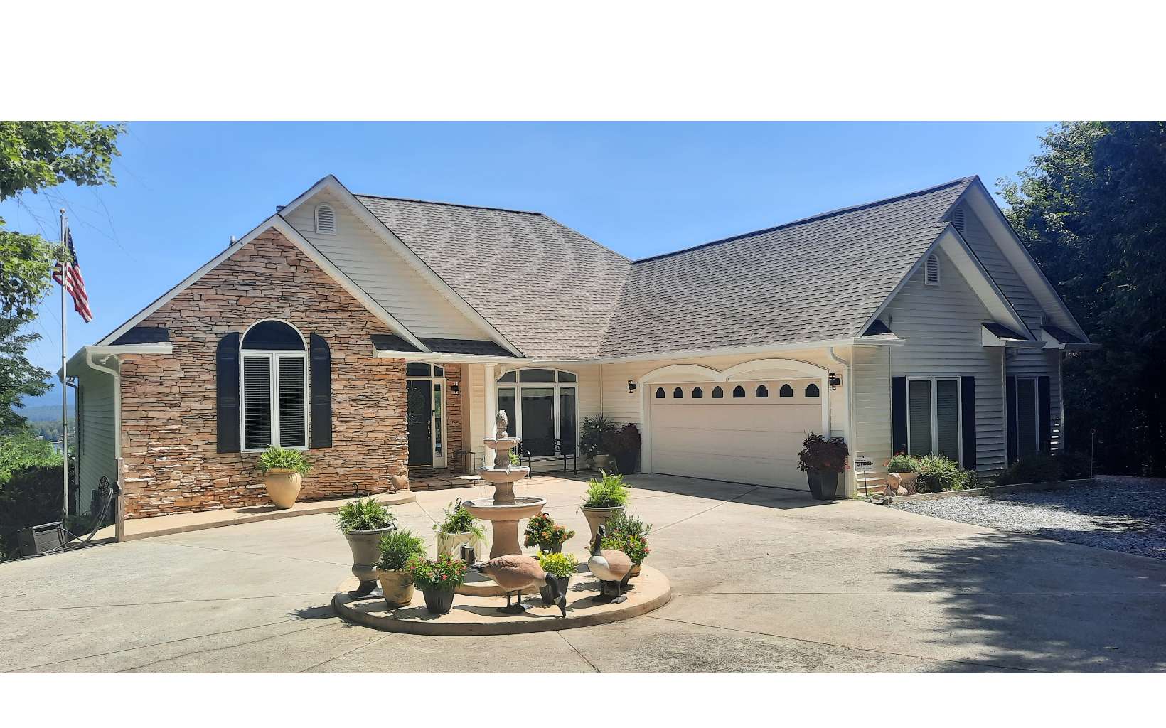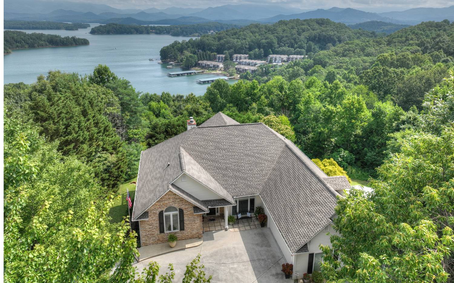 Imagine yourself in a peaceful, private setting looking out over beautiful Lake Chatuge, past the mountains of North Georgia, to ridges & ranges of mountains 19 miles away, rising over 5000 feet in North Carolina. Now imagine that view is from almost every room in your 4,704 sq. ft., 5 bedroom, 4 bath home. Make that daydream a reality! The perfect full-time family residence, seasonal home, or weekend getaway, a world away from the hustle and bustle, yet convenient; mere minutes to shopping, groceries, pharmacies, medical and emergency care, schools, golf, entertainment, restaurants, vineyards, and resorts. Located at the end of a very private, paved, tree-lined road (only two other houses), as soon as you enter the circular driveway, a bubbling fountain at its center, you realize you have arrived. Whether entering through the leaded glass front door or driving into the roomy two car garage, you can see straight through the house to the water and mountains beyond. Believe me, the view never gets old. It’s easy main level living inside, beyond the open foyer and gleaming hardwoods is a living room with vaulted ceiling and stacked stone gas log fireplace, adjacent dining room, kitchen with solid surface countertops, stainless steel appliances, breakfast bar and breakfast nook with a built-in kitchen desk. Nearby is a walk-in pantry, laundry, half-bath and garage access. On one side of the main living area is the huge primary bedroom, en suite with his and hers walk-in close