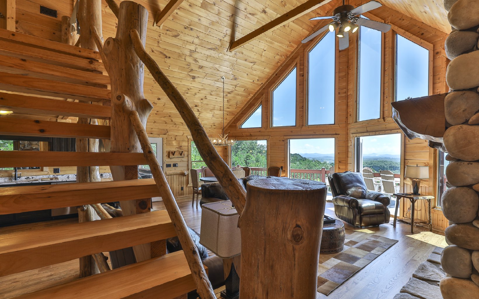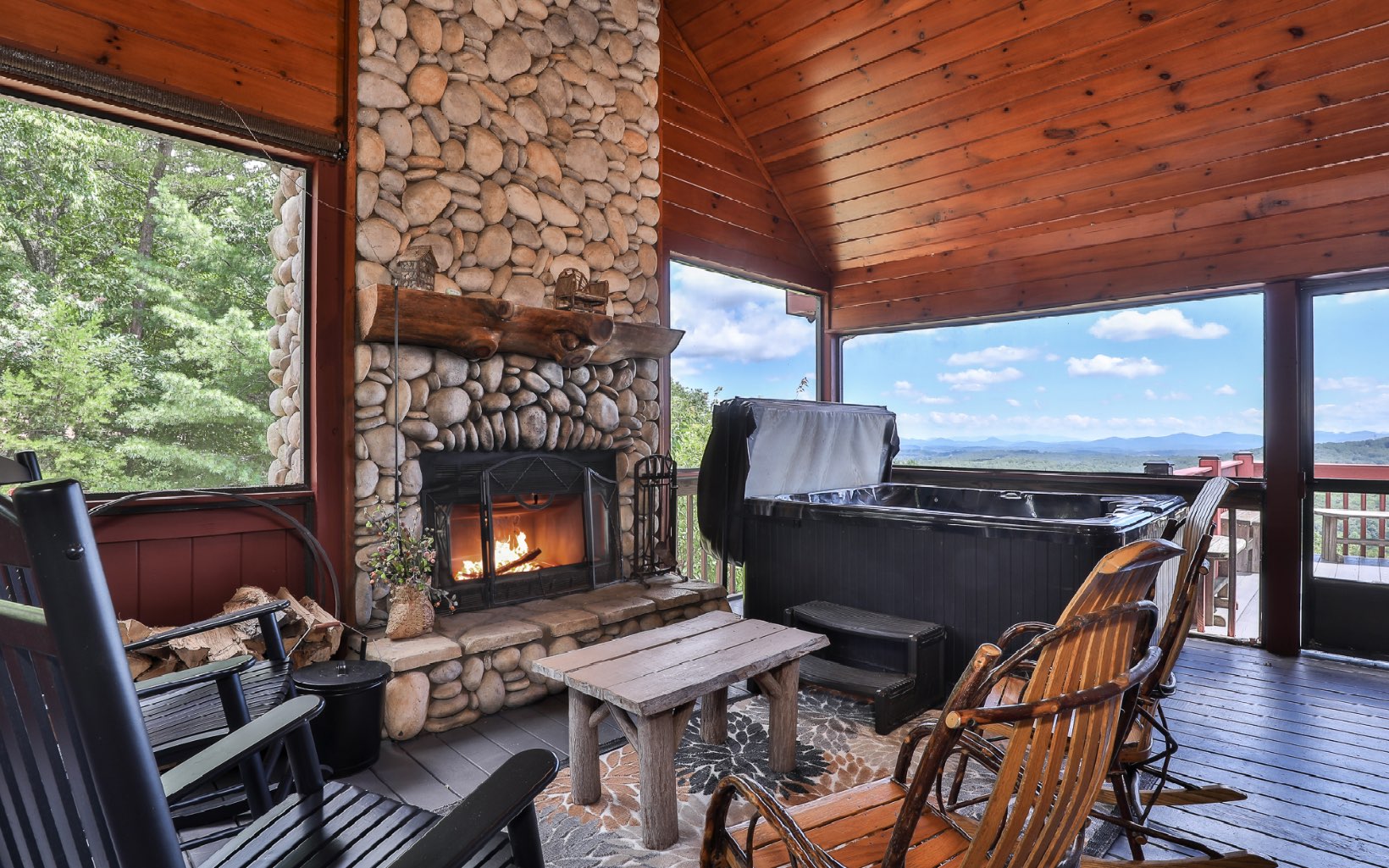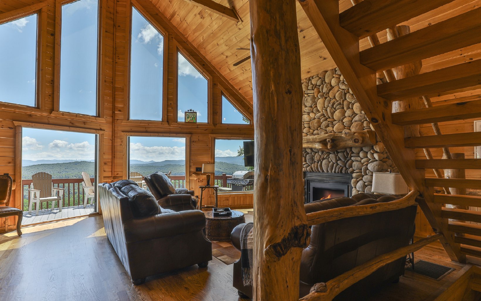 Immerse Yourself in Nature's Majesty: Awe-Inspiring Mountain Vista Awaits. Expansive long-range, layered mountain views will captivate you from several spots in this spectacular cabin located in Blue Ridge on all paved roads. Watch the sunset over the mountains in your hot tub on private screened deck w/ outdoor fireplace or enjoy morning coffee on the large open rear deck. Once inside the open floor plan main level, take in the stunning rock fireplace along w/ custom woodwork & beams, expansive vaulted ceilings, & entire wall of windows to ensure the breathtaking view remains the focal point. Kitchen has plenty of space w/ gorgeous granite counters & breakfast bar. The loft MB is an ideal vantage point for mountain gazing. In the terrace level, find add'l living space w/ tin metal ceilings, stone fireplace, pool table & air hockey, w/ add’l bed & bath. Recent upgrades include: refinished hardwood floors, entire exterior repainted, new water treatment system, washer/dryer, TVs & more! Being sold furnished. Come see today, and wake up to these breathtaking views tomorrow!