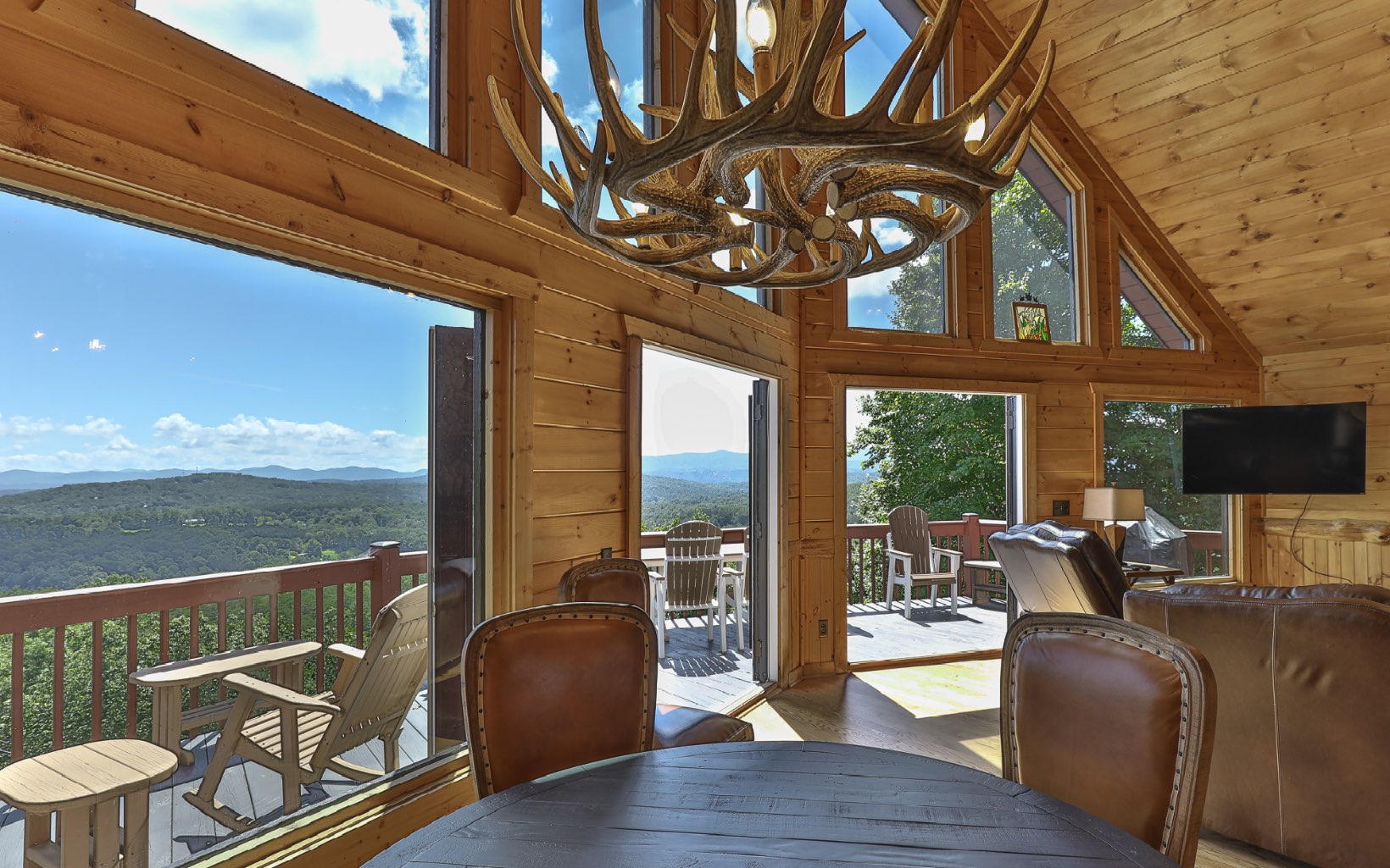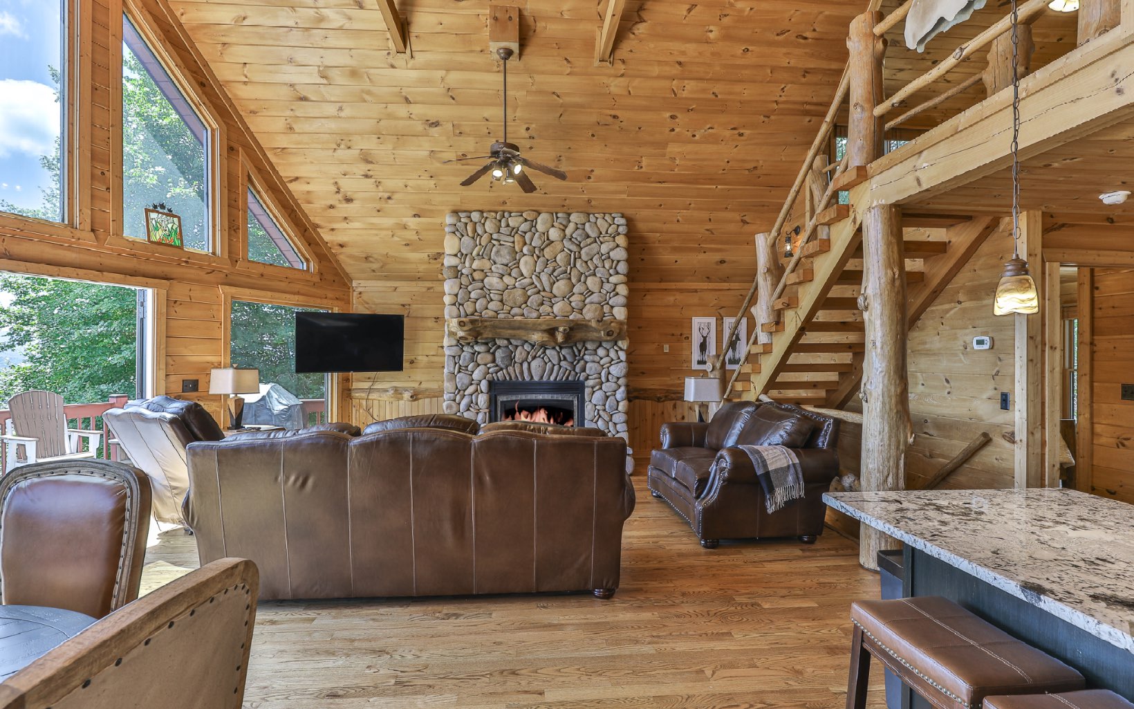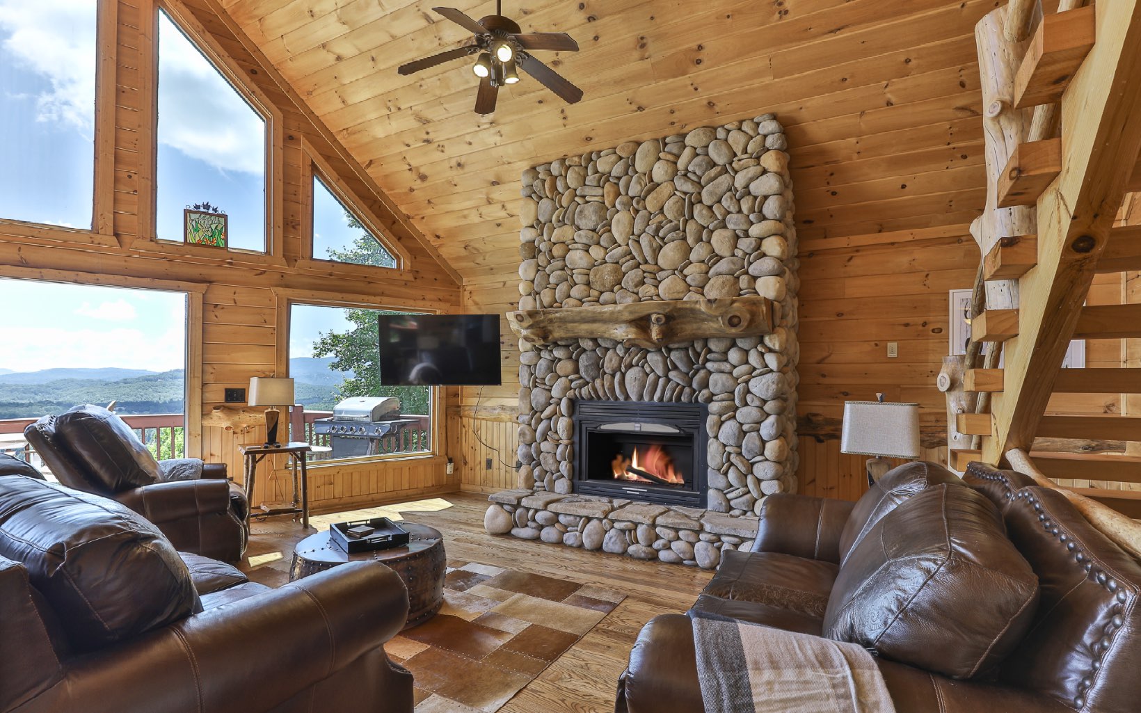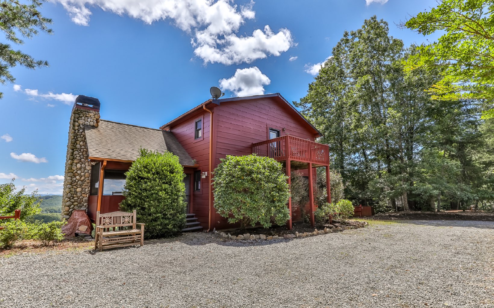 Immerse Yourself in Nature's Majesty: Awe-Inspiring Mountain Vista Awaits. Expansive long-range, layered mountain views will captivate you from several spots in this spectacular cabin located in Blue Ridge on all paved roads. Watch the sunset over the mountains in your hot tub on private screened deck w/ outdoor fireplace or enjoy morning coffee on the large open rear deck. Once inside the open floor plan main level, take in the stunning rock fireplace along w/ custom woodwork & beams, expansive vaulted ceilings, & entire wall of windows to ensure the breathtaking view remains the focal point. Kitchen has plenty of space w/ gorgeous granite counters & breakfast bar. The loft MB is an ideal vantage point for mountain gazing. In the terrace level, find add'l living space w/ tin metal ceilings, stone fireplace, pool table & air hockey, w/ add’l bed & bath. Recent upgrades include: refinished hardwood floors, entire exterior repainted, new water treatment system, washer/dryer, TVs & more! Being sold furnished. Come see today, and wake up to these breathtaking views tomorrow!