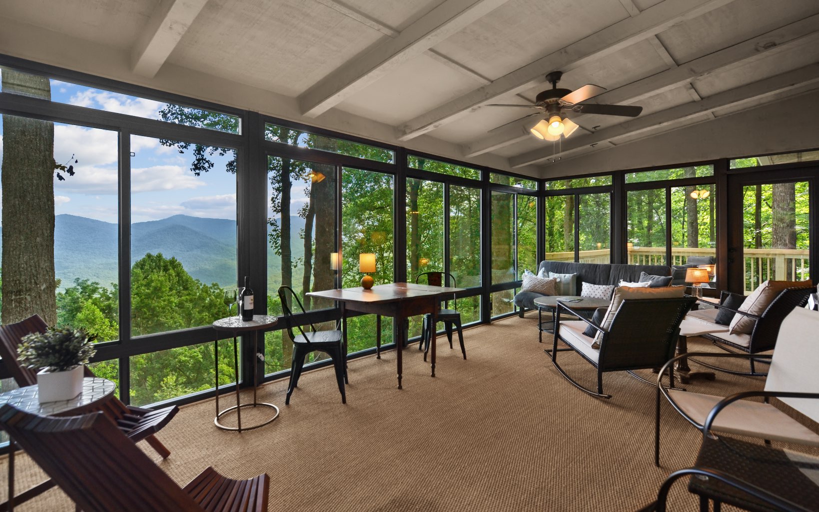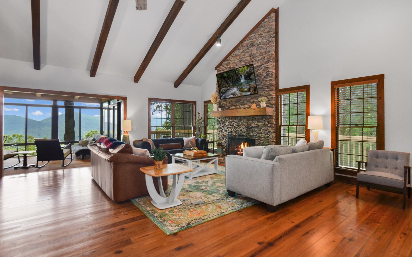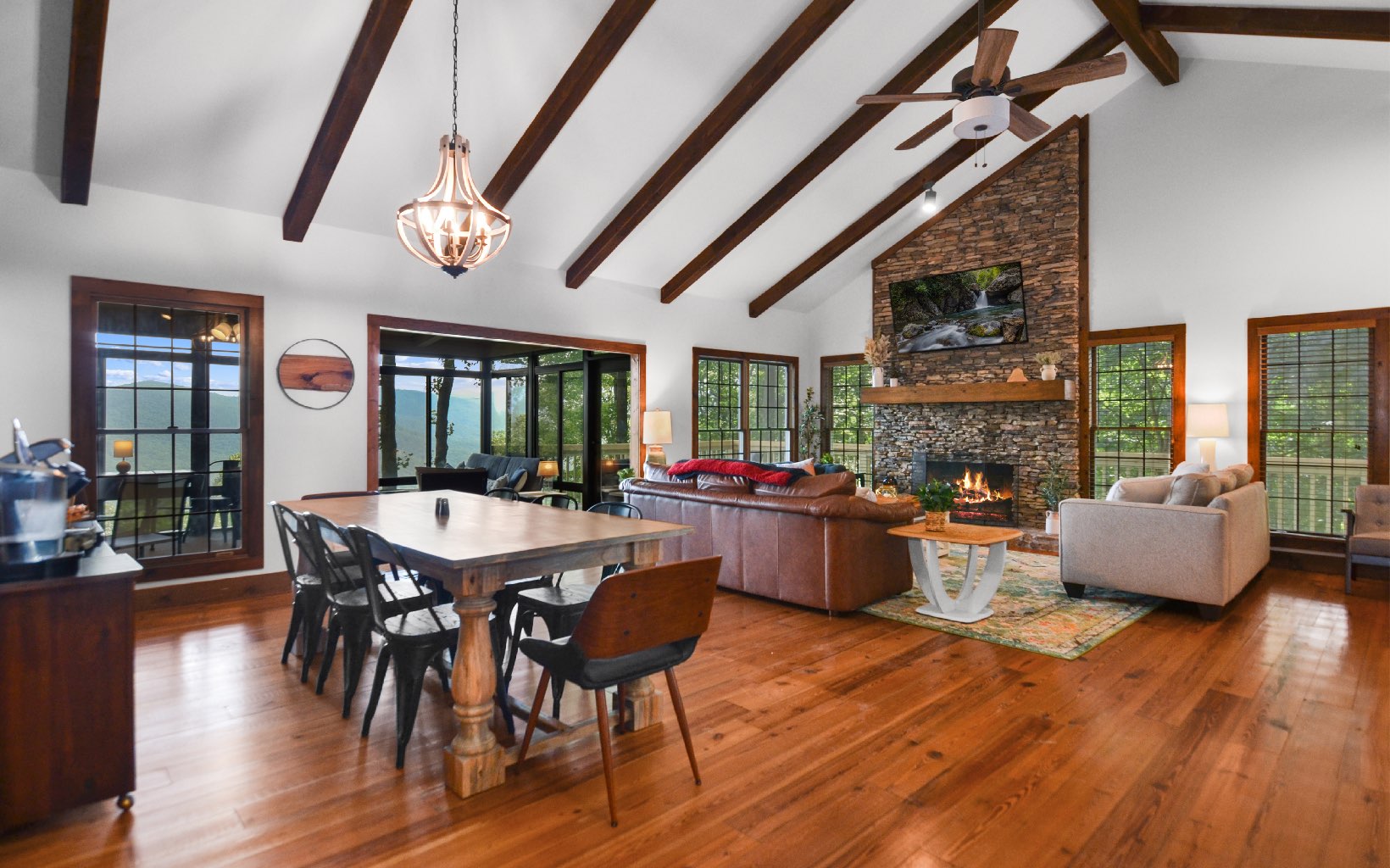 Get ready to be amazed by this extraordinary property that rests on the Ridge, offering breathtaking million-dollar long-range mountain views all year round. ALL NEW FURNISHINGS AND FURNITURE. This stunning custom home, crafted by a renowned North Georgia builder, exudes rustic elegance and charm. The unique blend of rough-edged wood, expansive windows, soaring ceilings in the great room, exposed beams, sheetrock walls, a striking stacked stone fireplace, and wide plank flooring creates a captivating ambiance that is both cozy and awe-inspiring. Designed with the comfort of your family and the enjoyment of your friends in mind, this home boasts ample space for entertaining. With three en suite bedrooms, everyone can experience the luxury of their own private retreat. The property further impresses with its thoughtful design, featuring two driveways for added convenience and accessibility. Enjoy serene lakes, a community pool for relaxation, tennis courts for friendly matches, picturesque trails for leisurely walks, and the soothing sounds of Turniptown Creek. List of improvements in documents.