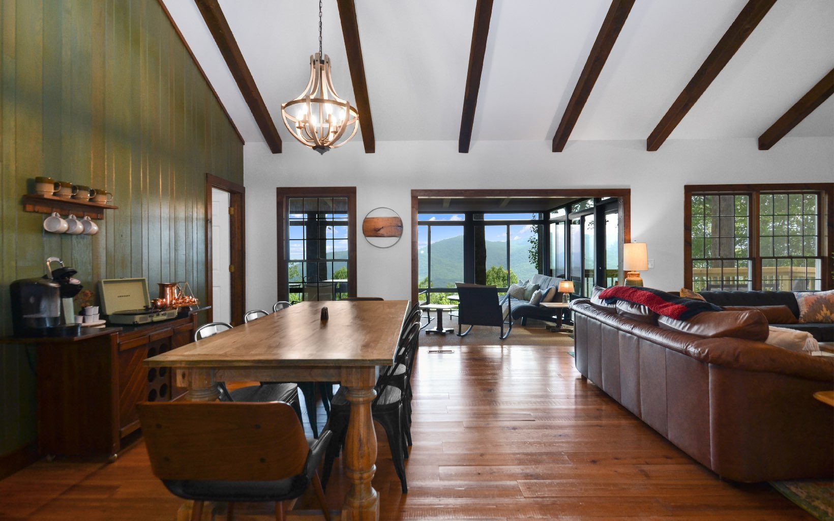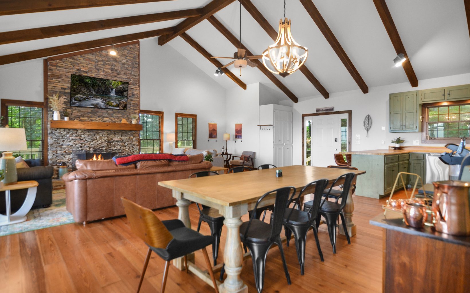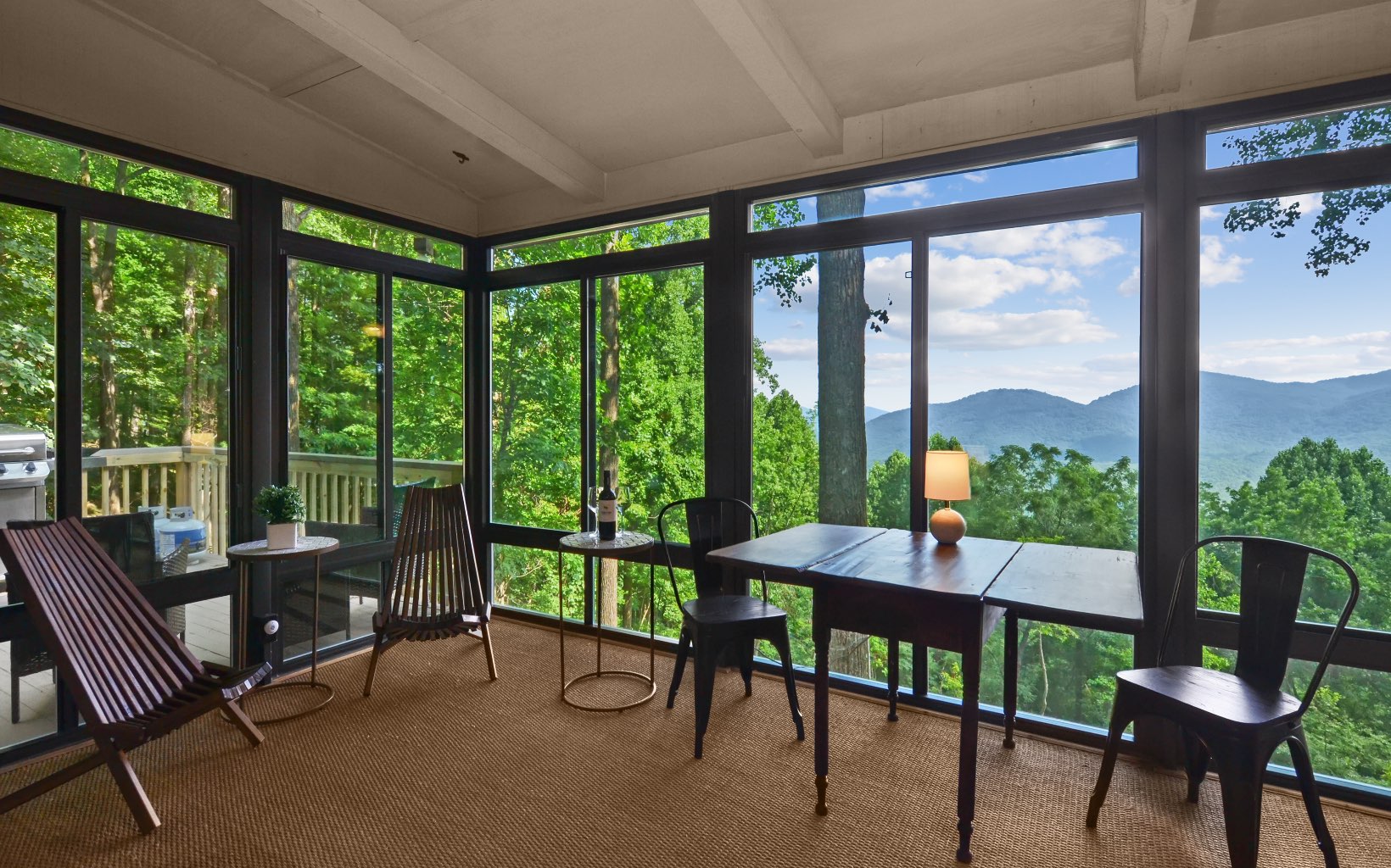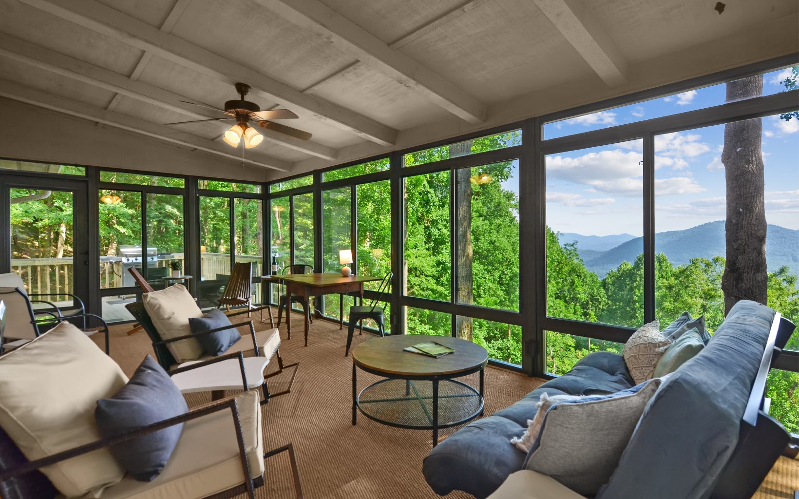 Get ready to be amazed by this extraordinary property that rests on the Ridge, offering breathtaking million-dollar long-range mountain views all year round. ALL NEW FURNISHINGS AND FURNITURE. This stunning custom home, crafted by a renowned North Georgia builder, exudes rustic elegance and charm. The unique blend of rough-edged wood, expansive windows, soaring ceilings in the great room, exposed beams, sheetrock walls, a striking stacked stone fireplace, and wide plank flooring creates a captivating ambiance that is both cozy and awe-inspiring. Designed with the comfort of your family and the enjoyment of your friends in mind, this home boasts ample space for entertaining. With three en suite bedrooms, everyone can experience the luxury of their own private retreat. The property further impresses with its thoughtful design, featuring two driveways for added convenience and accessibility. Enjoy serene lakes, a community pool for relaxation, tennis courts for friendly matches, picturesque trails for leisurely walks, and the soothing sounds of Turniptown Creek. List of improvements in documents.