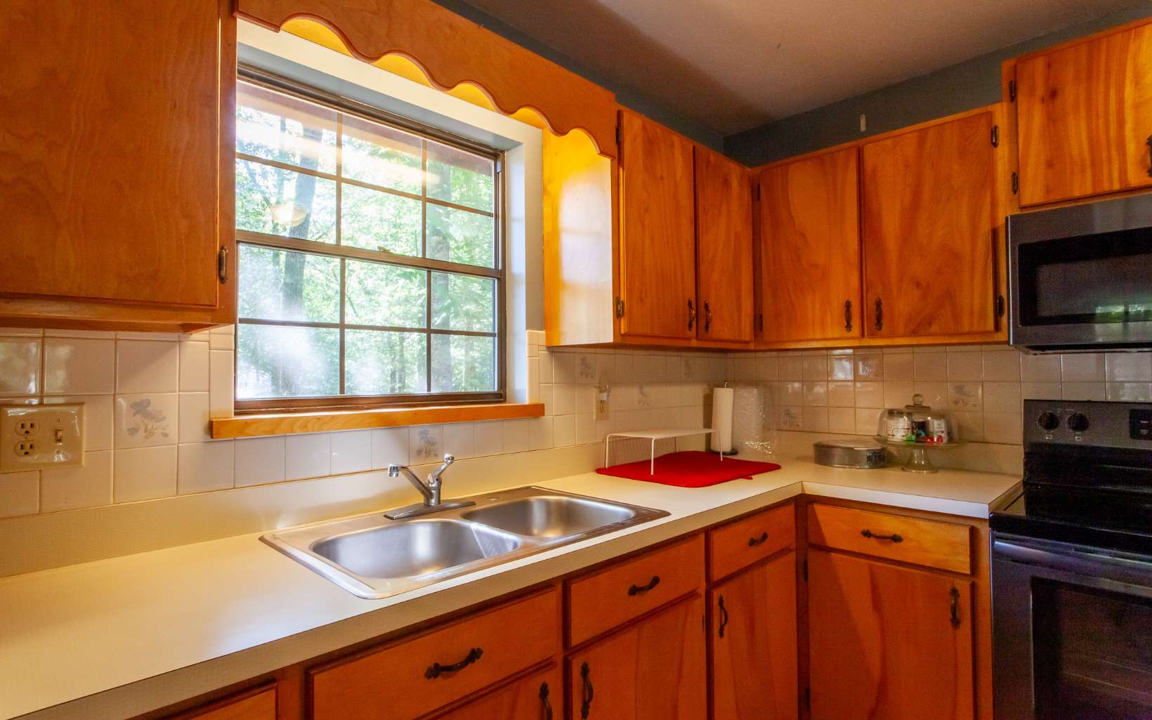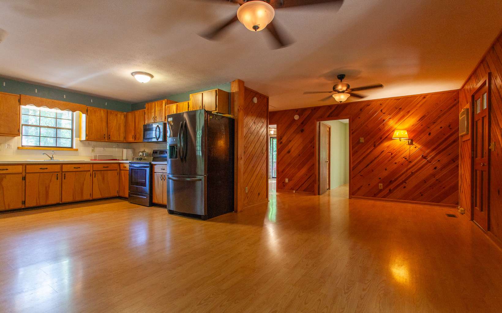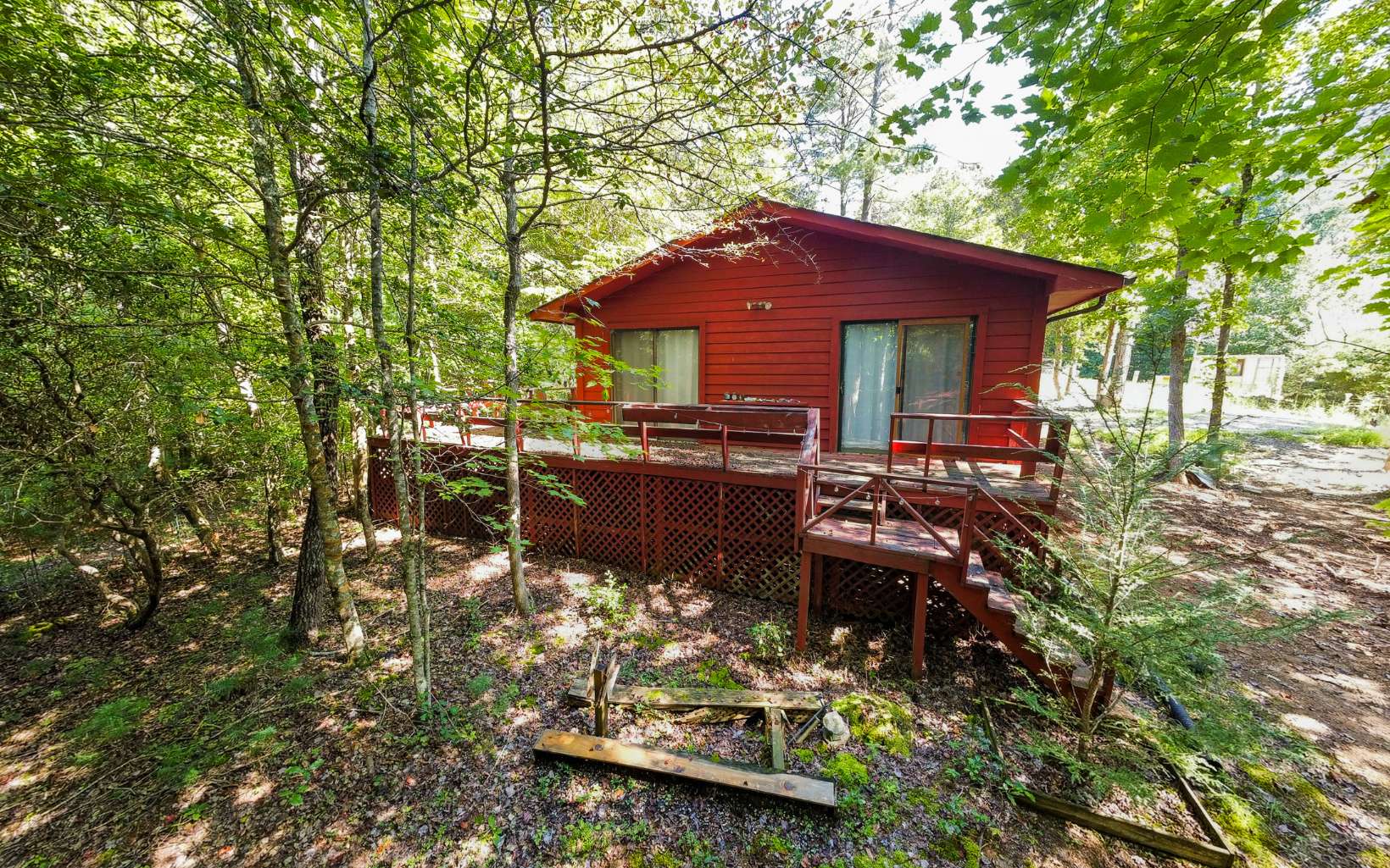 FIBER OPTIC INTERNET, NEW APPLIANCES, & close proximity to town! Warmly rustic exterior, private wooded setting, full-length deck wraps around two sides, storage building for tools, and oversized enclosed carport (would make a great guest house) are only part of the multiple options here! Gardener’s paradise with room for flowers and plants, and birdwatching made easy with houses in place for feathered friends. Wood walls and accents are striking in the open plan kitchen and adjoining living room with welcoming stone fireplace and hearth. Bedrooms offer sliding door access to the outside; centrally located laundry alcove makes chores a breeze. Come ready with your best decorating ideas and have a ball!