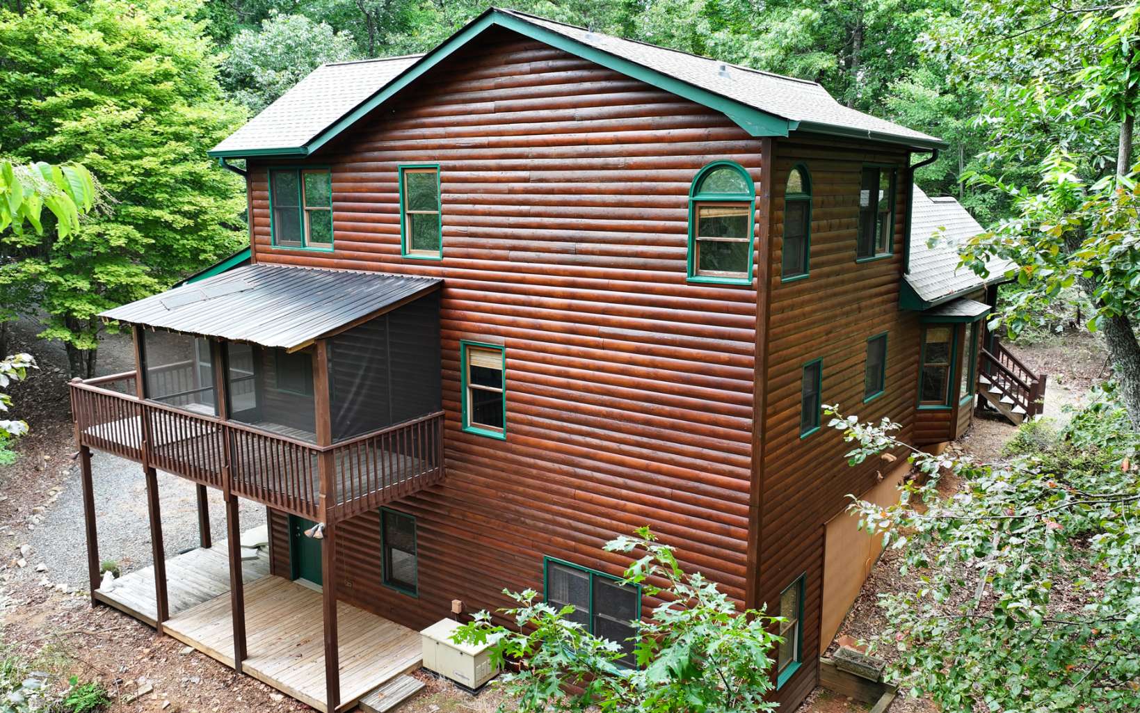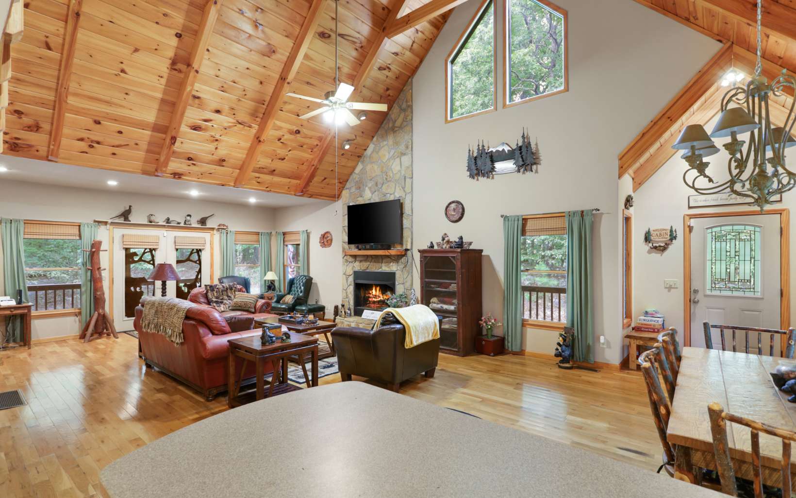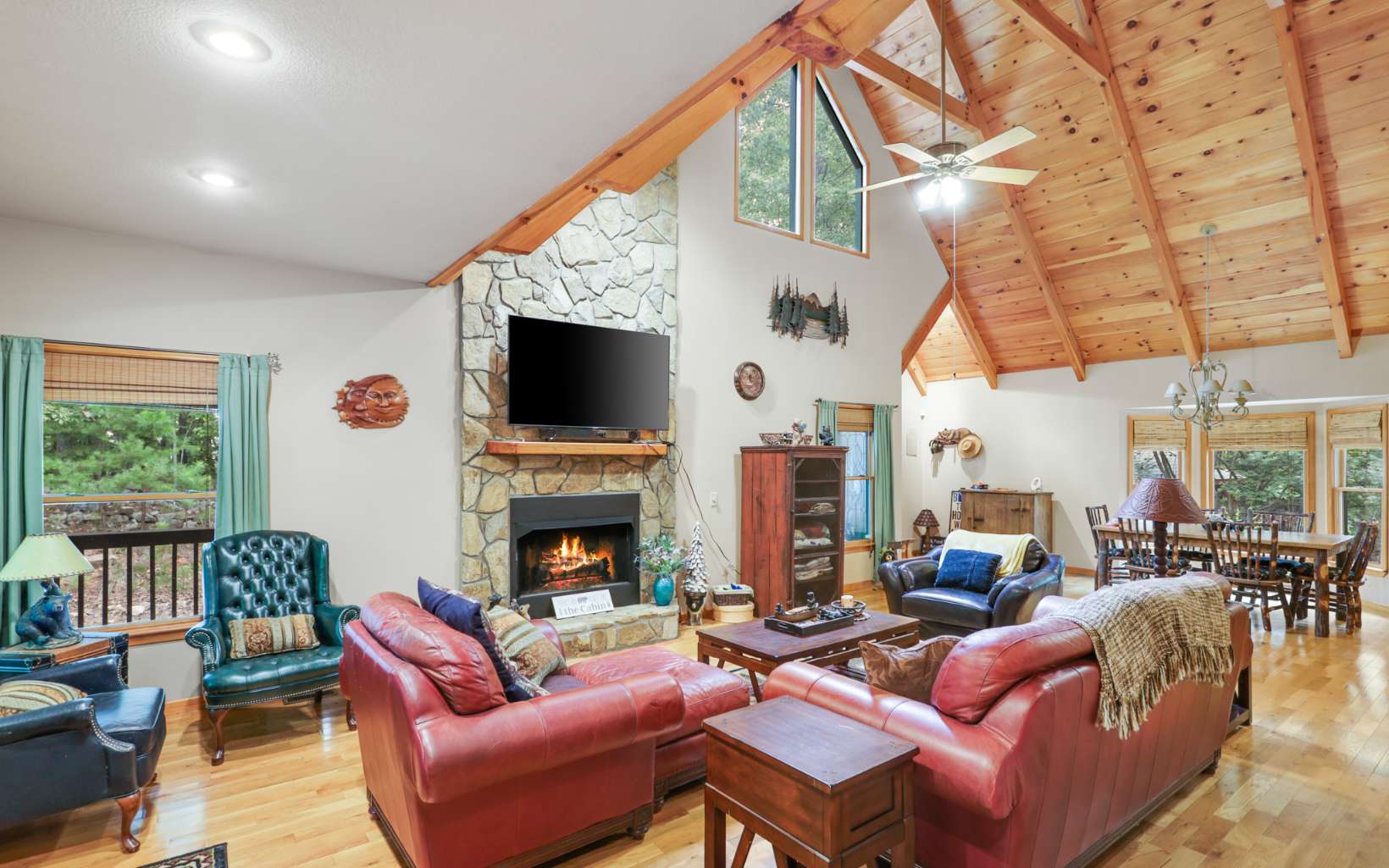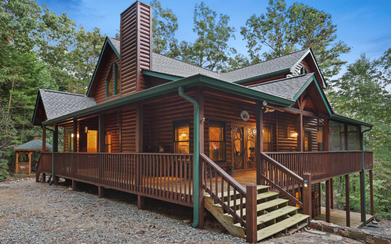 Ultimate private mountain escape on 3.7 acres- bordering USFS! Hard to find completely private mountain getaway tucked at the end of all paved roads, yet close to downtown Blue Ridge and Lake Blue Ridge! Well maintained 3 bedroom plus loft with open concept floor plan, chefs kitchen with dedicated dining. Inviting hardwood floors and beautiful wood ceilings mixed with just the right combination of light interiors highlight the oversized great room with massive floor to ceiling stone fireplace. Primary bedroom on main level with amazing access to wraparound and screened porch. Peaceful setting and professionally landscaped with comfortable outdoor spaces and plenty of parking perfect for large gatherings. Usable lot with easy terrain to hike the USFS makes this one a must see. No neighbors in sight and year round long range views available with some vista trimming! Perfect for full time living, or just your own private mountain oasis – exceptional short term rental potential.