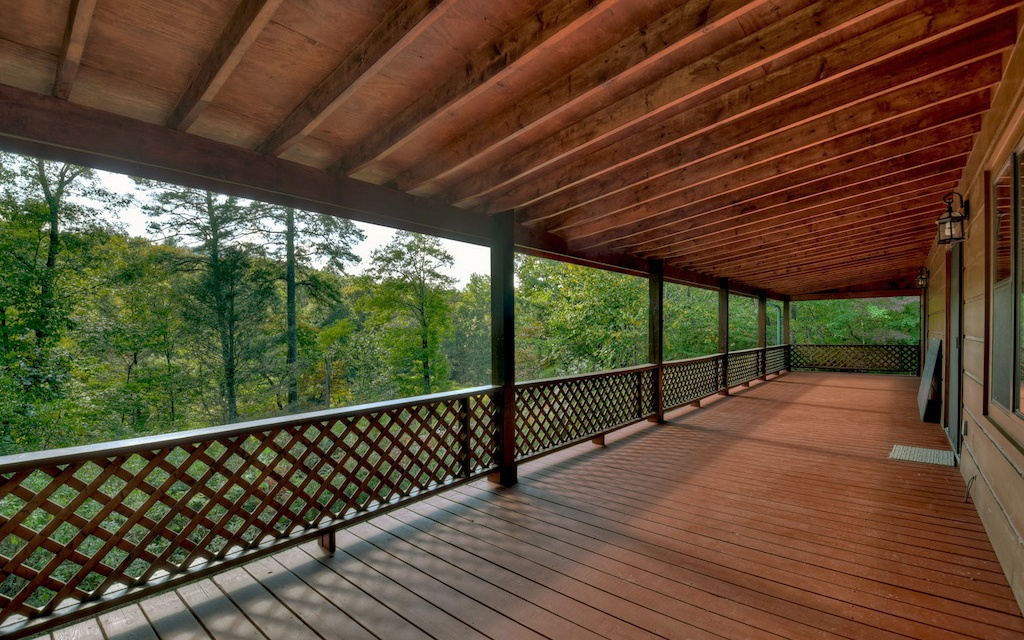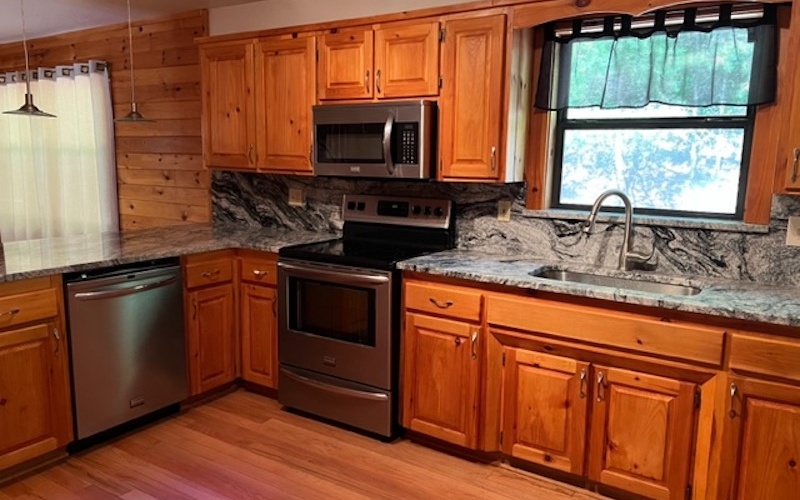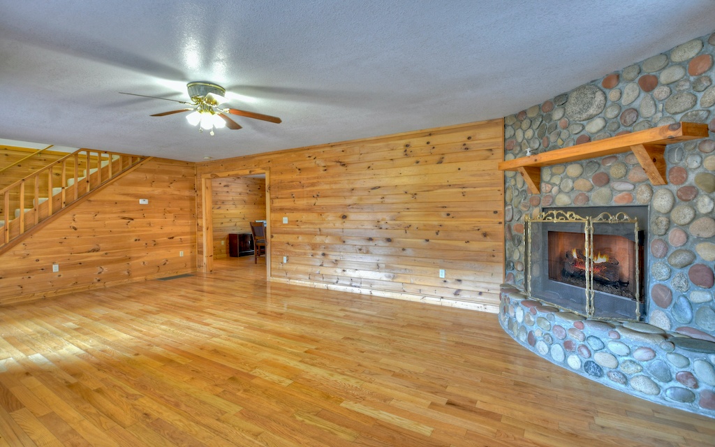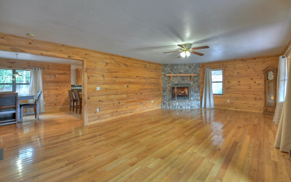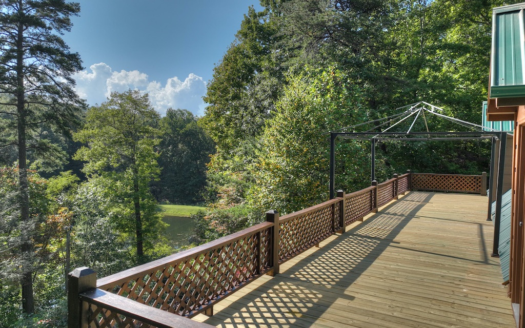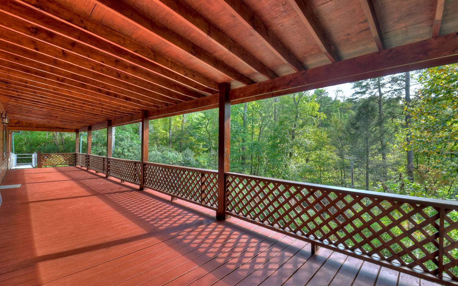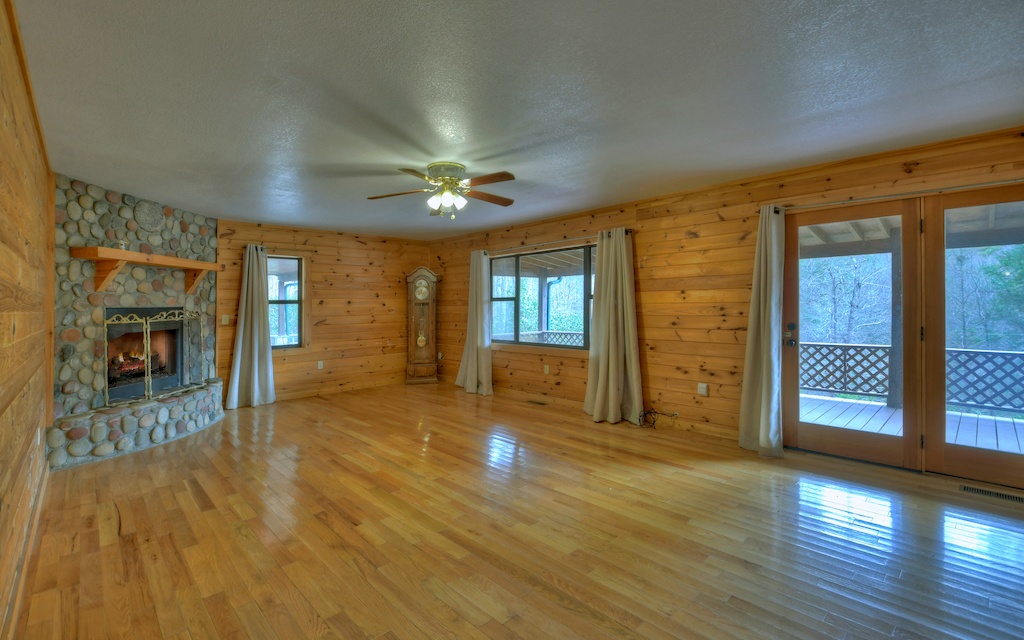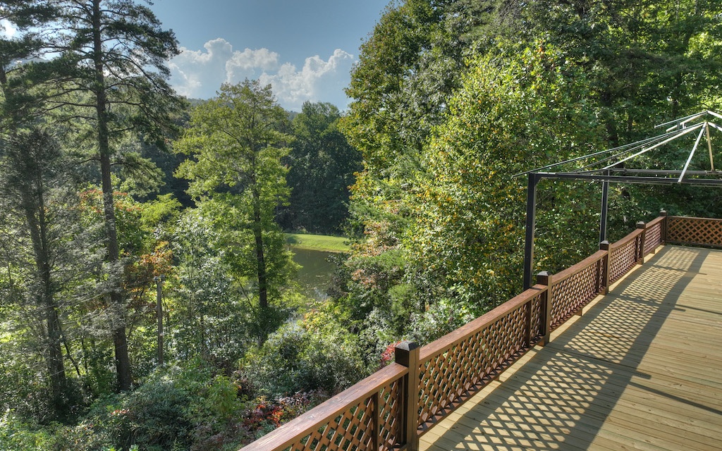 This 5 bedroom, 3 full bath chink log cabin has TOTAL privacy! The main level has beautiful oak floors throughout, LR w/fireplace (unvented w/gas logs), DR, spacious Kitchen with NEW GRANITE COUNTERS, plenty of cabinets, bar, Stainless refrigerator, range, microwave, & dishwasher, and Main BR & BA (jacuzzi tub, 2 sinks, separate shower, NEW GRANITE COUNTERS); the Upper floor houses two very spacious BRs & BA (2 sinks, shower/tub combo); Terrace level - 2 BRs & BA (2 sinks, shower/tub combo) and two nice Bonus Rooms (Den, Game Room, Office, Theatre Room, etc, or anything your family wants). HOME HAS JUST BEEN RESTAINED. There is a seasonal mtn and lake view & porches for you to enjoy all year long. Extras include metal roof, fire pit, 2-car carport, small creek on property, 2 laundry rooms & gated community. Rentals are allowed (both short term and long term).