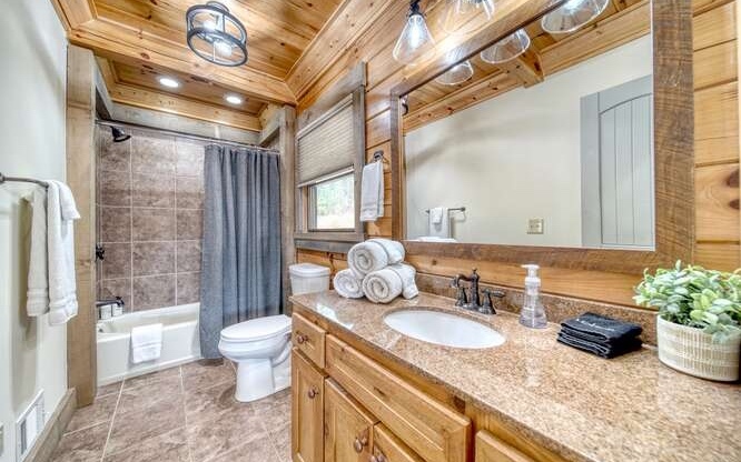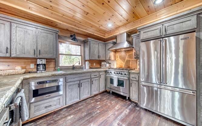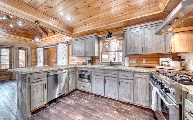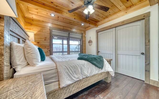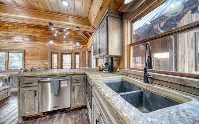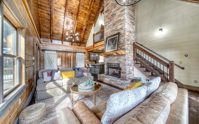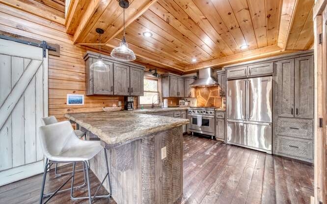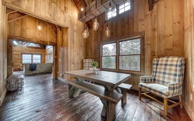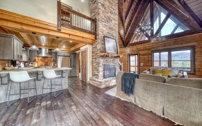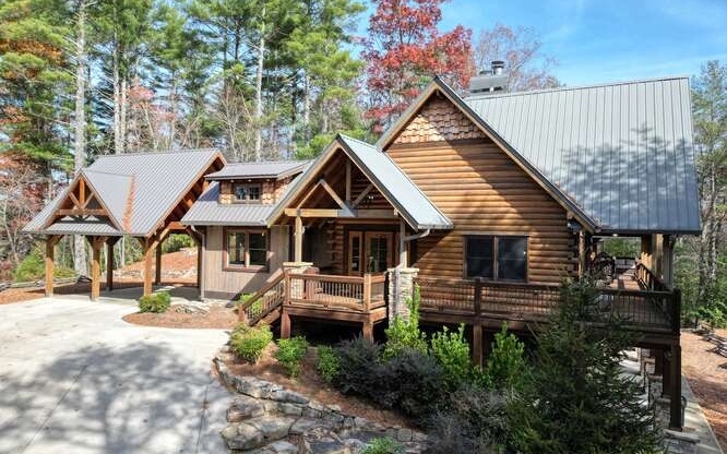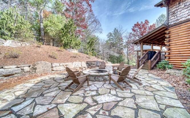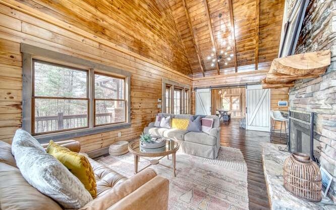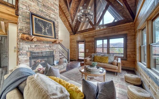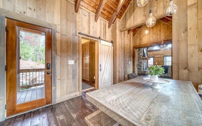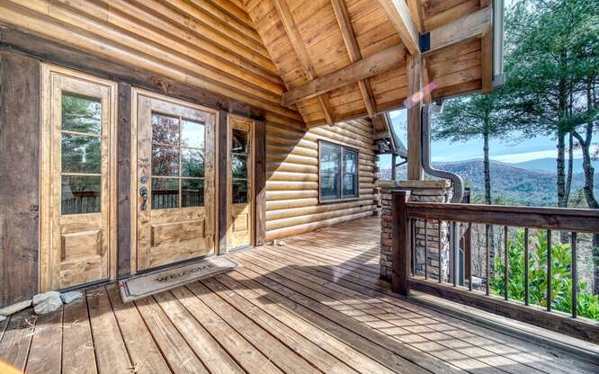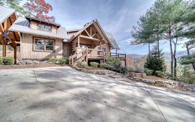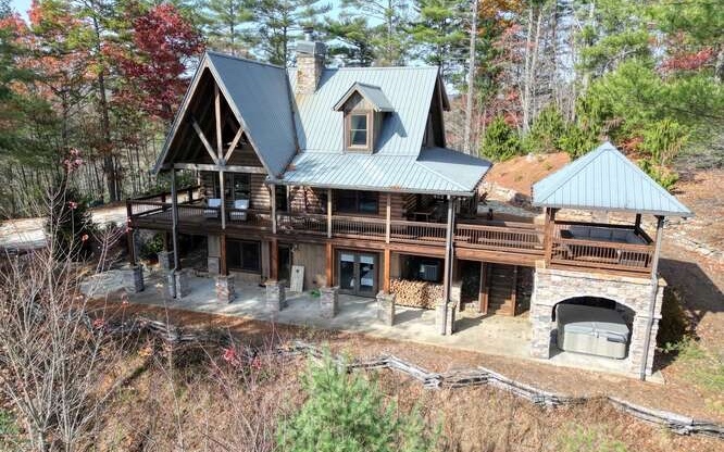 This Gorgeous Rustic RENTAL Cabin offers STUNNING LAYERED MTN VIEWS and is conveniently located just minutes away from Downtown Blue Ridge and Ellijay. With 3 bedrooms and 3.5 bathrooms, this cabin provides ample space for comfortable living. Stainless steel appliances bring a modern touch to the kitchen, while the 100-year-old barn time ceiling and cedar shakes maintain the authentic feel. Additionally, you'll find rock countertops, hand-hewn floors, and custom barn doors that add to the rustic charm of the home.The outdoor living space of this cabin is truly remarkable, with a 2-story gazebo featuring an inlay compass, perfect for entertaining guests. The wrap-around deck allows you to enjoy the beautiful scenery at any time of the day. The cabin also boasts a private gated entrance with a concrete drive, ensuring both security and convenience. A boulder retaining wall adds to the custom design, making this home truly unique and impressive. Don't miss out on the opportunity to own this stunning Rustic Cabin with its wow factor.