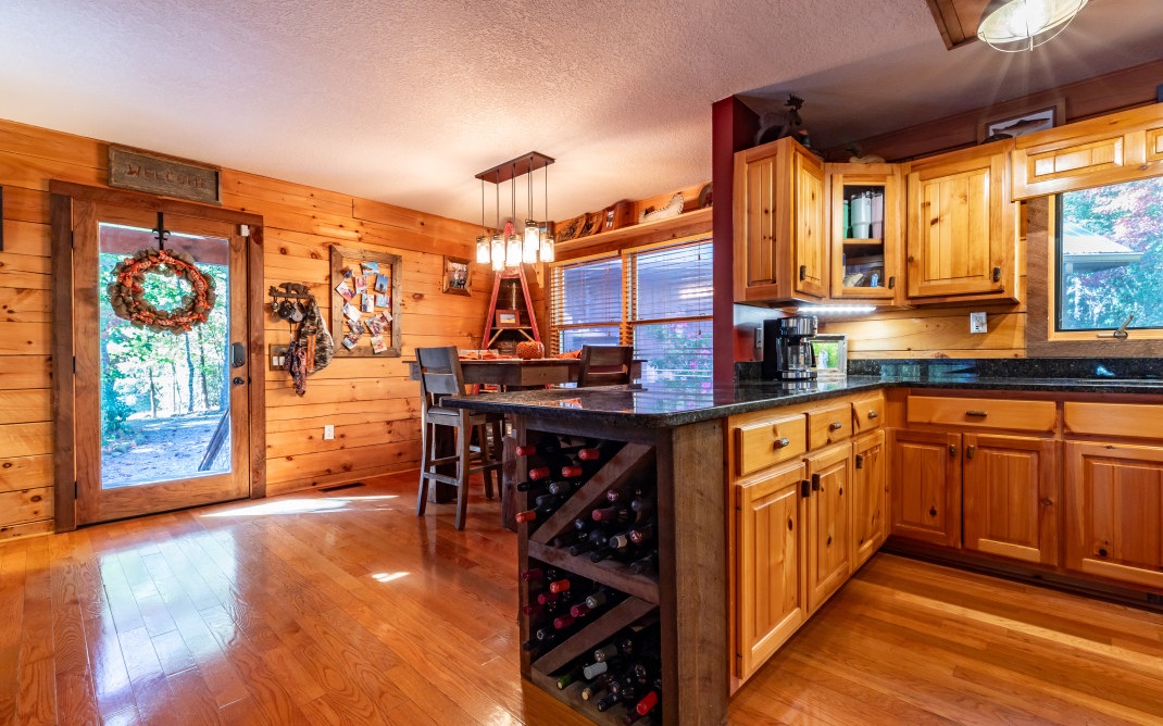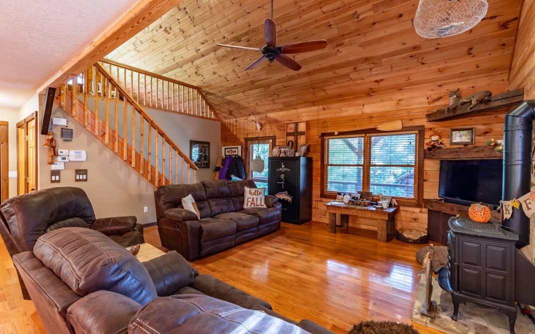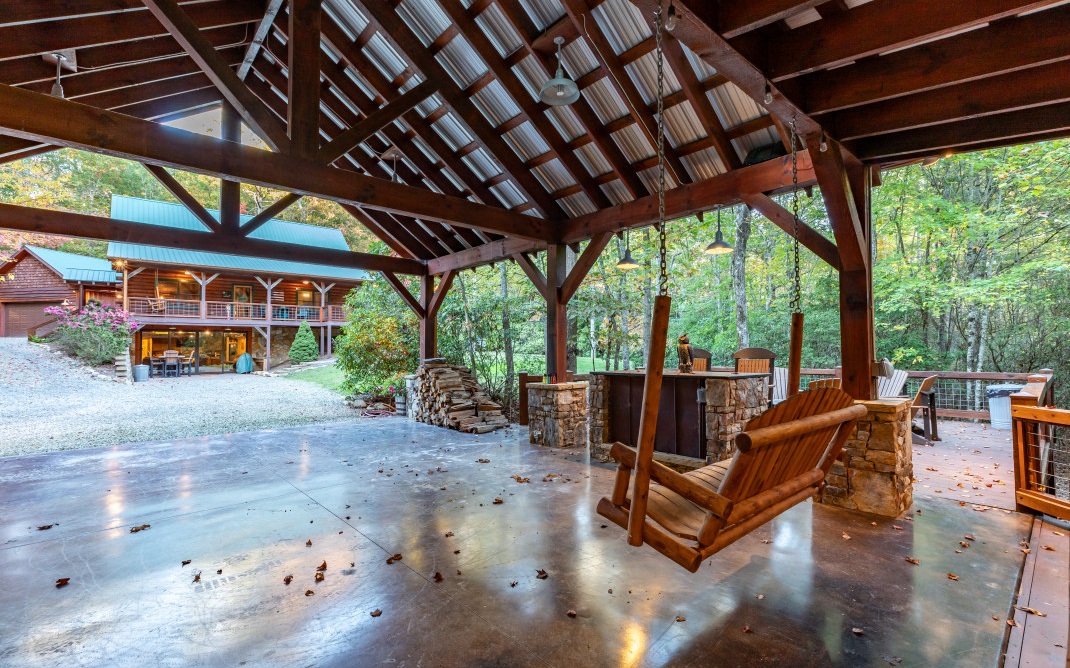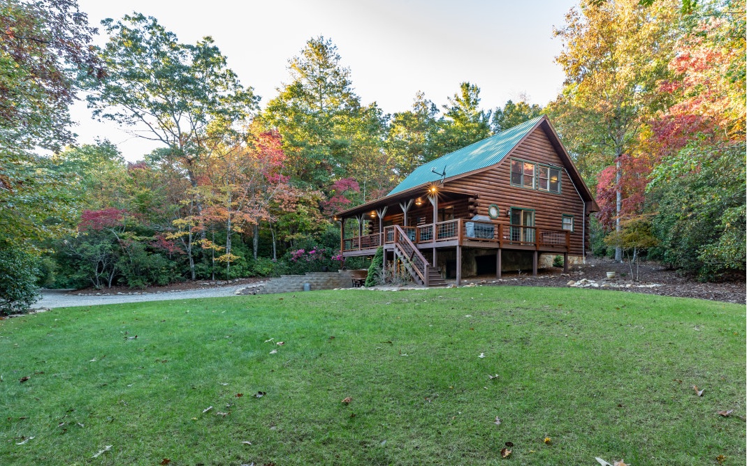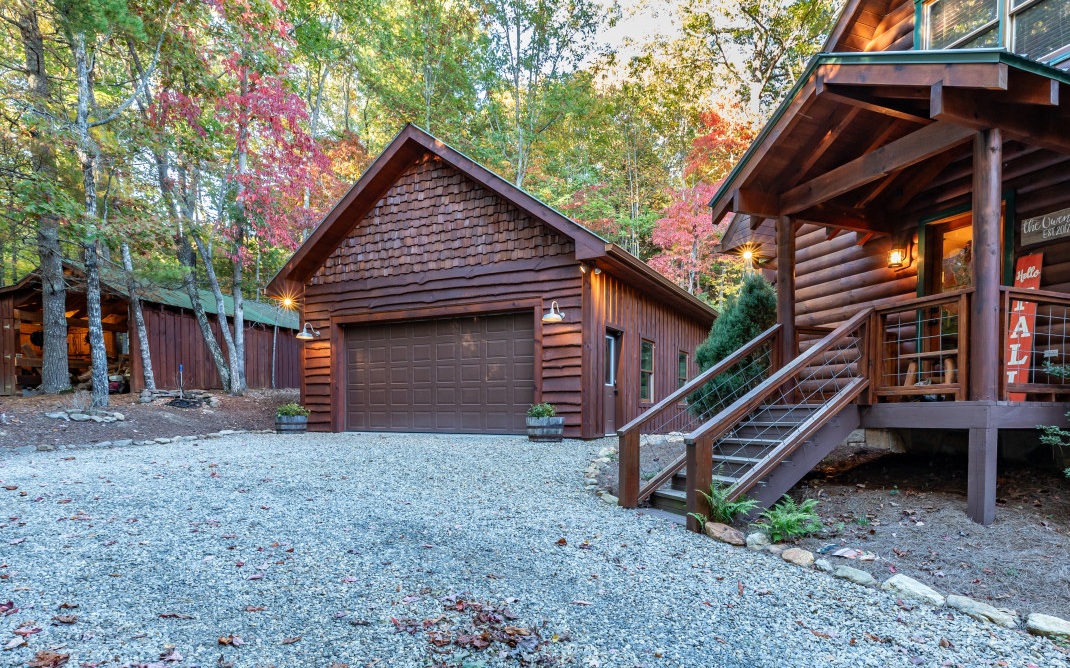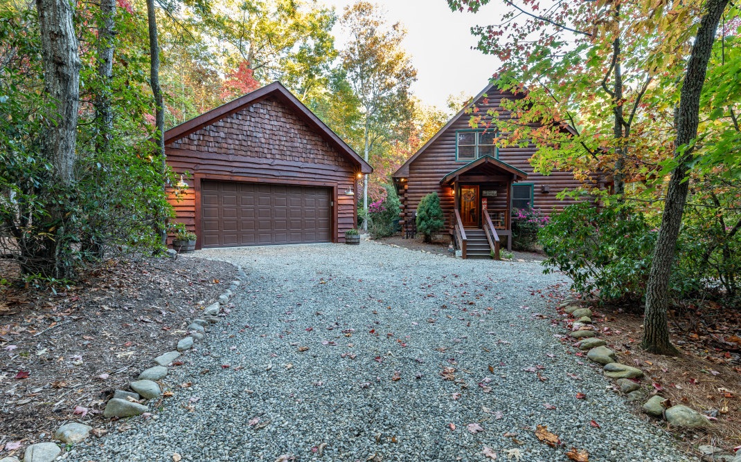 Step foot onto this property and you IMMEDIATELY feel at home w/ space for everything PLUS lots of room for hanging out both inside & out! 1 BR/1 full BA on main AND upper levels for privacy plus half BA on terrace level. Circular drive nestled by mountain laurel, separate 2-car garage w/ storage above (w/ electric), & barn. Main floor features primary BR w/ ensuite, lots of closet space, & step-in shower. Vaulted LR w/ gas FP & wood stove. Spacious kitchen w/ granite c-tops, S/S apps, gas stove, peninsula w/ wine rack. Huge upper level w/ vaulted loft BR, full BA, & loft hangout space. Terrace level—your FAVORITE level—has den hangout equipped w/ a gas FP, bar area w/ granite c-top, lg copper sink, & wall of glass doors to let in the sun! Plus bonus room, half BA, & storage room. HUGE covered pavilion w/ outdoor kitchen & plenty of room to entertain! Property borders USFS & creek.