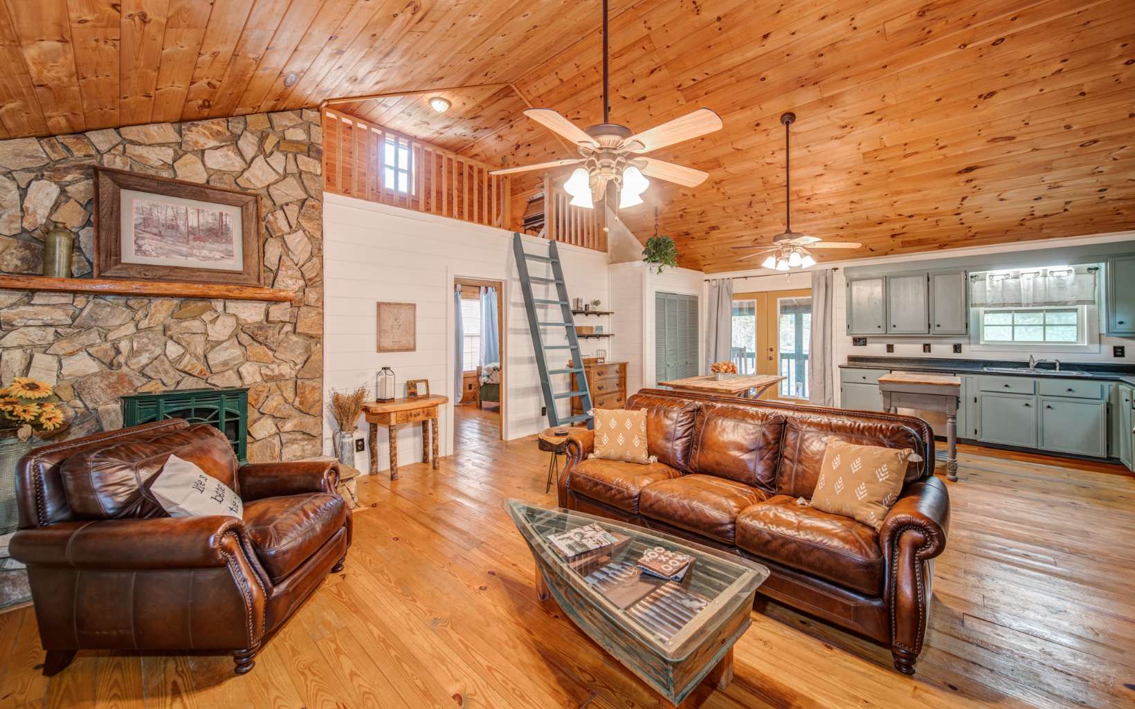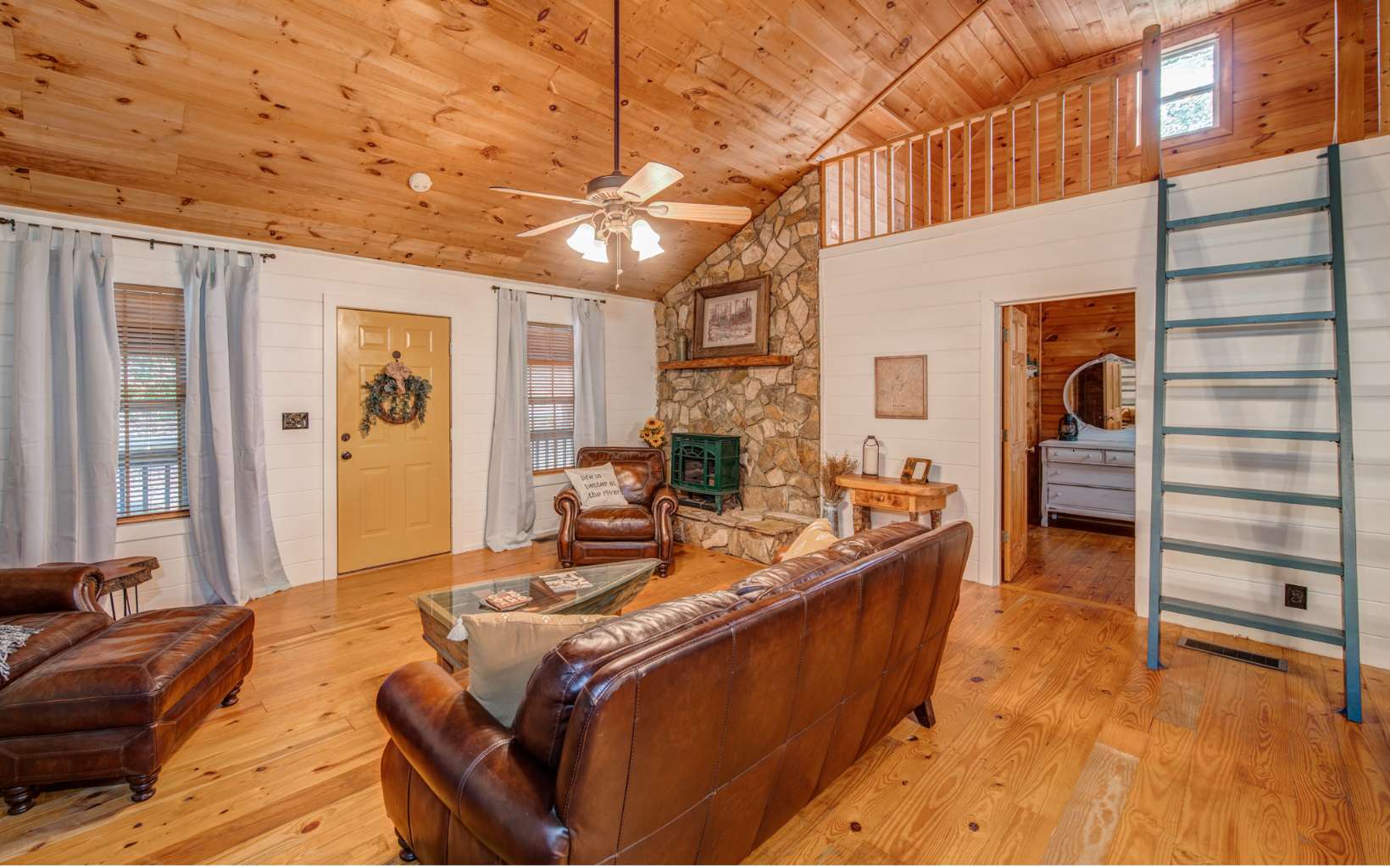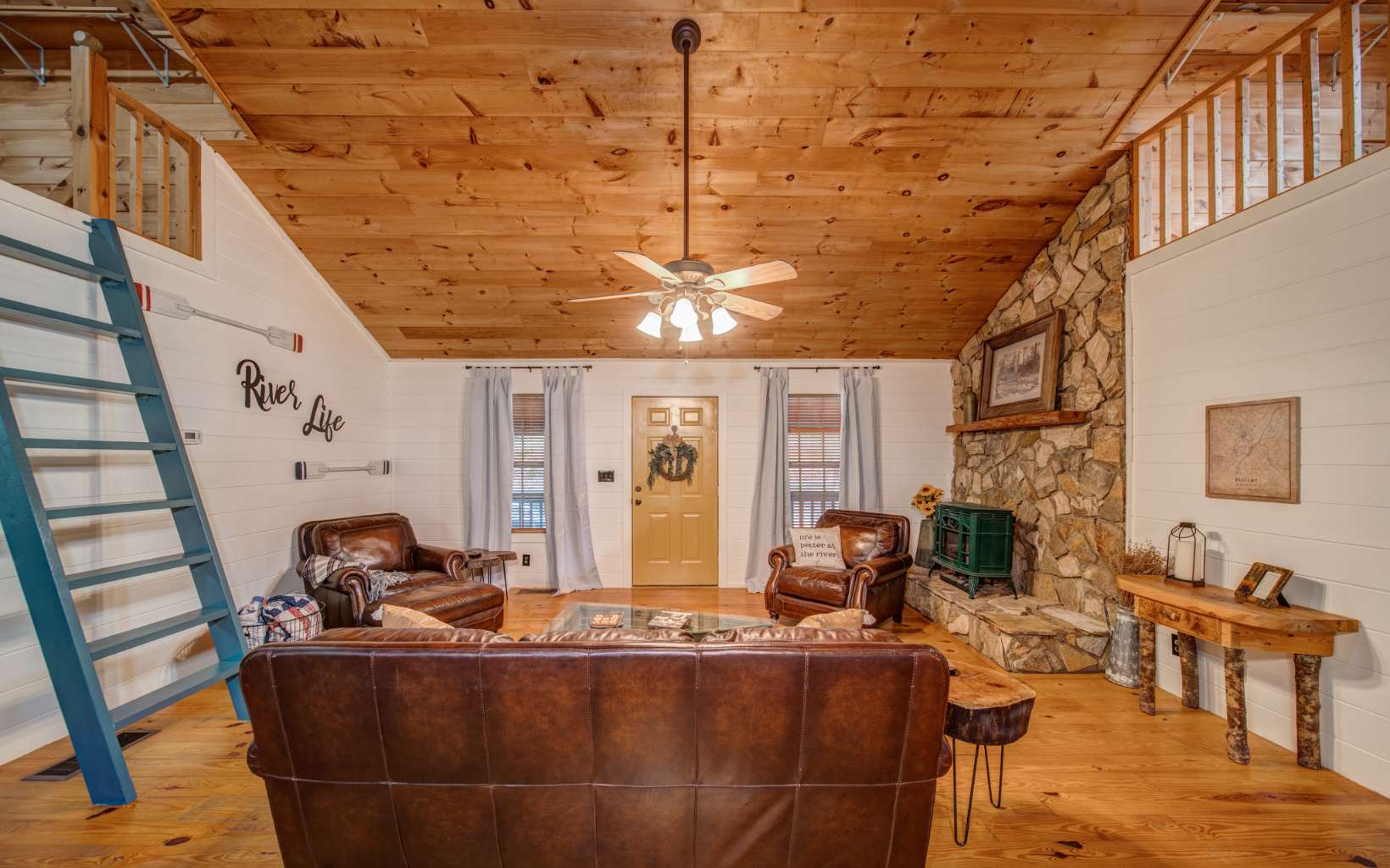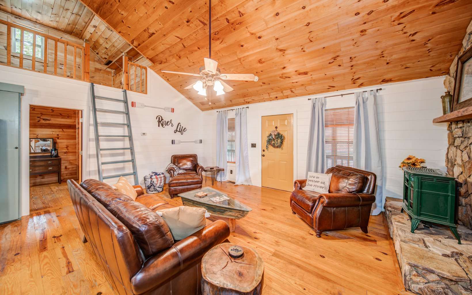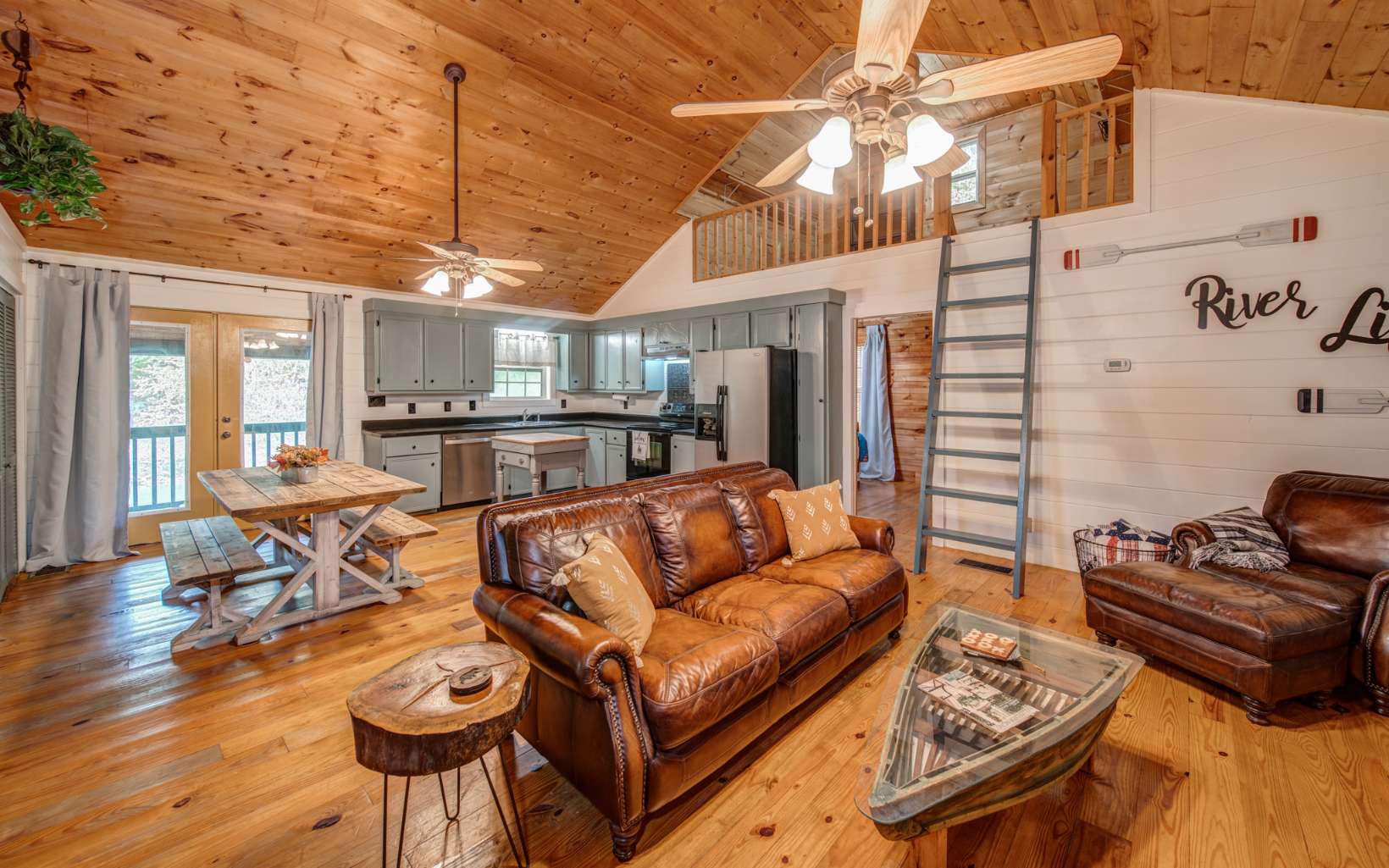 Embrace the River Life! Welcome to 215 Newport Drive within Ellijay's Coosawattee River Resort. Whether you're seeking a permanent residence or a vacation rental, this charming home is ideally situated just inside the gate on Legion Road, offering quick access to downtown Ellijay's shops and restaurants. Step inside to discover a spacious Great room featuring rustic pine floors and soaring vaulted ceilings, the perfect space for quality time with friends and family. This home boasts dual Master bedrooms with en-suite bathrooms on either side, each with a loft area above, suitable for use as a guest bedroom, office, craft space, and more. French doors in all living areas open to reveal breathtaking views and provide direct access to the serene Coosawattee River. Imagine sipping your morning coffee on the screened back porch, observing wildlife grazing and ducks gracefully swimming by – a picturesque start to your day. In the evenings, relish moments by the fire pit area, surrounded by dancing lights reflecting off the tranquil waters. Set on a level, one-acre riverfront property, this home is a haven for creating cherished memories. Don't miss the opportunity to make it yours, as properties like this are in high demand. Coosawattee offers 4 gated entrances, allows short term rentals and includes tons of amenities including indoor/outdoor pools ,fitness center, parks, river access, tennis courts, pickleball and more.