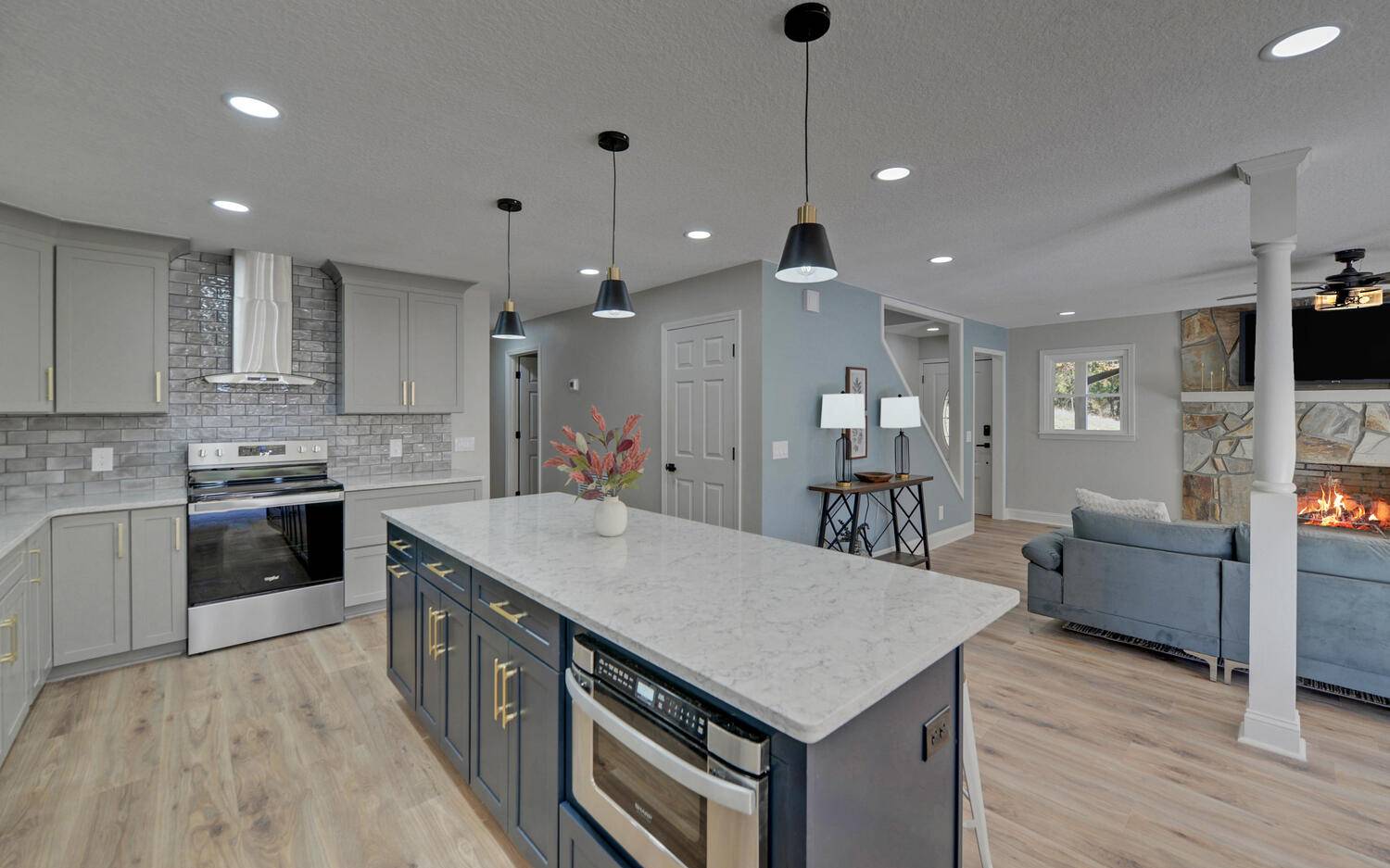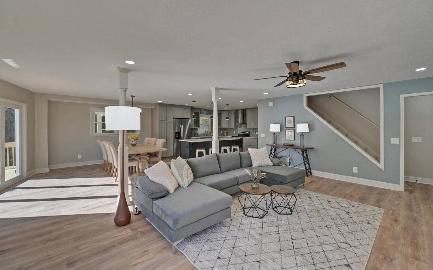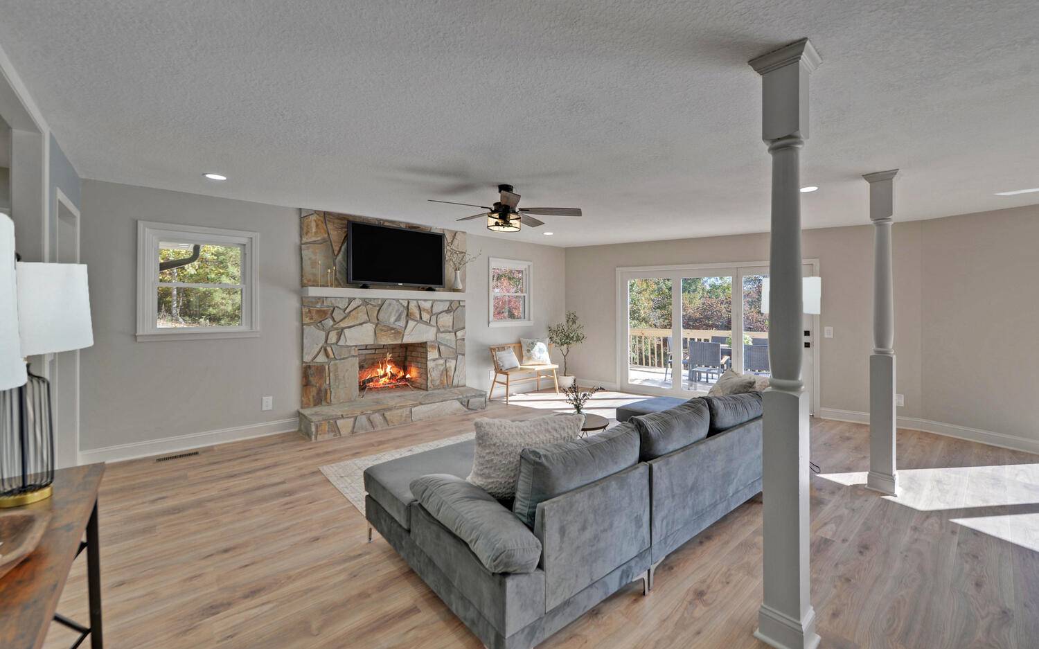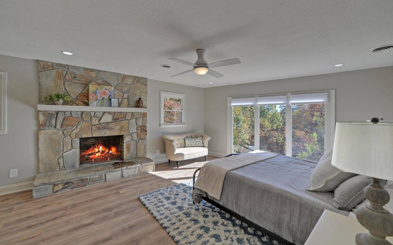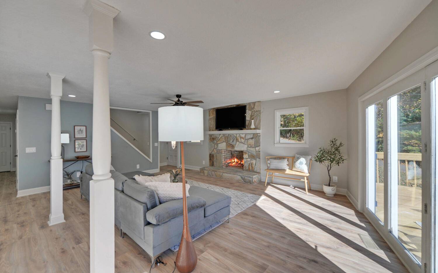 GOLF COURSE COMMUNITY Spectacular newly remodeled home in the latest style and color.This home features a spacious living room opened to the kitchen, nice stone fireplace, windows across the front with a large deck. Plenty of space for entertaining a number of guest. Laundry, Bedroom and bath on main, while upstairs offers 3 bedrooms, a very spacious master, 2 closets, cozy rock fireplace, lots of windows for a fantastic year round view. Master Bath is tile w/tile shower, soaking tub, double sinks. Home has 2 new heating and air units, new roof, windows throughout, garage door, new flooring and paint throughout. Totally new kitchen, and bathroom. Full length Sunroom. Ideal for reading area, or summer plant protection from the winter weather. Same as a NEW HOUSE. Garage is large enough for a number of cars, craft room, work shop, etc. Also, plumbed for bathroom. Spacious Patio area for firepit flower gardening, etc.
