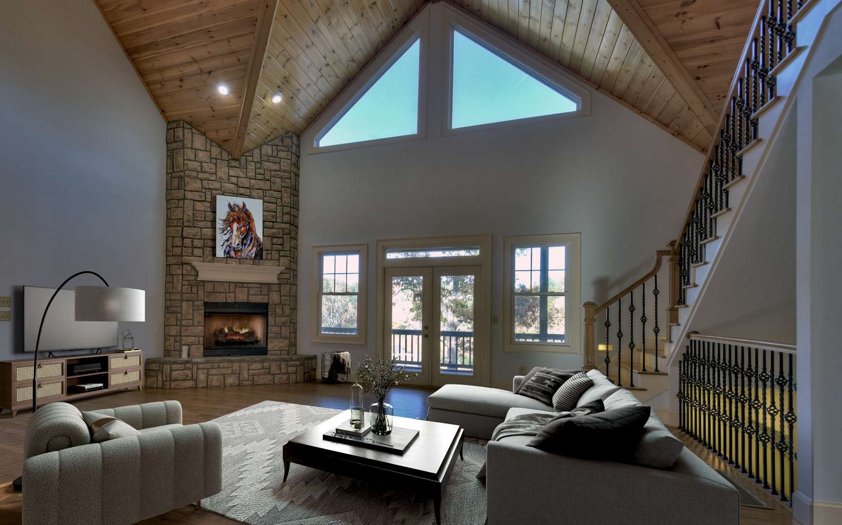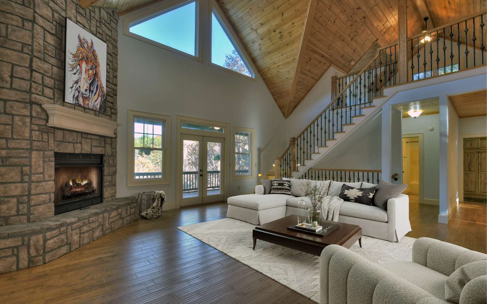 Beautiful mountain home perfectly situated above the Ellijay River with RIVER, MOUNTAIN & PASTURE VIEWS. You can see & hear the river from the 2 oversized porches. Great room has soaring cathedral wood ceiling, floor-to-ceiling stone fireplace, dining area, well appointed kitchen (new kitchen-aid refrigerator & microwave); 2 bedrooms on main including owner's suite with vaulted wood ceiling and luxury bath w/Italian tile. A huge LOFT offers endless options. Laundry room on main floor, washer & dryer included in sale. Nicely finished terrace level has blue buggy pine wood ceilings, 2BR/1BA, den area with slate tile & 2 car oversized garage (will fit 2 autos & golf cart). 3 zoned HVAC; hot tub, new metal roof 2020, new exterior paint, low maintenance hardie siding. Located in Buckhorn Estates, all paved rds, 8 acre lake, public golf course, river park, low HOA fee of $225 per year. (No STR'S) Conveniently located between Ellijay & Blue Ridge.