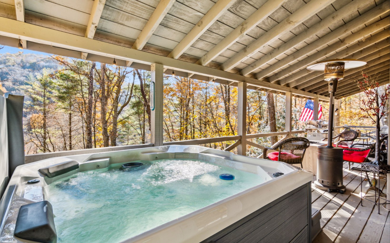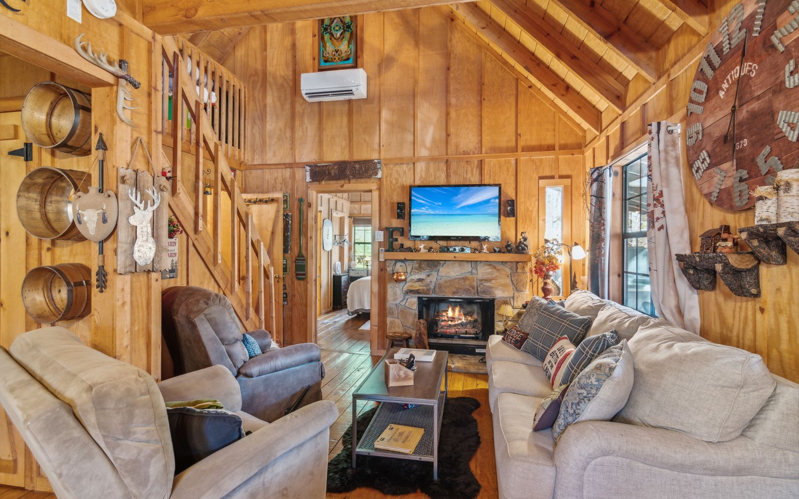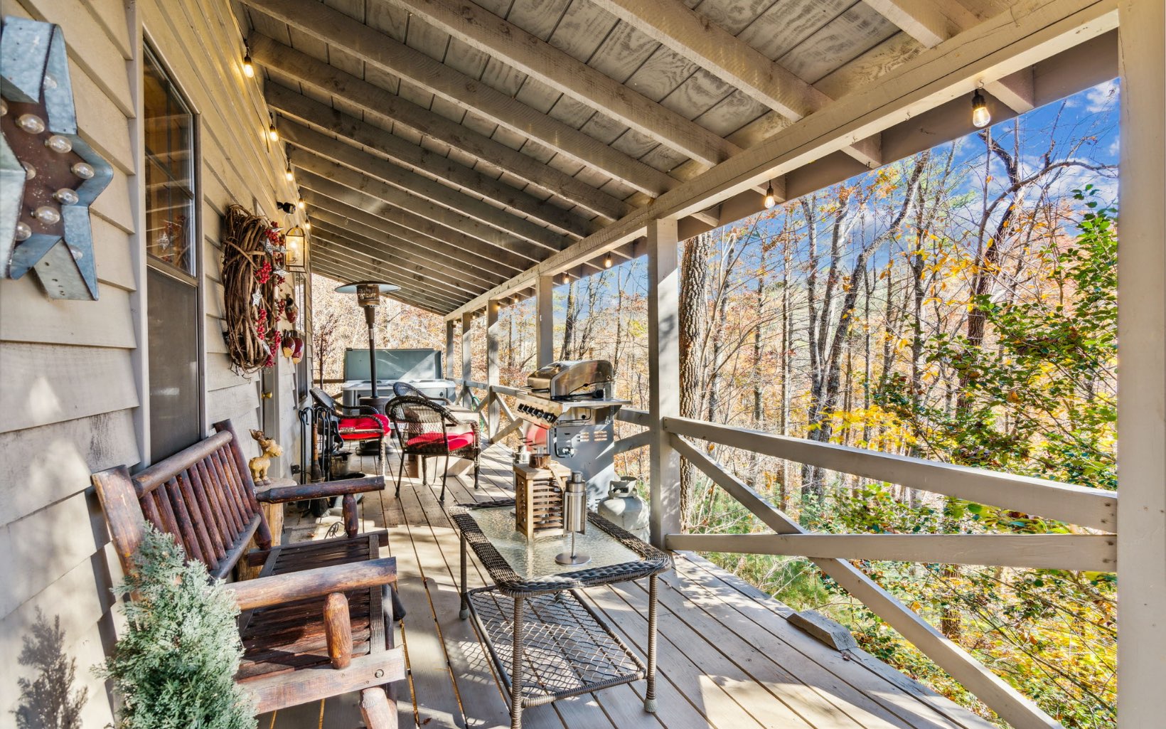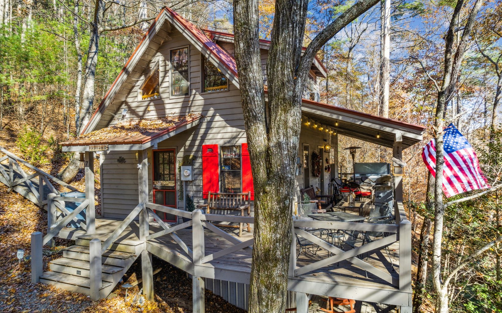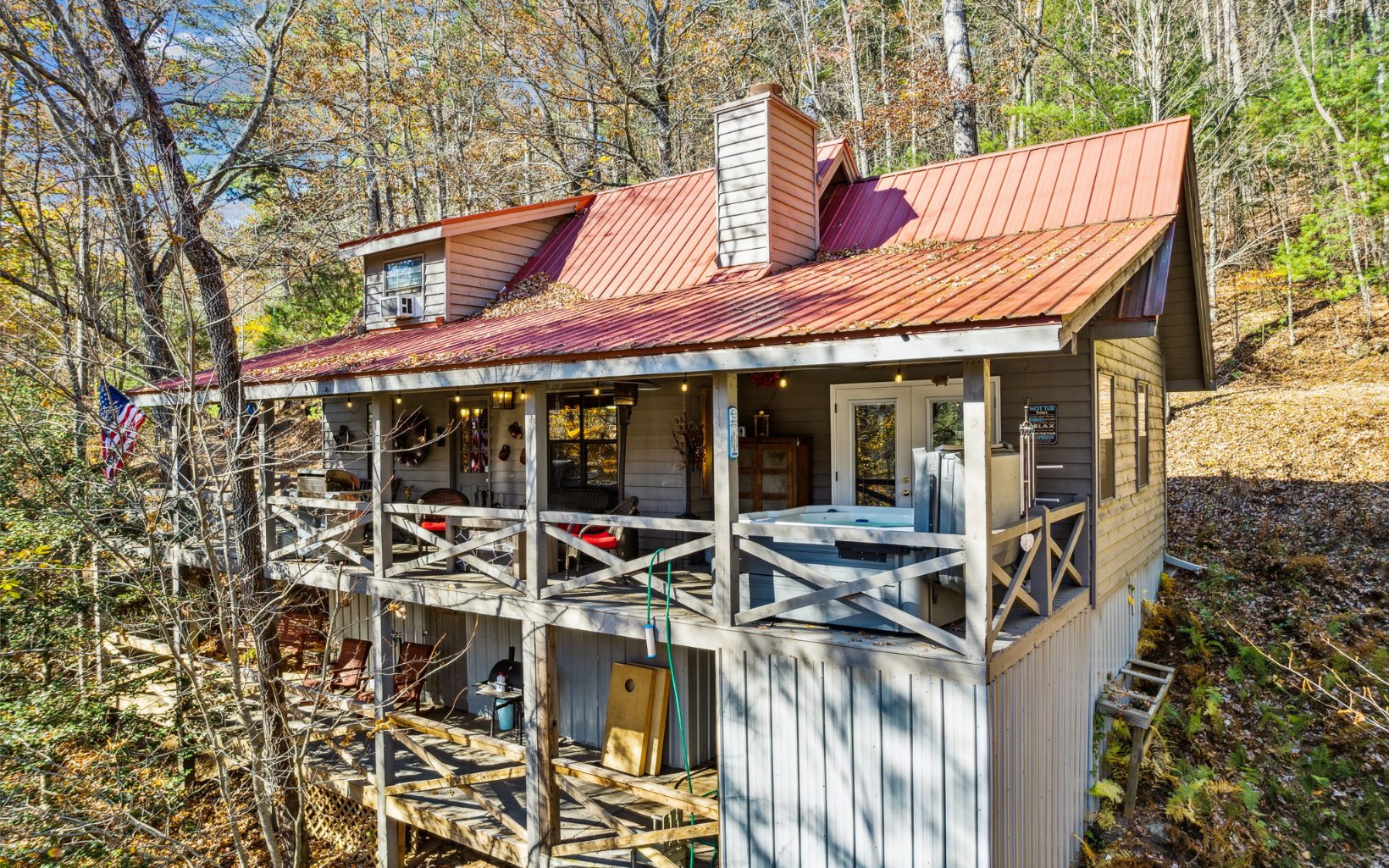 Welcome to this charming rustic cabin w/ seasonal mountain views, fully adorned & furnished for your comfort. This 2-BR, 2-BTH retreat offers the ultimate escape where life can unwind. Inviting open floor plan w/ rustic kitchen, dining, & living area, complete w/ gas log/wood-burning fireplace. The all-wood interior boasts vaulted ceilings, enhancing the sense of spaciousness. Main floor master bedroom w/ double doors leading to a private covered wrap-around porch & hot tub area, offering a serene setting w/ mountain views and the distant sights & sounds of the Toccoa River. Upstairs, discover an adorable & spacious loft bedroom. Descend the outdoor stairs to a 2nd covered porch area & a generously-sized storage space. This tranquil development is situated in the heart of the Chattahoochee National Forest, near the Appalachian Trail & Benton McCay Trail, as well as attractions like the Toccoa River, Coopers Creek, Deep Hole Recreation Area, waterfalls, & more.