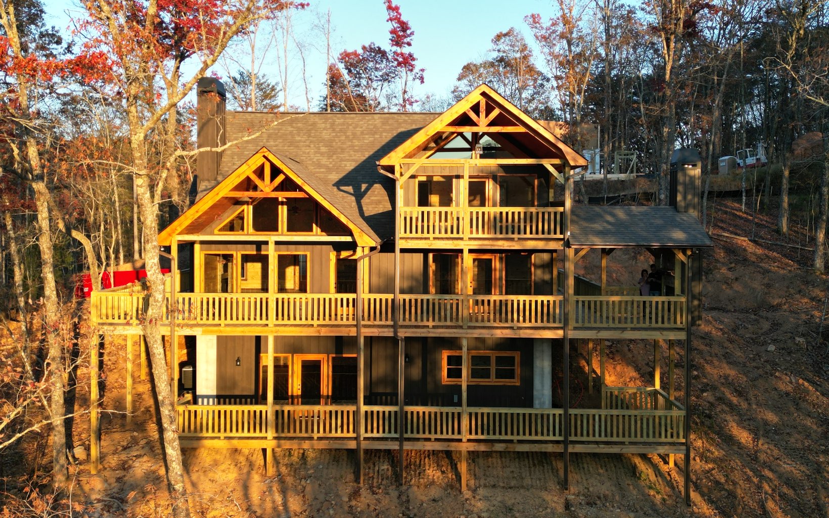 Year Round Mountain View AND Toccoa River Access! Deeded access to Toccoa River with a pavillion and park grills riverside. This brand new cabin is very spacious with 3 large BRs (one on each level) The main level and the upper level are both master suites with double vanities, tiled showers and soaking tub. There are two laundry hook ups, One on main and one in basement. Basement family room has a fireplace as well as a wet bar perfect for entertaining. The great room on the main is huge! Fireplace than can be wood burning or gas logs, large dining area, and wall of windows looking out the year round mountain view. Custom cabinets throughout with leathered granite countertops. Hear the creek below the the cabin from the huge covered porch complete with an outdoor fireplace(wood or gas) & complete wrap around porch on main level. Lots of closet space and tons of storage! Wired for hot tub.