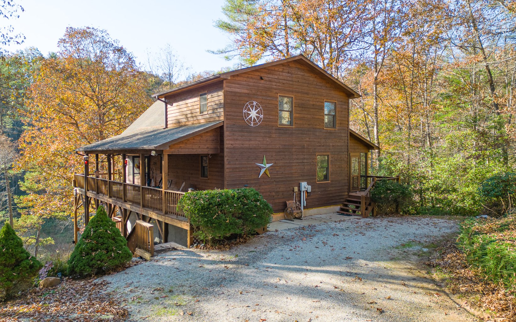 200+/-feet of State Stocked Trout Stream on 1.63. This Hanging Dog Creek Beauty is a three level chalet with wrap around covered porches to enjoy the sounds of the roaring creek below. Open floor plan soaring T/G ceilings, stone fireplace and hardwood floors in the great room. The finished lower lev