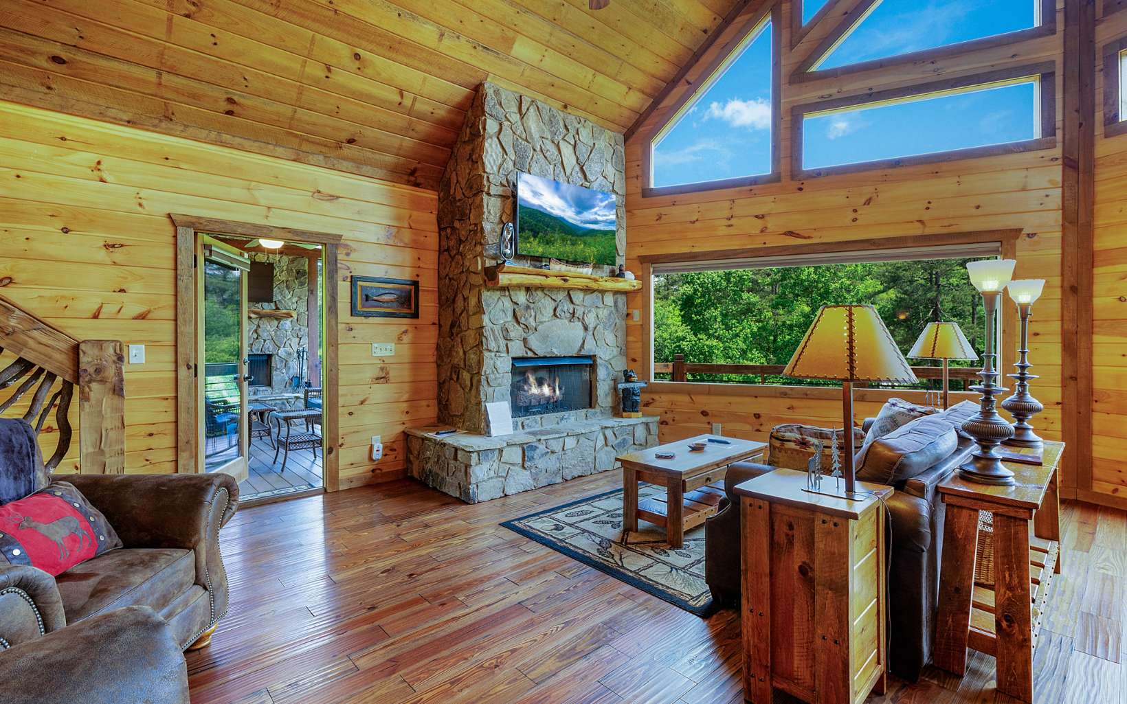 ~Down by the River~ Luxury vacation cabin perched above the Scenic Blue Ridge railway with 130ft of level frontage on the Toccoa River. Meticulously maintained inside and out. Rustic all-wood interior with mountain laurel railing and custom hand-hewn staircase, upgraded granite countertops throughou