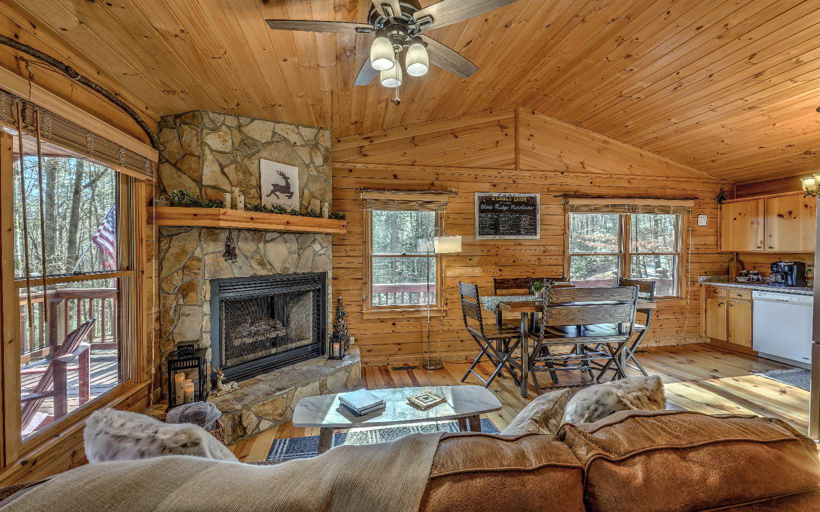 IN THE HEART OF NATIONAL FOREST, this POPULAR FLOOR PLAN has 4 bedrooms, 3.5 bath flat-front cabin sitting on 2.44 acres with year-round mountain views from all levels and offers many upgrades including open kitchen w/custom flooring, granite countertops, large farm sink, tiled backsplash, open to g