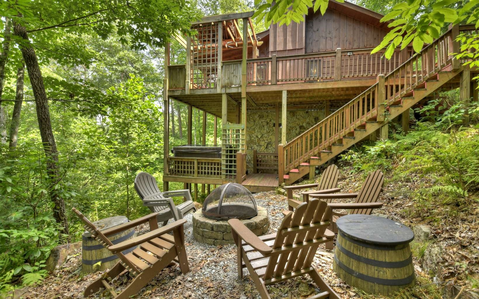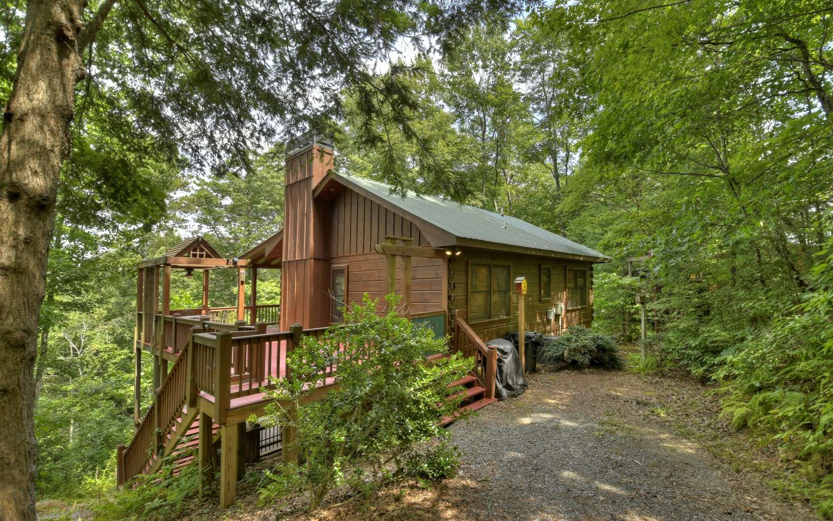 The ideal setting for a cabin nestled in the woods with a year round view. Located at the end of the road, this private 2 bedroom, 2 bath home has a fun, loft sleeping areas for the kids and an outdoor shower!! Lots of room to spread out on the beautiful upper deck, with a pergola for outdoor dining