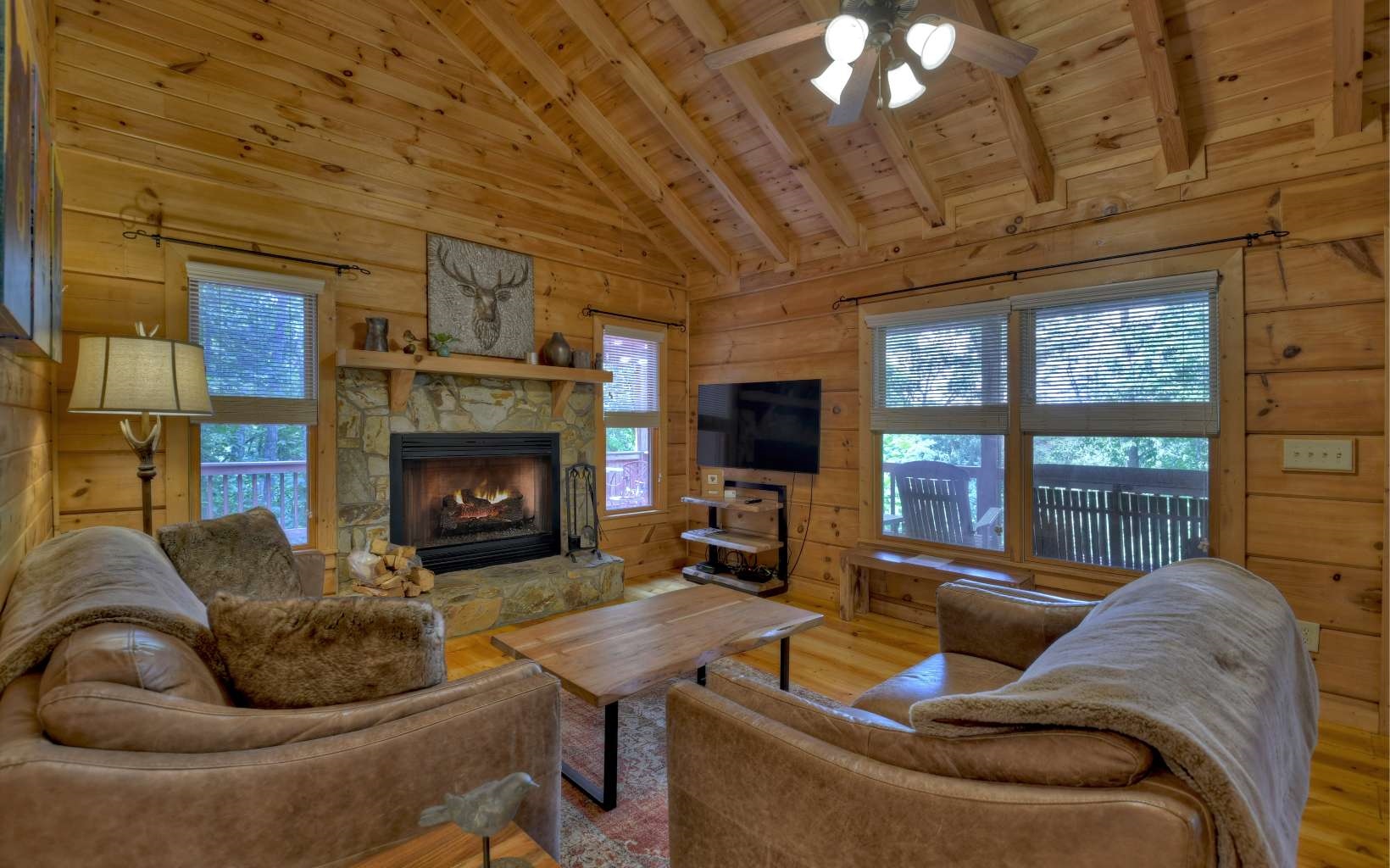 Retreat to the mountains of Blue Ridge! Sprawling 4 bedroom, 3 bath mountain home, perfect for full-time living or a vacation rental. Low maintenance home and landscaping. Large living area with stone, wood-burning fireplace, real wooden floors and stunning pine walls. Great room area opens onto a h