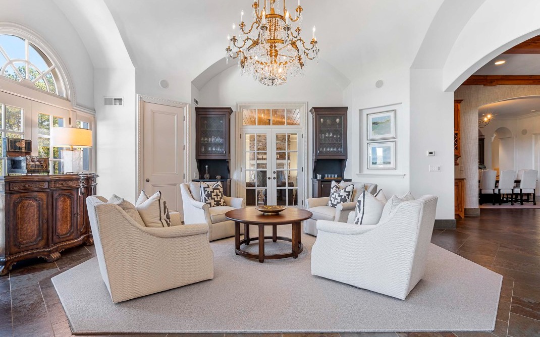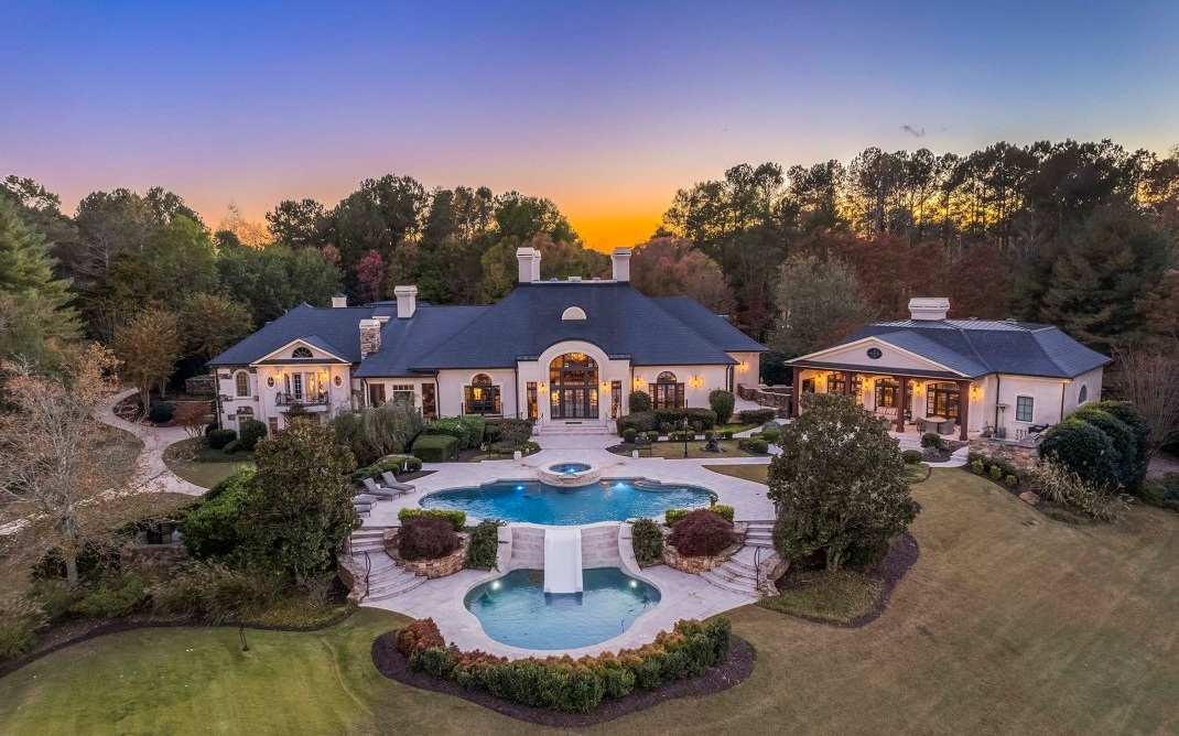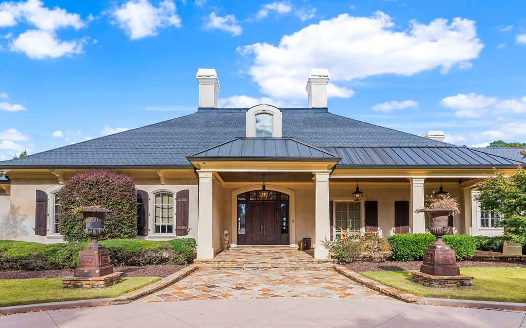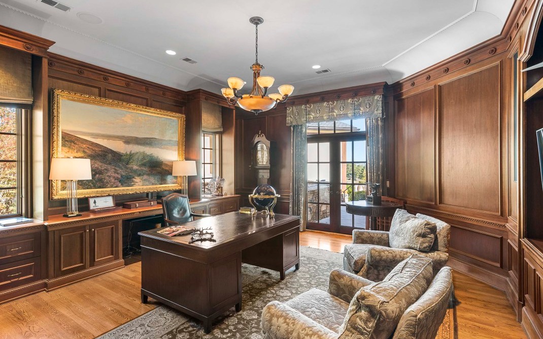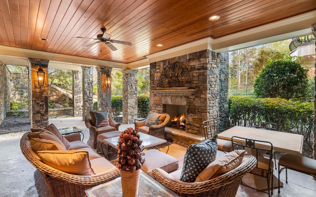 The magnificent footprint of this Hawks Ridge estate impresses you at first glance, while the wide front porch welcomes you like an old friend. Elegantly-lofted ceilings, oversized windows, and luxurious finishes abound inside and provide the perfect canvas for grand-scale entertaining. Host a bridge or poker tournament from the game room, a wine tasting with vintages from the expansive cellar, or watch the big game around the massive bar. Music lovers will appreciate the professionally-outfitted recording studio where no detail was overlooked. The impeccably-landscaped 8+ acres offer a multitude of gathering spaces that include a terraced pool & hot tub overlooking the Hawks Ridge golf course, an outdoor living room with a fireplace, 2 outdoor kitchens, a private courtyard, a screened-in porch with grill & fireplace, and of course the tennis court. MUST SEE to truly appreciate!