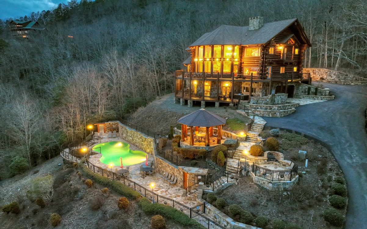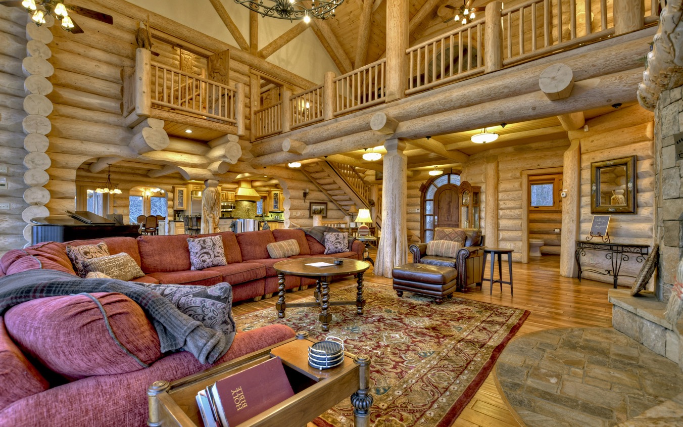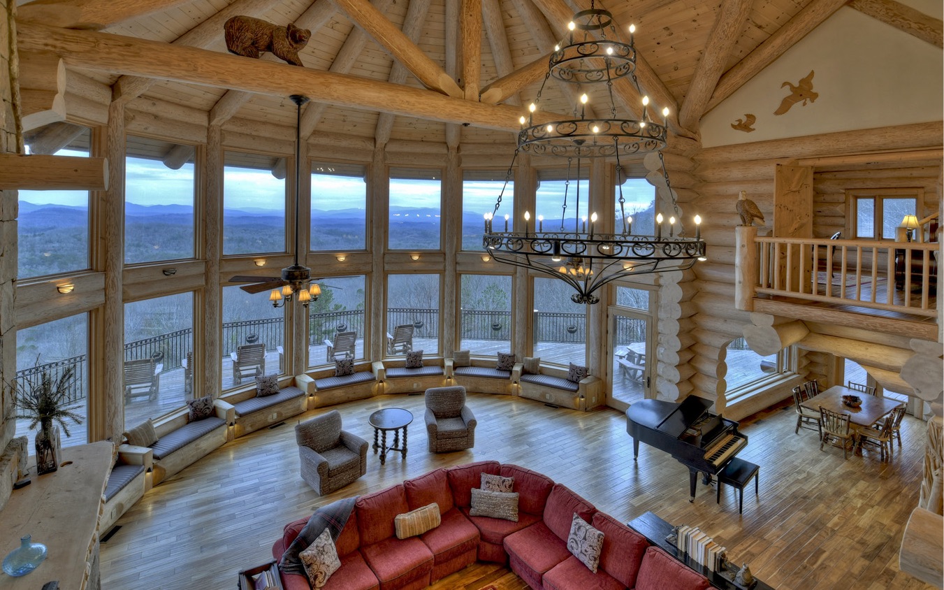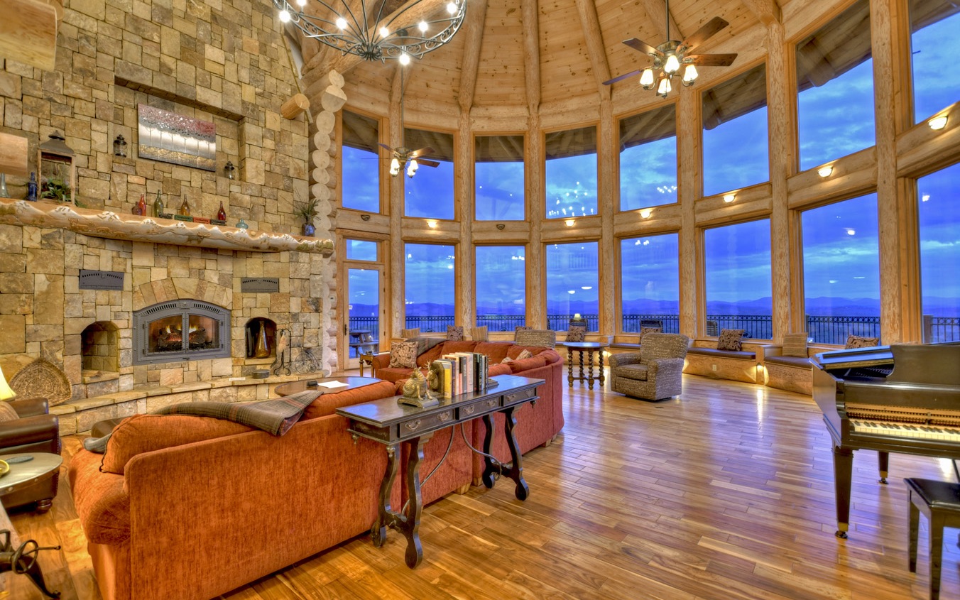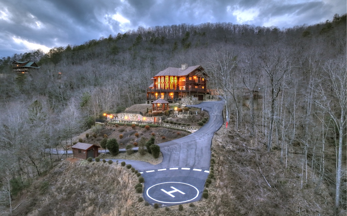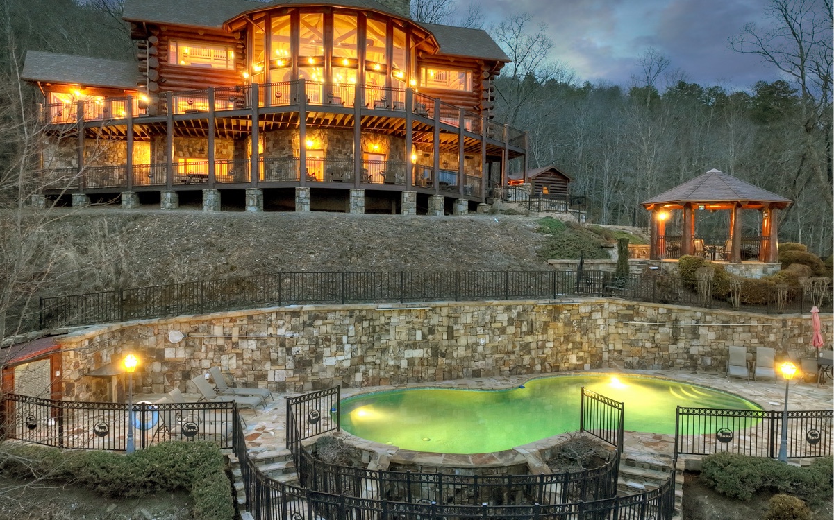 MAKE A STATEMENT IN THIS STUNNER.. British Columbian Cedar Log home is a masterpiece featuring every possible amenity.. Nearly Every Room stuns with a "view of the world" through these "walls of glass", 5bdrm suites, 4.5baths, home theatre, rec room w/ full kitchen & wet bar, fitness room, elevator shaft, executive office w/ gorgeous built-ins, large loft, intricate carvings throughout, massive stone fireplaces,baths feature detailed tile work, carved glass & fireplaces above jacuzzi tubs, 2 car garage, helicopter pad, sky high "massive timber" portico, in-ground "grande" hot tub & vanishing edge pool overlooking 180 degree 100 mile unobstructed mtn views!!! This Mountain Top Manor offers the life of the "rich & famous"-great for full time estate, mountain getaway, or corporate retreat & more..very private all paved access, and large tract offers ultimate privacy at top of mountain...Excellent rental history and fabulously furnished...showcase home!