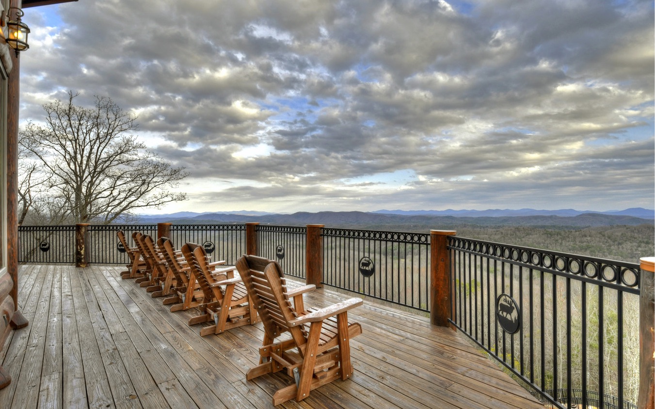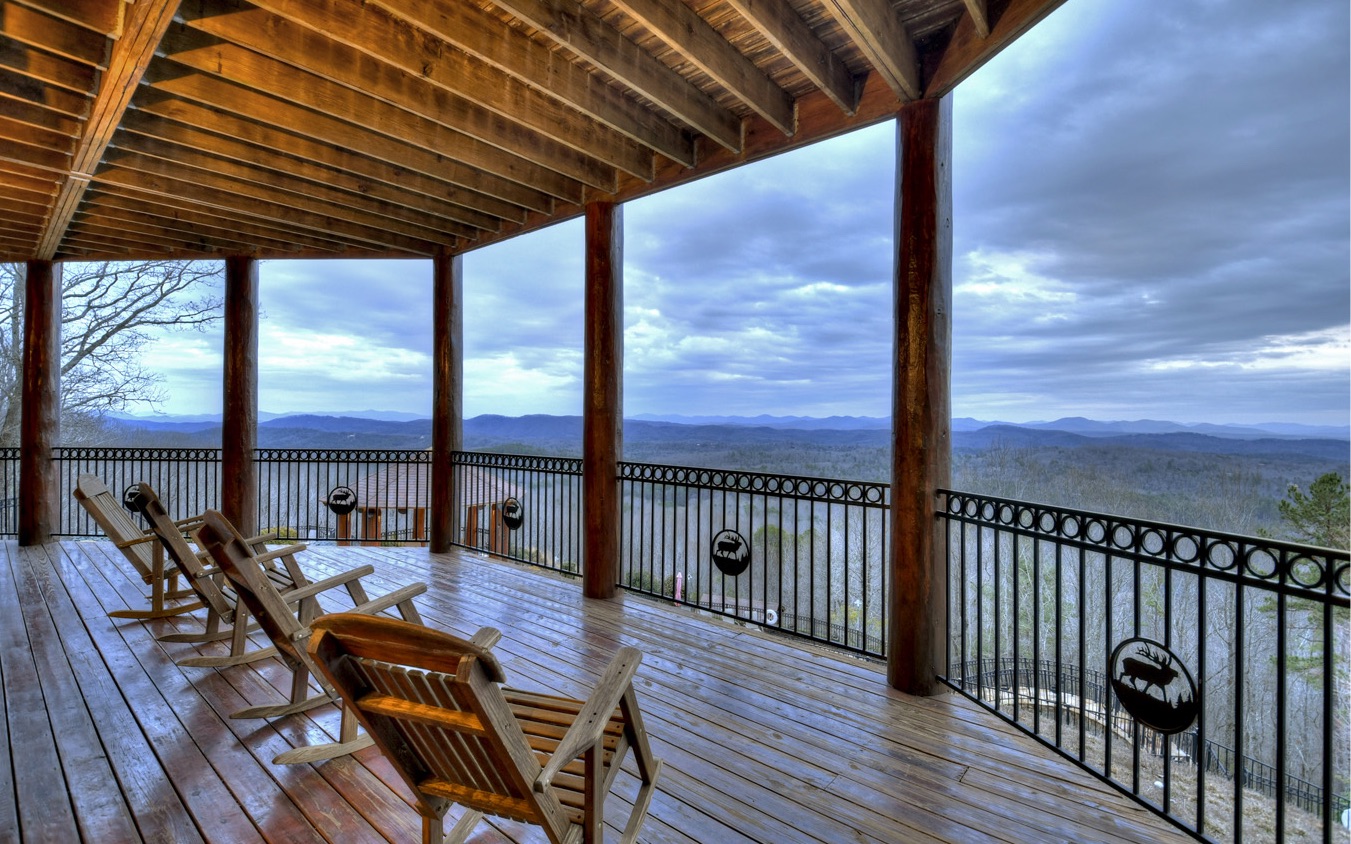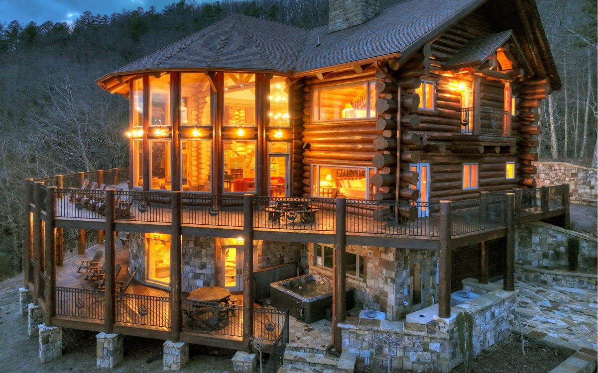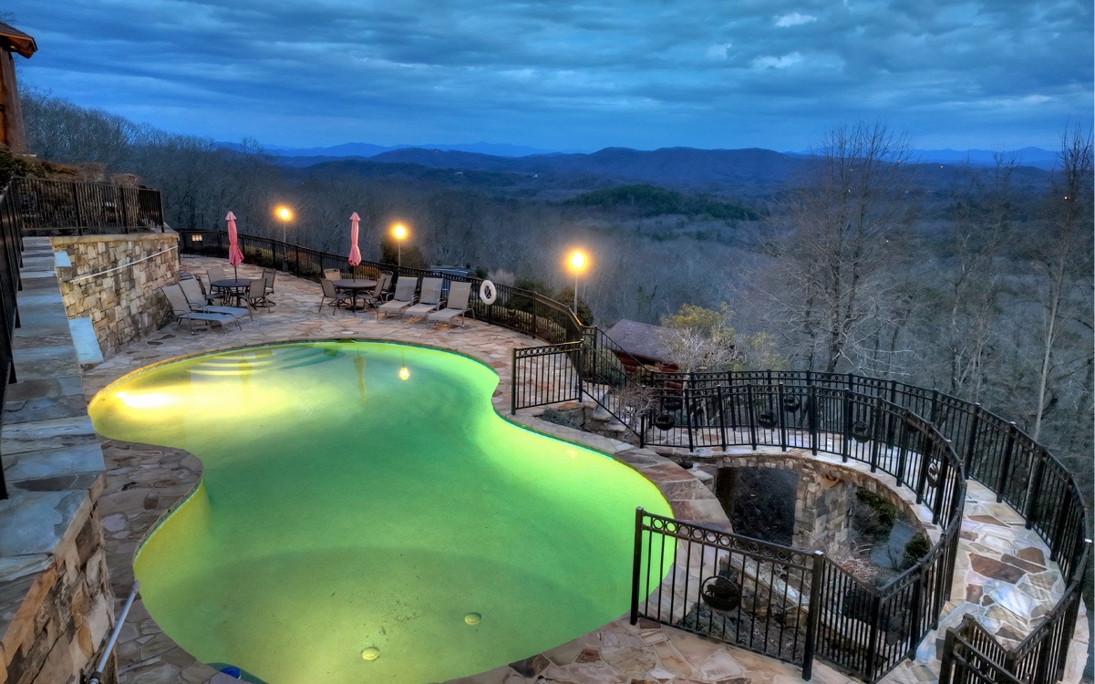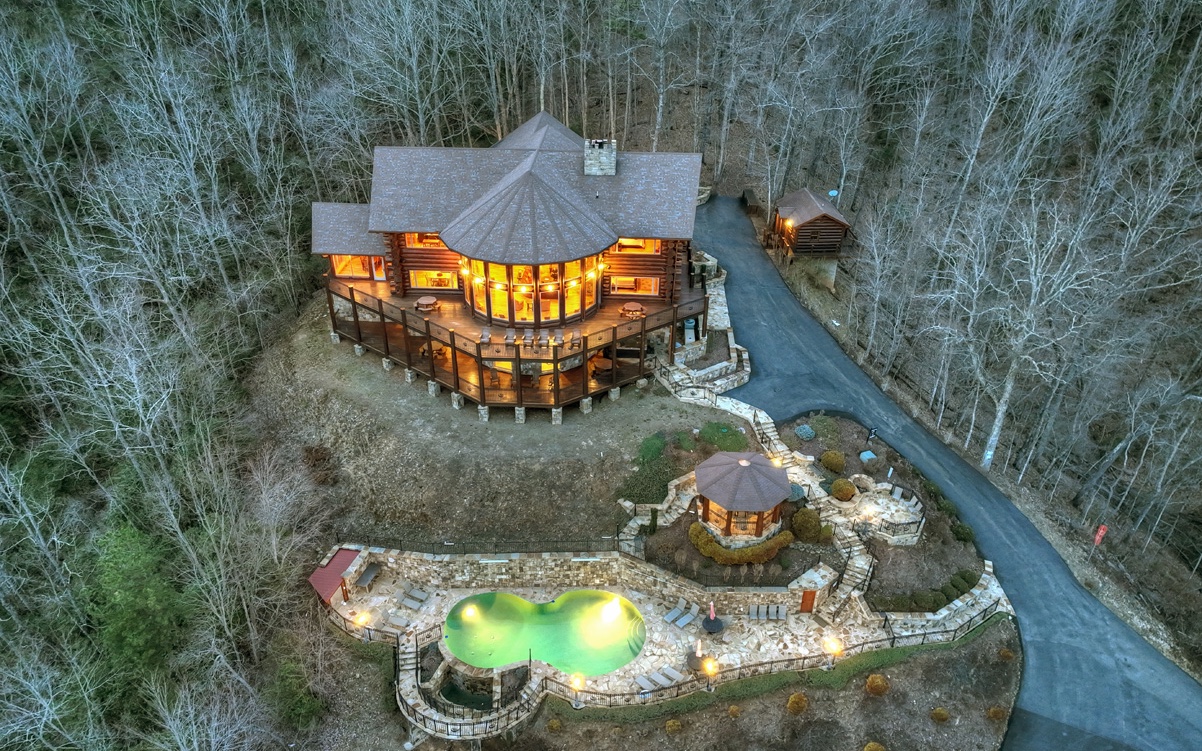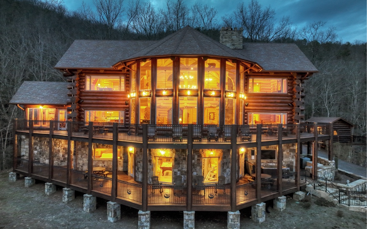 MAKE A STATEMENT IN THIS STUNNER.. British Columbian Cedar Log home is a masterpiece featuring every possible amenity.. Nearly Every Room stuns with a "view of the world" through these "walls of glass", 5bdrm suites, 4.5baths, home theatre, rec room w/ full kitchen & wet bar, fitness room, elevator shaft, executive office w/ gorgeous built-ins, large loft, intricate carvings throughout, massive stone fireplaces,baths feature detailed tile work, carved glass & fireplaces above jacuzzi tubs, 2 car garage, helicopter pad, sky high "massive timber" portico, in-ground "grande" hot tub & vanishing edge pool overlooking 180 degree 100 mile unobstructed mtn views!!! This Mountain Top Manor offers the life of the "rich & famous"-great for full time estate, mountain getaway, or corporate retreat & more..very private all paved access, and large tract offers ultimate privacy at top of mountain...Excellent rental history and fabulously furnished...showcase home!