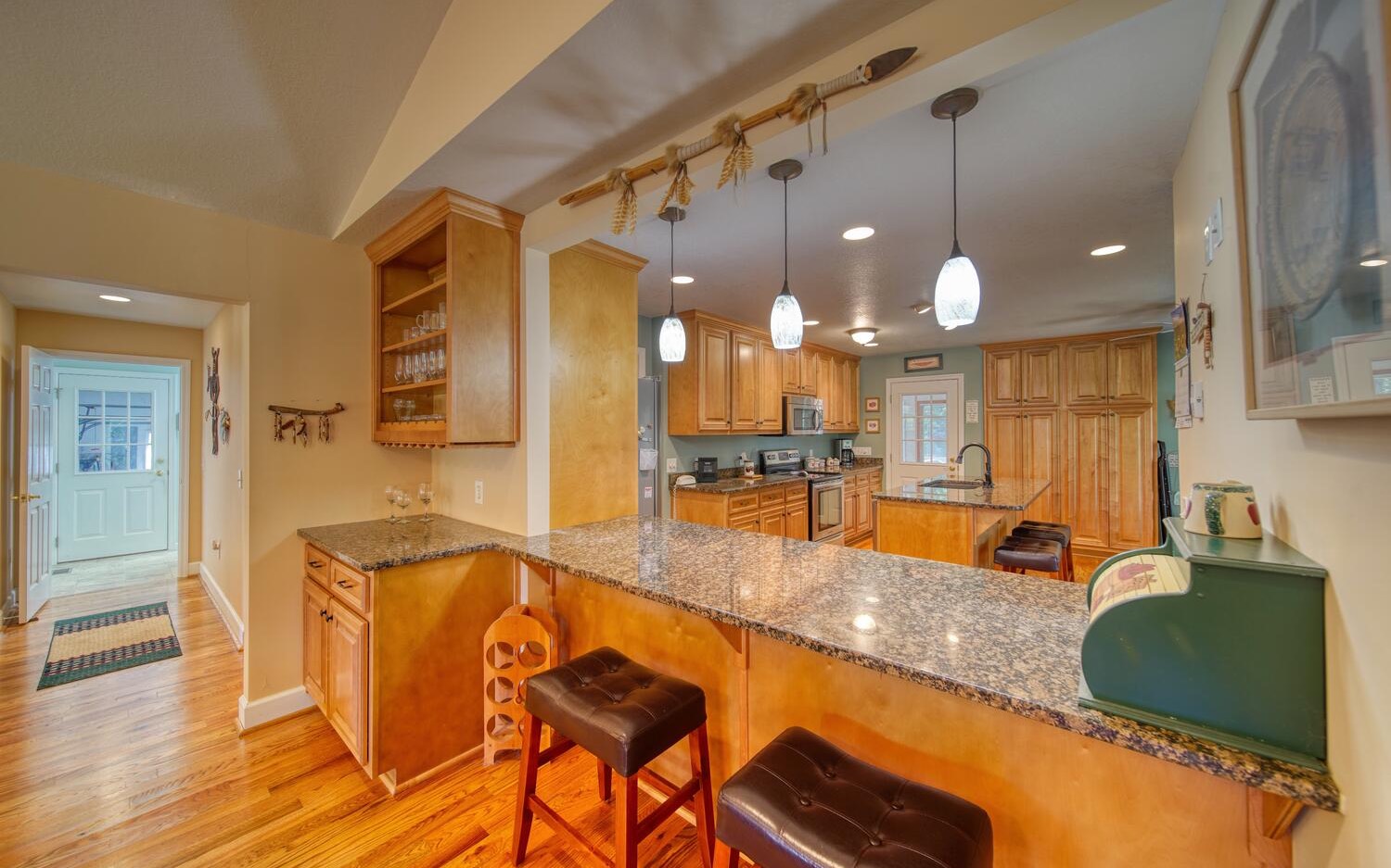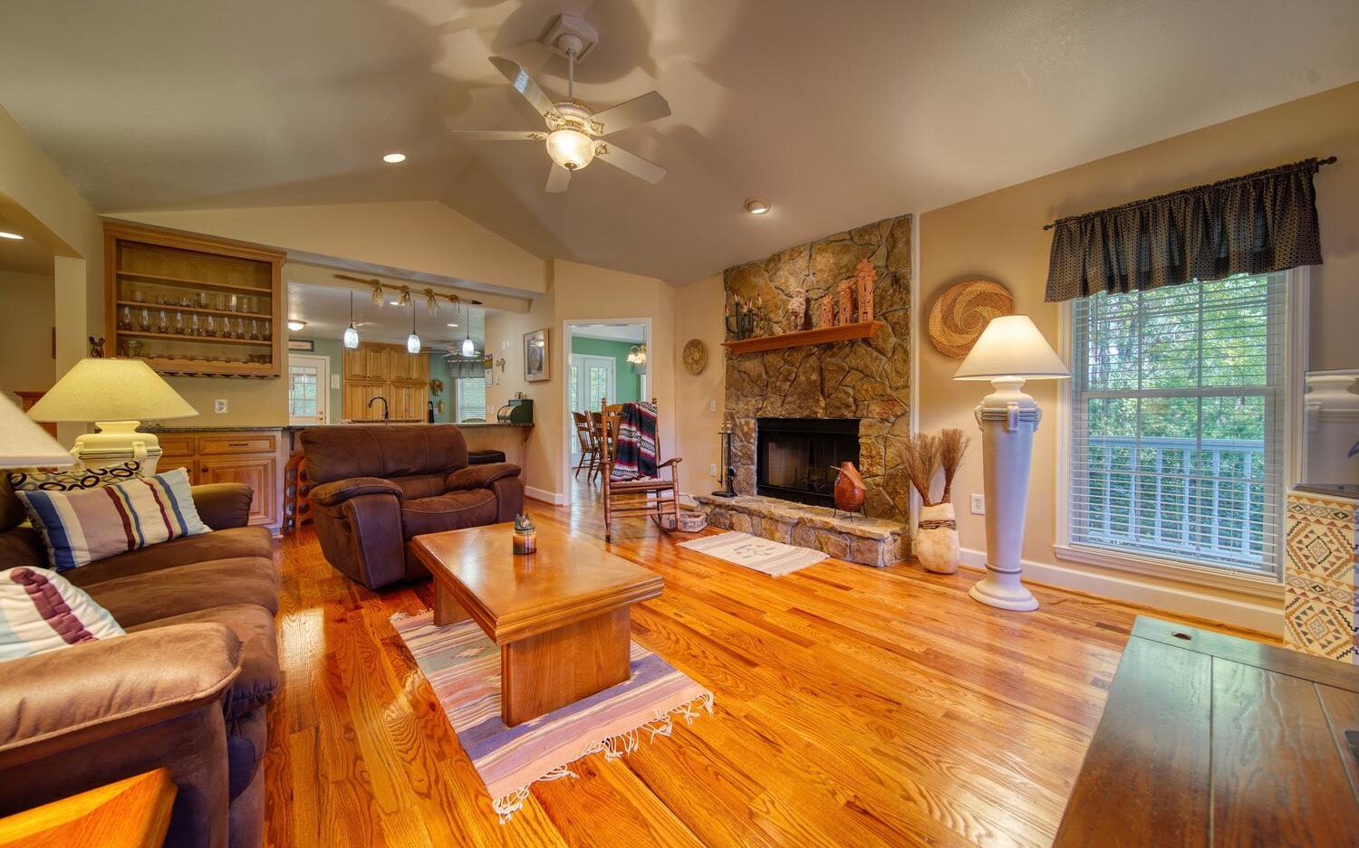 Nottely River FRONTAGE! The enviable ease of single-story living is yours to enjoy in this lovely 3-bedroom, 2-bathroom ranch-style home, which is a great find within the highly desirable Souther Mill Estates area. The home is convenient to Vogel State Park and the City of Blairsville with access on all paved roads. Exteriors include breezy front, side and back porches with views of the Nottely River. The interior includes oak hardwoods throughout, neutral decor, and notable ceiling styles (including vaulted and tray). The brand new kitchen glows with fresh updates, attractive island layout, and granite counters. The restful master bedroom includes a linen closet and private bath with step-in tile shower. The other two bedrooms, situated above the ground floor for privacy, are unique and quiet. Attached two-car garage. This home comes completely furnished and is turnkey. You're going to feel great waking up here every morning.