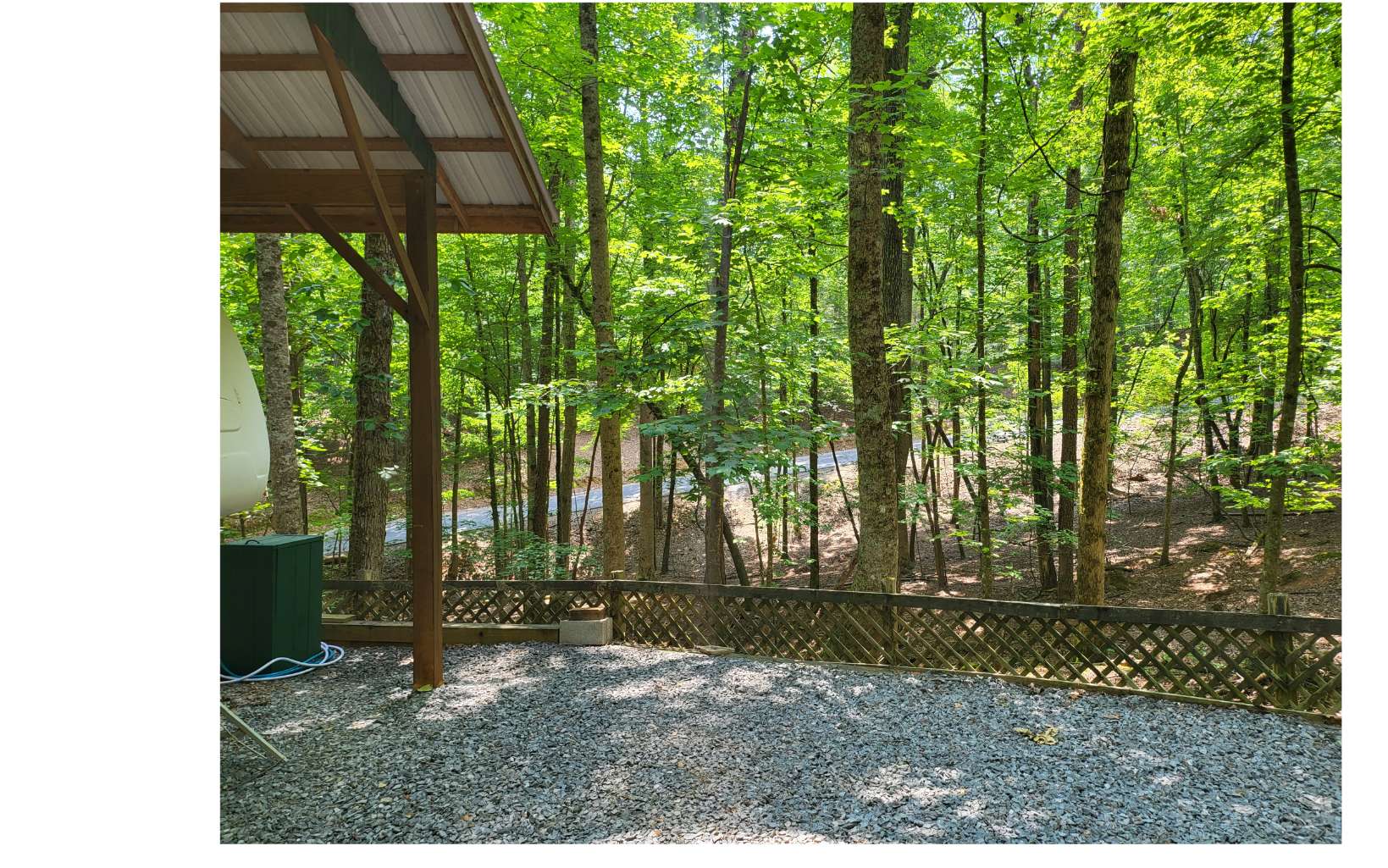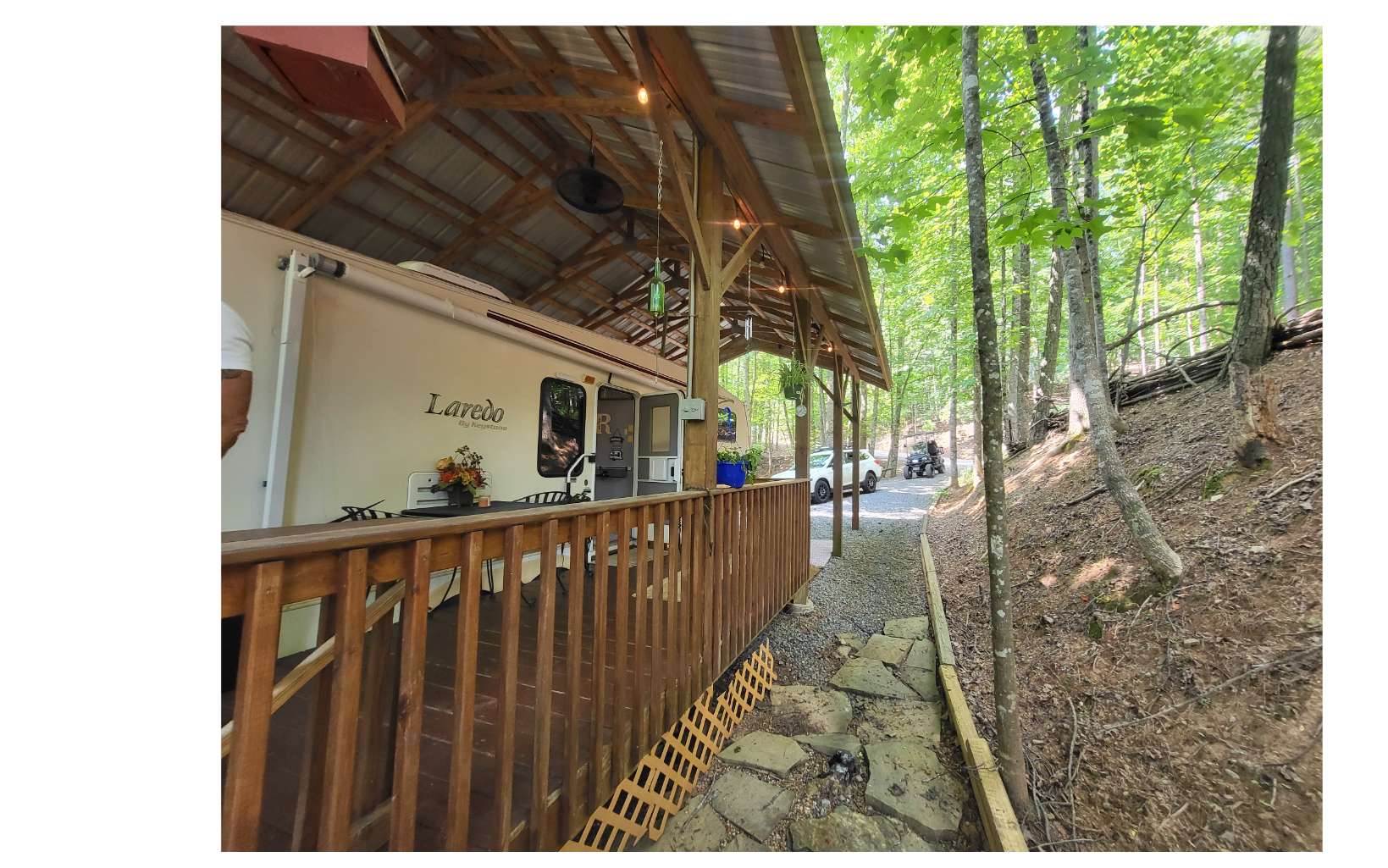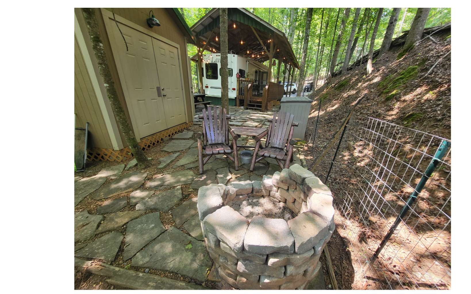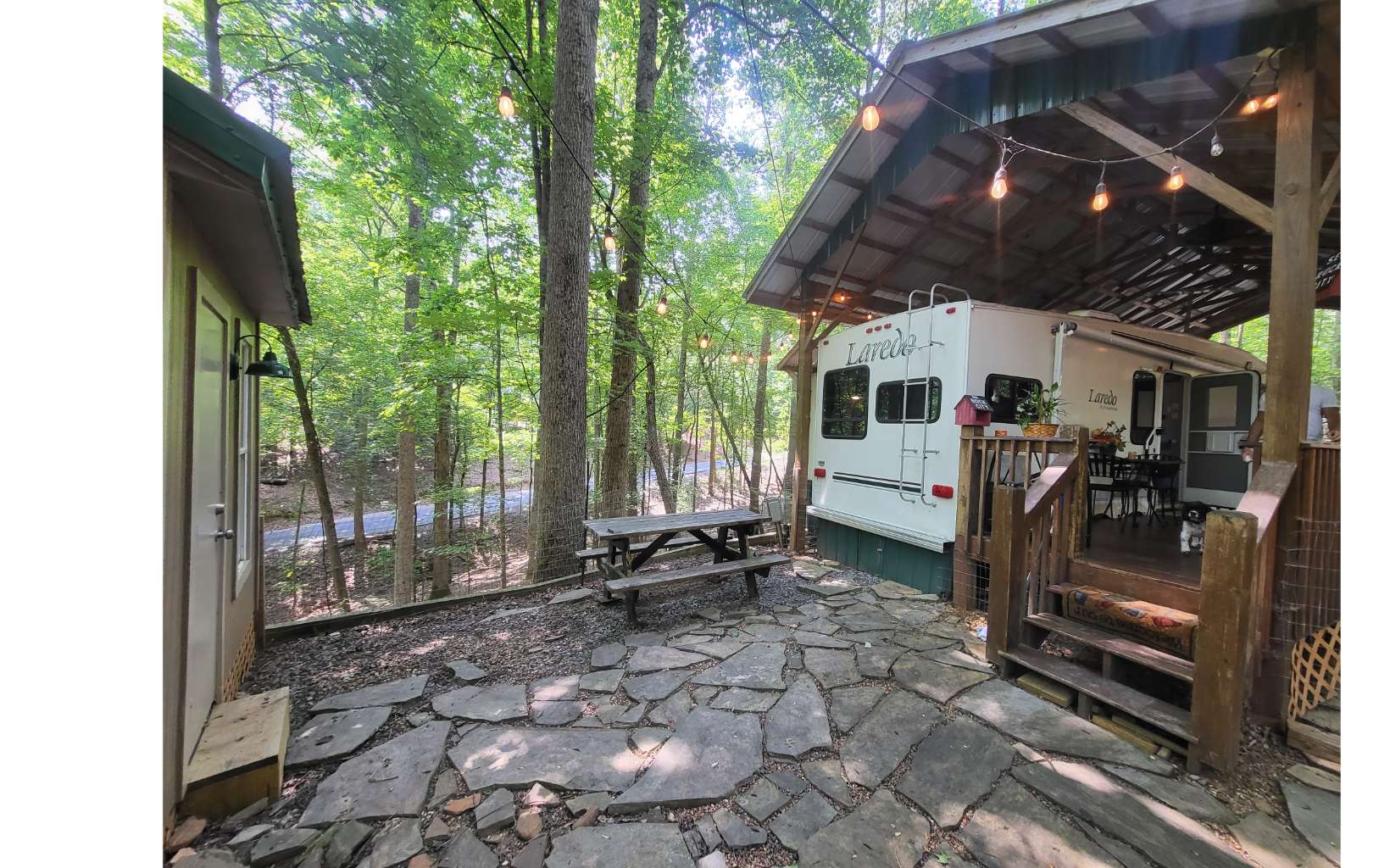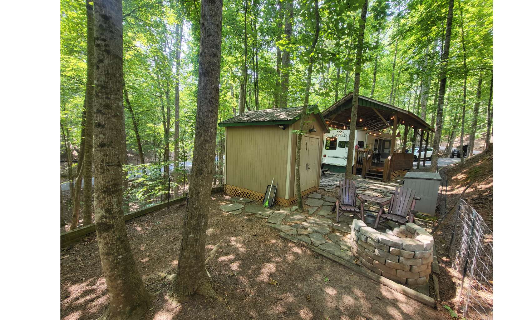 LOOKING FOR your serenity in the Mtns? This "Treehouse in the GA Mountains" is ready to go - ready for you to move right in! Enjoy time away from the hustle & bustle of the city and relax on the deck under the large roof over built in 2018 clean and comfortable w/ bdrm (queen), full bathroom, full kitchen. Warm, Inviting, Spacious, Open, Covered decking for enjoying the beautiful surroundings of this unique spot. Overlook the greenspace behind you with tons of wildlife, fire pit, built in grill on a stone patio, large deck, privacy fence. All furniture stays, so this is turn key! The yard is maintenance free w/ stone and mulch. Bonus: Storage building. Smoke-free. Extra parking. Very private. Walk to the Riverside Pool + Dog Park & foot bridge crossing access to Fishtrap Park and its picnic pavilions and Kids Play areas. All resort amenities available including Rec Center with indoor/outdoor 365 pool, game room, exercise room, putt putt, pickleball, tennis, basketball, 2 outside pools, small fishing lake, 5 parks on the river, walking trail & more.