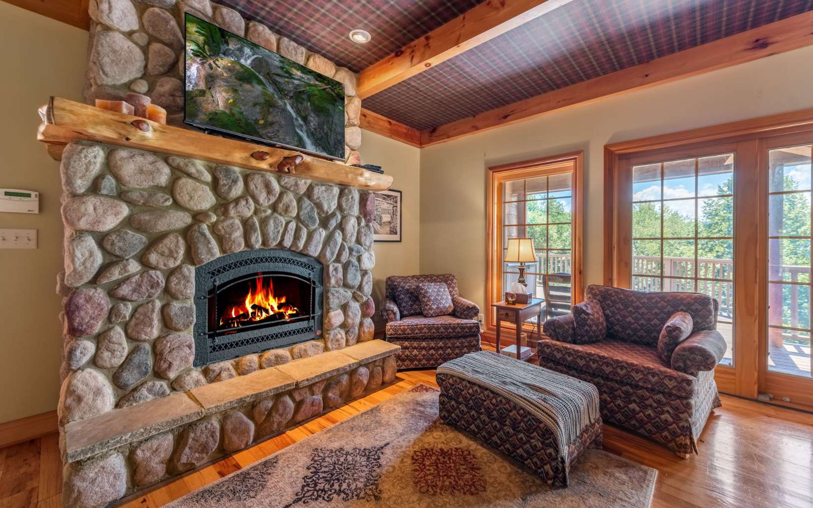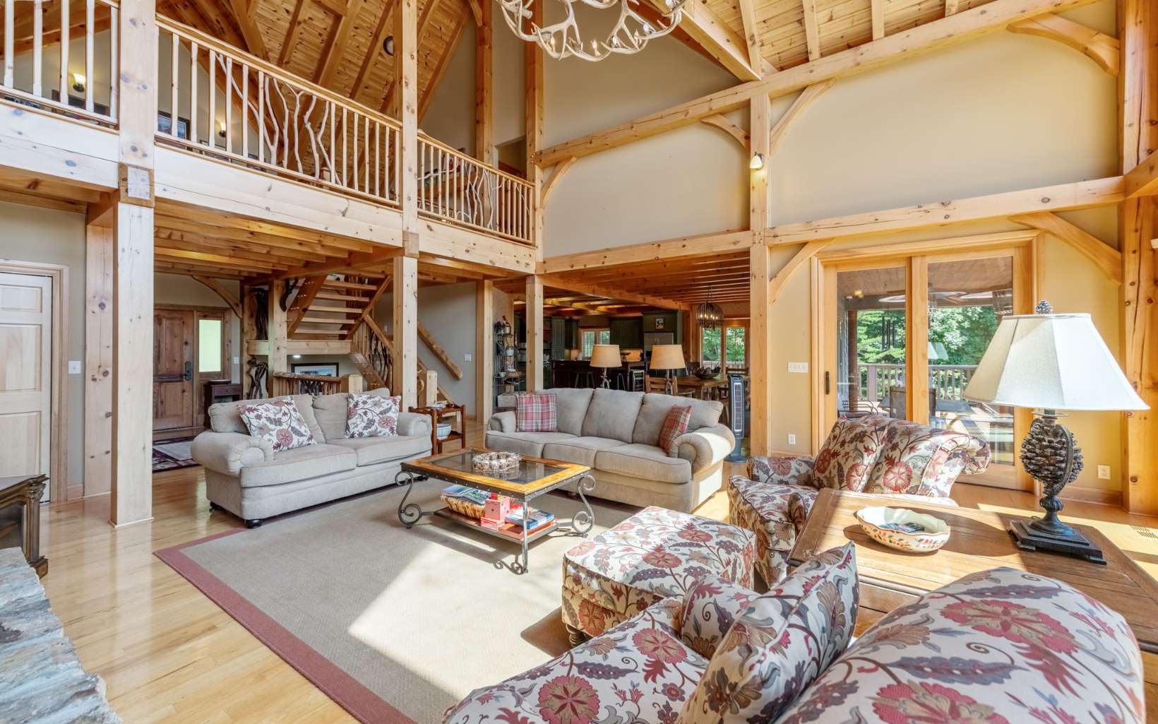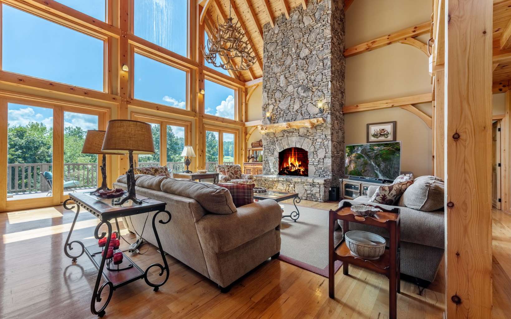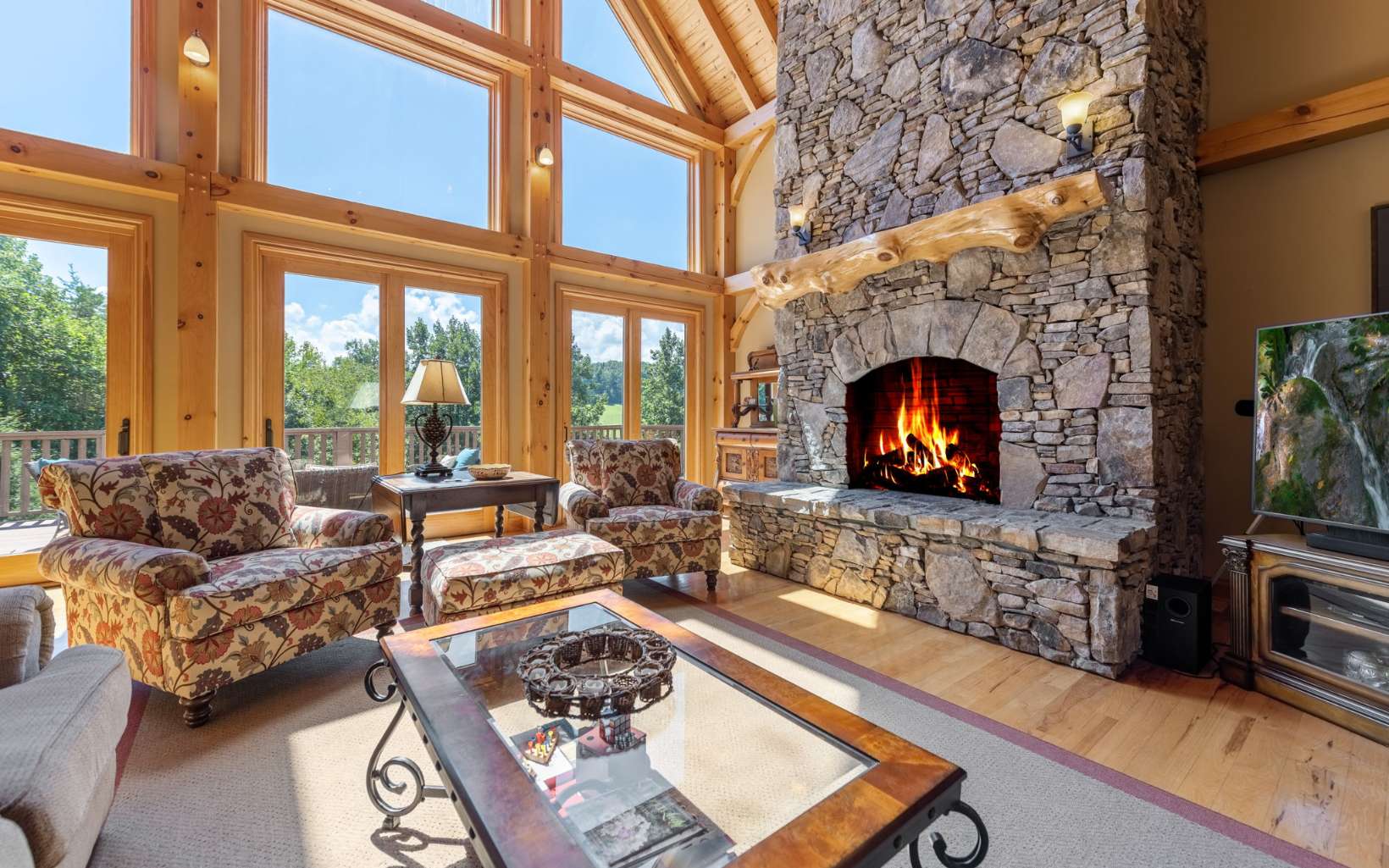 See Attached Full Description: Creekside Lodge is a custom built timber frame masterpiece in the mountains and 630' trout stream and built in sauna. LR w/ massive stack stone FP (gas), 60' cathedral ceilings, wall of windows, & mtn laurel railing. Oversized DR w/ access to back deck w/ long-range mtn views. Chef’s farmhouse style kitchen w/ 5-burner gas stove, prep island w/ sink, S/S apps, granite c-tops, & pantry, barn wood table that seats 16. 2 laundry rms (main & upstairs). Huge primary w/ deck access, gas FP, walk-in closet, 2 massive owner's suites (main/upstairs) w/ step-in double headed shower, jetted tub, walk-in closet, & dual stone sink vanity w/ added storage. Vaulted loft w/ seating area, 2 BRs, & full BA upstairs. 2,330 sqft terrace level: full kitchen w/ S/S apps & granite c-tops, LR w/ stone pass-through FP (gas), deck access, game rm with 8' pool table, foosball, slot machine, dart board, BR, full BA with claw foot soaking tub, 2nd full BA w/ trough sink, step-in shower, & sauna, plus single car garage access w/custom cabinets and add'l storage room. Gorgeous property w/ wide creek, fruit trees, outdoor FP w/ seating area, walking paths, over 2K sqft of multiple full-width decks, storage tower has add'l storage for yard tools w/ deck, generous parking. Home comes furnished, w/golf cart, & yard equip. Work from home w/Mesh WiFi wide range, 8 security camera w/motion, intruder alert, smoke, fire, and carbon monoxide detection, view cameras on PC, Phone or TV.
