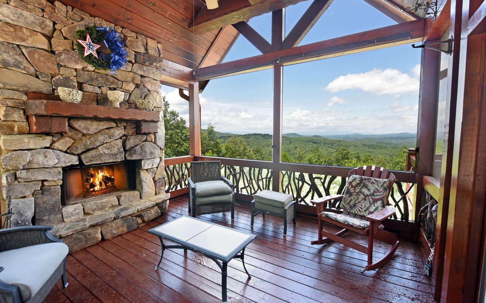 MAJESTIC VIEWS of the Northwest mountains of Georgia, Big Frog in Tn & North Carolina. The US Forest Service adjoins this property & will delight your desires to truly 'be in the mountains'! The owners added their special touches such as waterfall spouts into decorative bath bowls; birch accents complementing the wood walls & floor to ceiling rock fireplace; branches intertwined on the staircases add interest; the screened porch with wood fireplace is another spot to gather to enjoy the surroundings; downstairs is great for games, cards or movies. Also a generator, the patio is wired for hot tub & 24x25 workshop for hobbies or convert for autos. Lake Blue Ridge is only minutes away for boating, swimming & picnics, Blue Ridge Scenic Railway, visit the many orchards, wineries, creeks & rivers to fish or canoe & enjoy all beautiful areas of North Ga. Rentals allowed. WHY WAIT? ENJOY LIFE!!