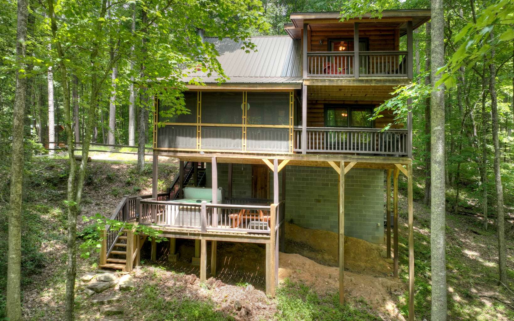 On Golden Pond! Charming log cabin nestled in the woods with a babbling creek on one side and picturesque frontage on the pond. End of road privacy, 3 BR, 2-bath cabin to make mountain memories or use as rental. Cabin updated in 2021 with a new metal roof, HVAC, hot tub, washer, dryer & refrigerator. Master with ensuite bath on upper floor has a private deck to enjoy morning coffee with pond view & noisy creek. The 3rd bdrm loft area has plenty of space for the children to spread out! Large family room, wood-burning fireplace, bedroom, full bath, laundry, kitchen with dining area & extended bar on the main floor. Enjoy the screened-in porch or open deck for grilling. Head down to lower patio to find hot tub, picnic area or fun around the fire pit. Level lot is great for outside games, pets, exploring & fishing in the pond! You must see this home and the grounds to experience the peaceful feeling it imparts.
