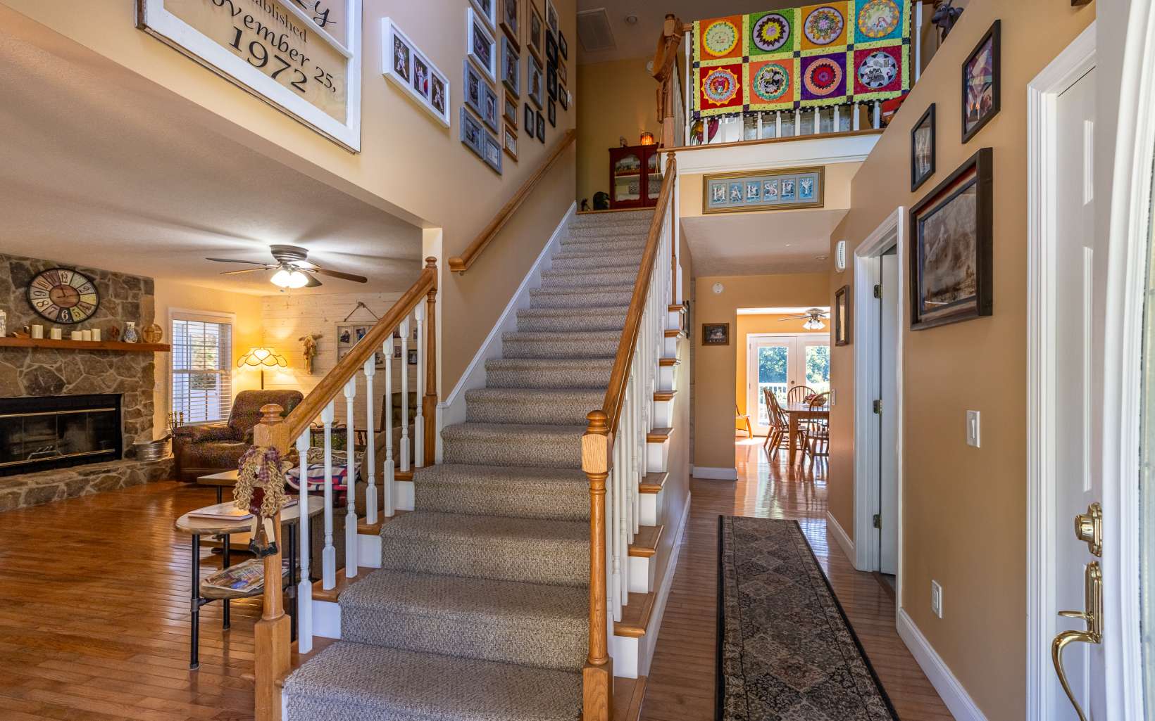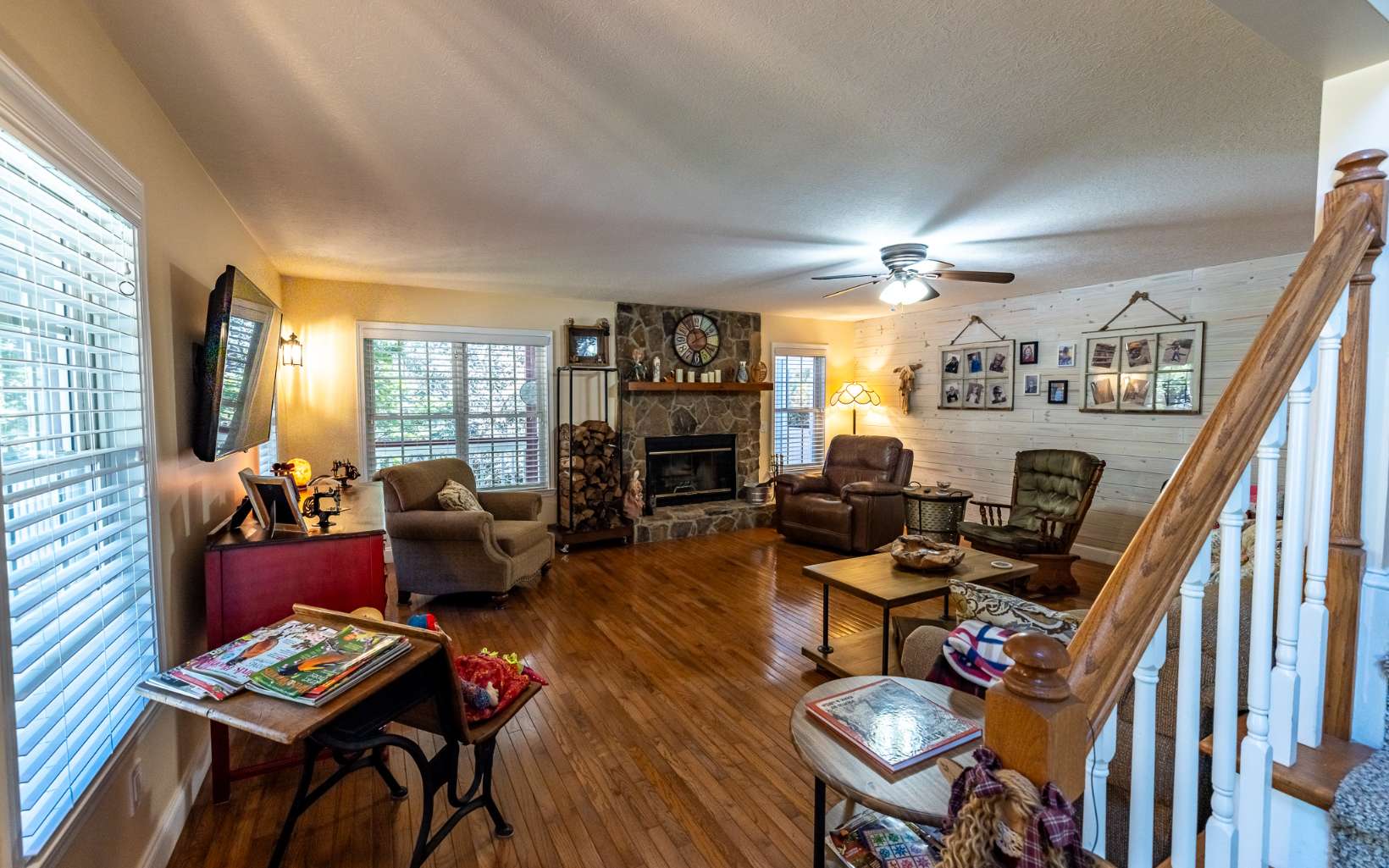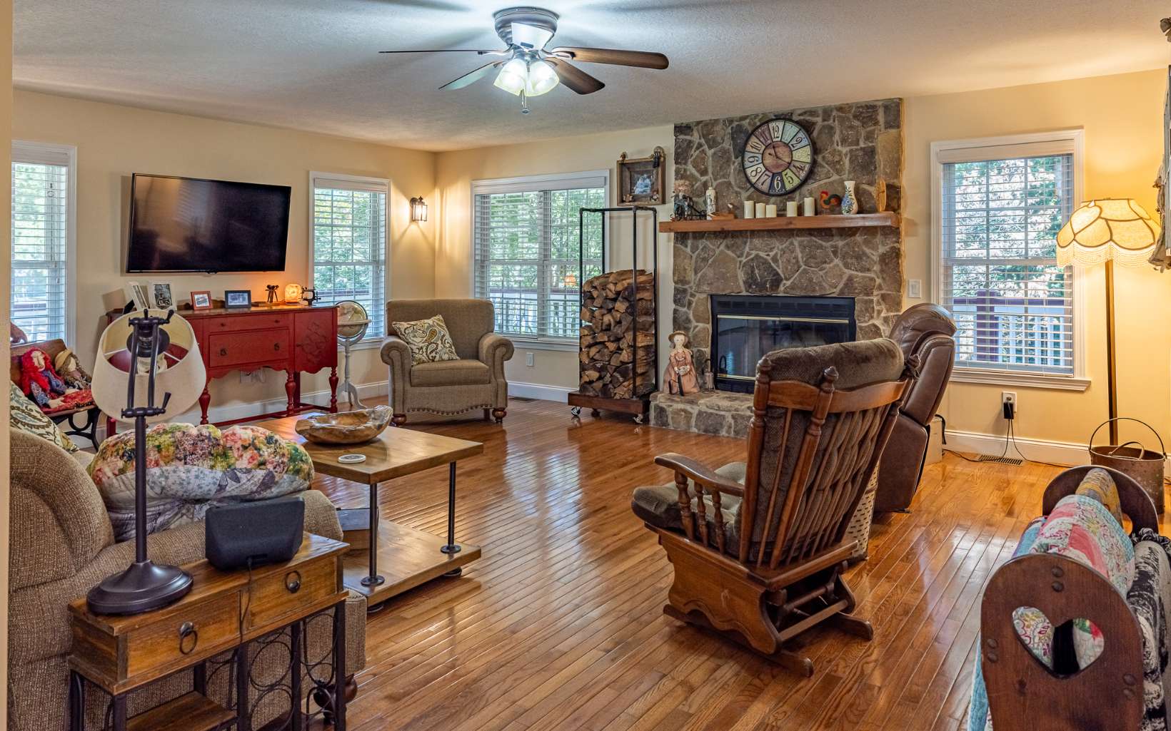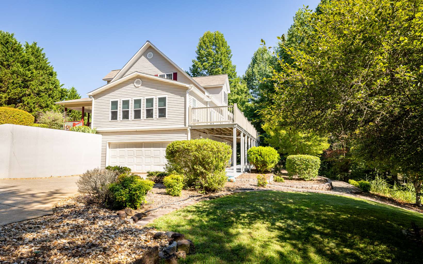 LAKE ACCESS GEM! Spacious home located in upscale community with lake access, private boat ramp for residents and beautiful lake and mountain views! With over 3700 sq ft, this lovely home features a large LR with wood burning FP, separate dining room, gathering room, office, master suite with tiled walk-in shower and large closet, and fabulous bonus room/sunroom. Upstairs guest rooms are bright and spacious with large closets and 2 walk-in attic spaces for storage. Partially finished basement has family room, craft room, half bath, add'l storage/workshop, laundry and 2 car garage. Gorgeous outdoor space has large covered front porch, relaxing patio and garden, large open deck and beautifully landscaped yard. Home is immaculate and comes with RV parking pad, 30 amp hookup and can hold 40’ RV. Select furniture is also available for purchase.