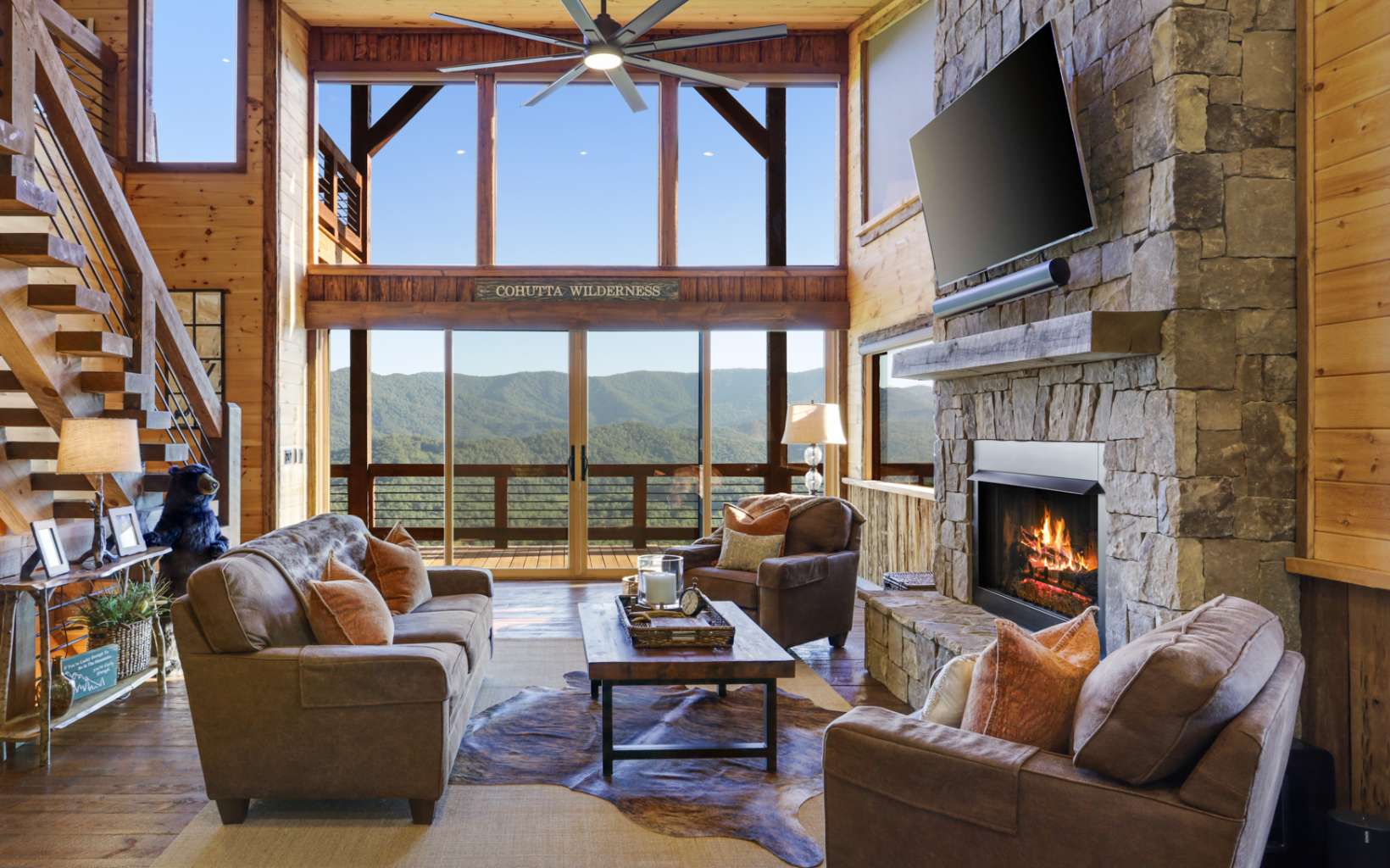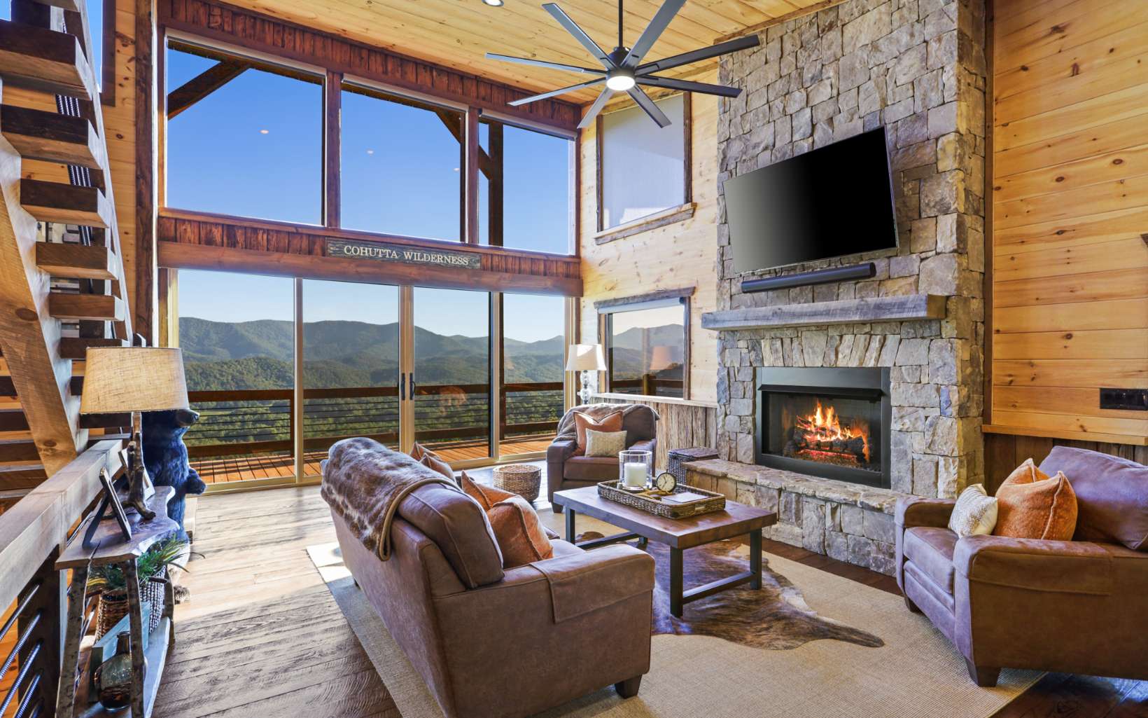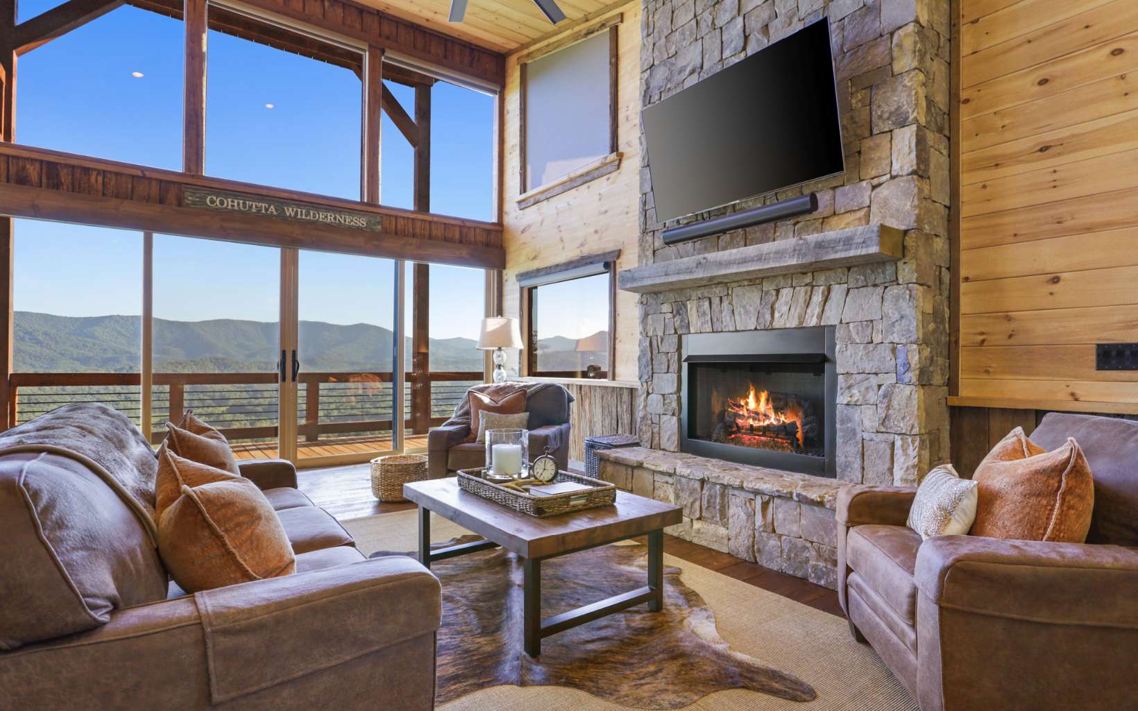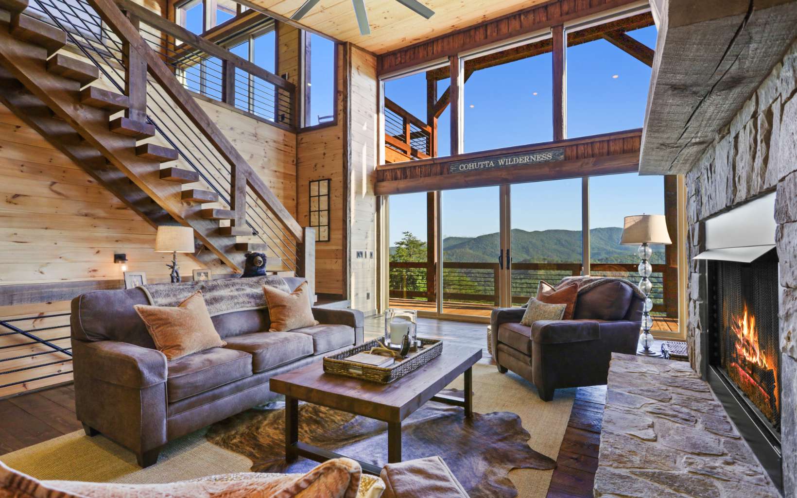 Stunning mountain modern with the BEST VIEWS in BLUE RIDGE! No HOA! Mountain modern design with HUGE unobstructed mountain views of the Cohutta Wilderness from every room! Walls of windows and sliding glass doors showcases the long range views from every room in this well-appointed mountain escape. Grand open floor plan design, oversized great rooms, soaring ceilings, and massive stone fireplaces perfect for family gatherings. Plenty of outdoor entertaining space with an amazing party deck like no other to soak in the views by the fire! Upscale gated community offers all paved road access, fiber internet, community water system and underground power. Close to the Cohutta Wilderness, hiking, horseback trails, waterfalls, and the premiere trout fishing of Fightingtown creek and the Toccoa River! Highly sought after mountain modern cabin design with hard to find views presents an incredible luxury rental investment opportunity. Close to downtown Blue Ridge, Lake Blue Ridge, and the Aska Adventure area!