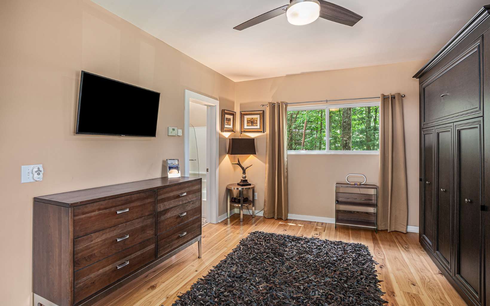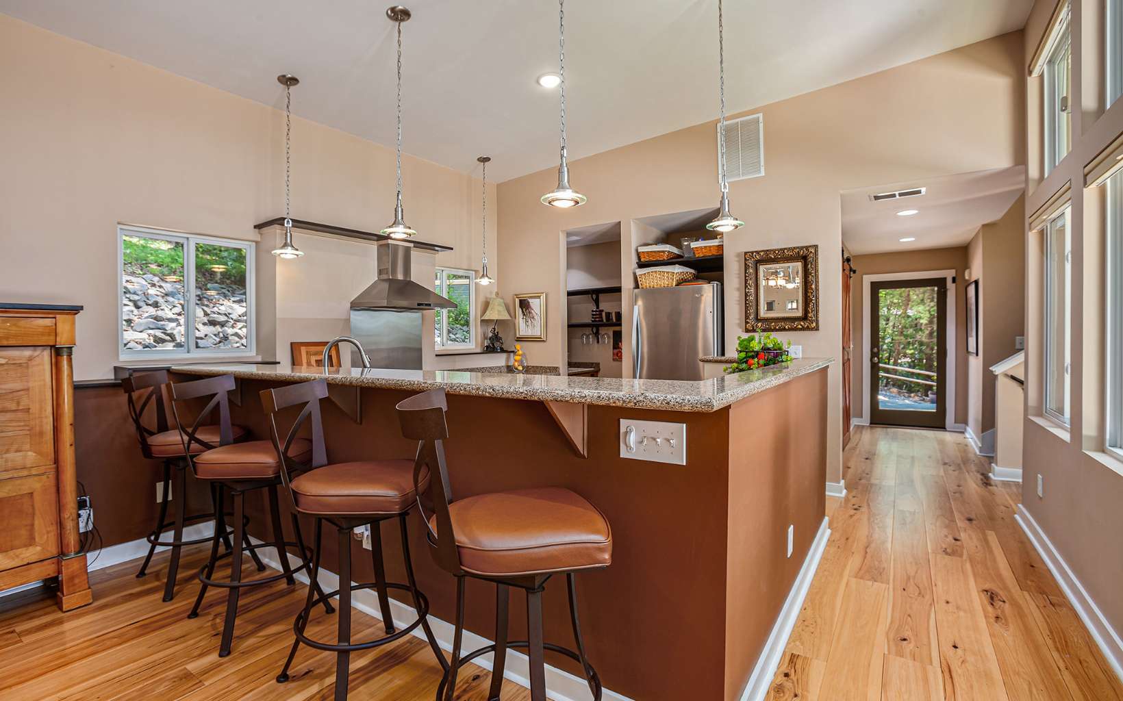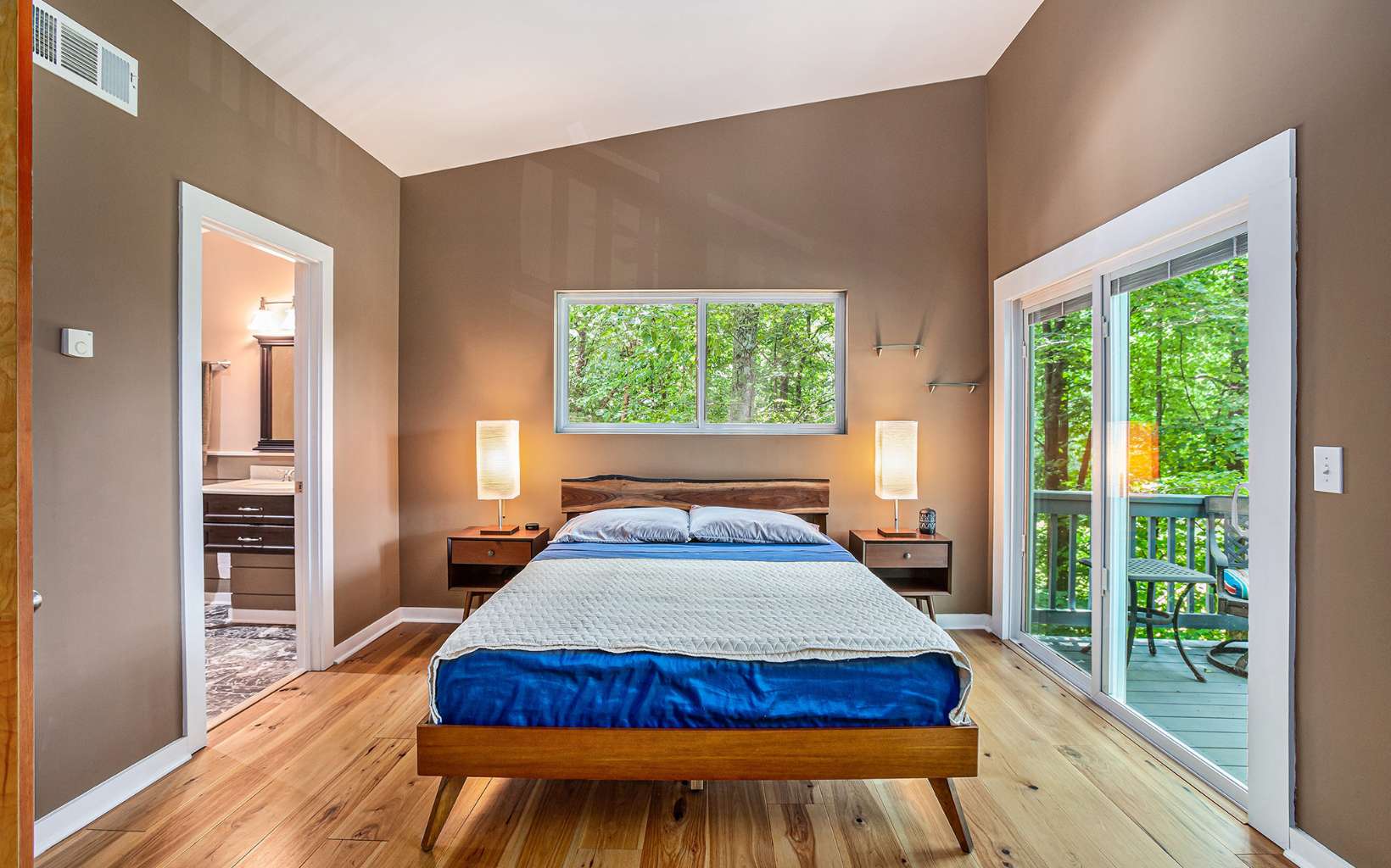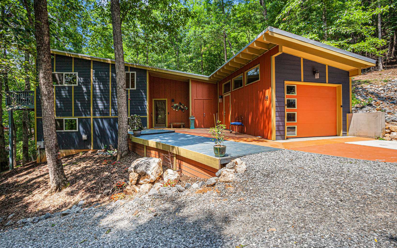 Back on market at no fault of seller or property! Discover the epitome of mountain modern living in this remarkable home. This property offers awe-inspiring mountain views, a rolling meadow, and is just 15 minutes from Lowes, Walmart, Ingles and eateries with high speed internet of up to 2 gigs of speed. Step inside & be greeted by an abundance of natural light flooding through 54 large windows. The open-style kitchen features ample countertop space, a large entertaining bar with stools, & brand new stainless steel appliances. Indulge in year-round relaxation in the enclosed sunroom with floor-to-ceiling windows, or unwind in the fenced-in stamped concrete patio area in the front yard, surrounded by nature. The living room boasts tall ceilings & panoramic windows, allowing you to immerse yourself in the tranquil mountain atmosphere. Two spacious bedrooms offer comfort, while radiant floor heating and hardwood & tile flooring add a touch of luxury. The thoughtfully designed bathrooms provide the perfect place to unwind. The laundry room, complete with a half bath, offers convenience & space. With an attached garage and an oversized detached garage featuring epoxy floors, finished walls, & a 220-volt outlet for electric car charging, this property caters to car enthusiasts. Enjoy the fresh mountain air and breathtaking views from the new deck at the front of the house. Hardwood flooring spans all three levels, while the bathrooms and laundry area feature elegant tile flooring.