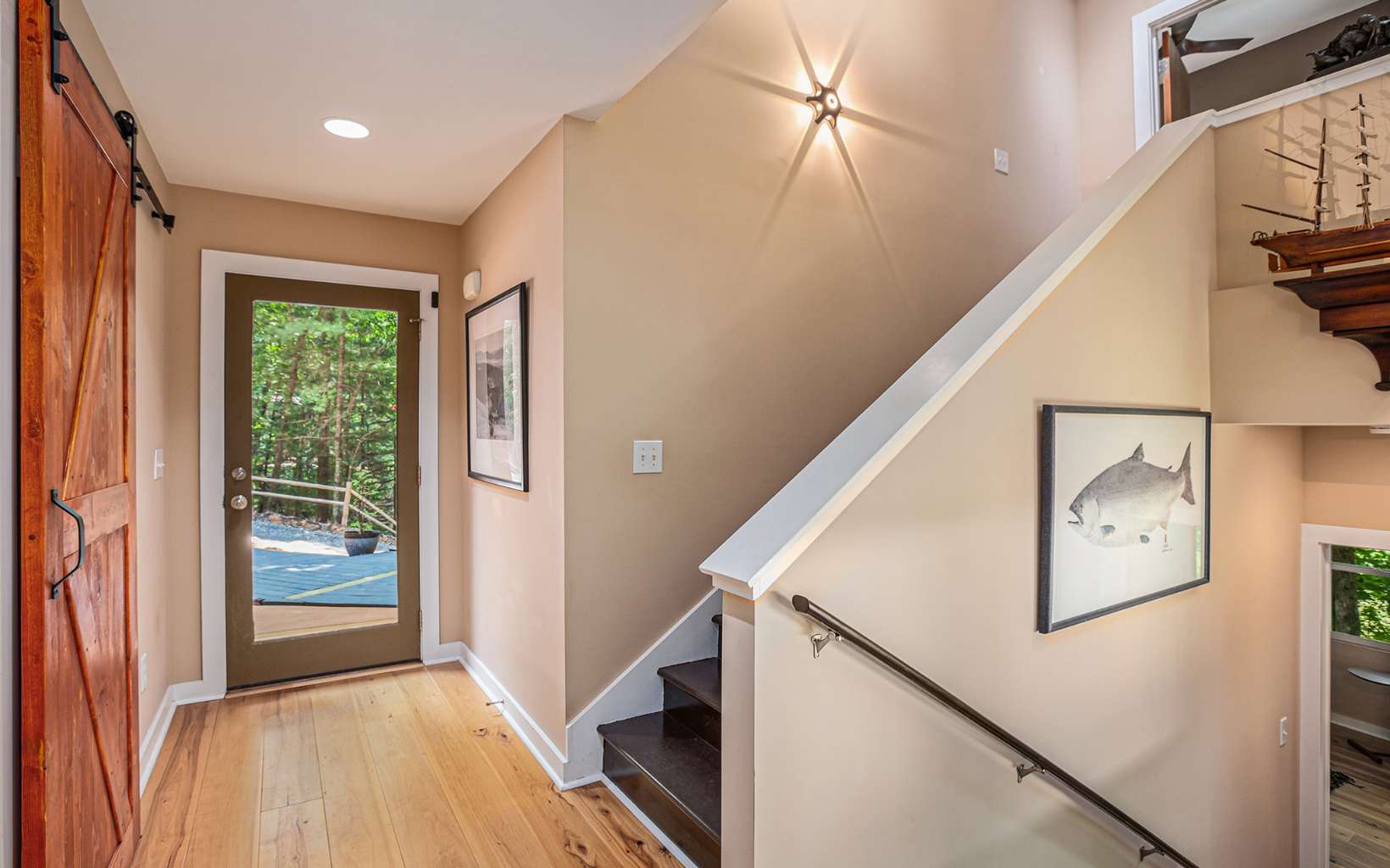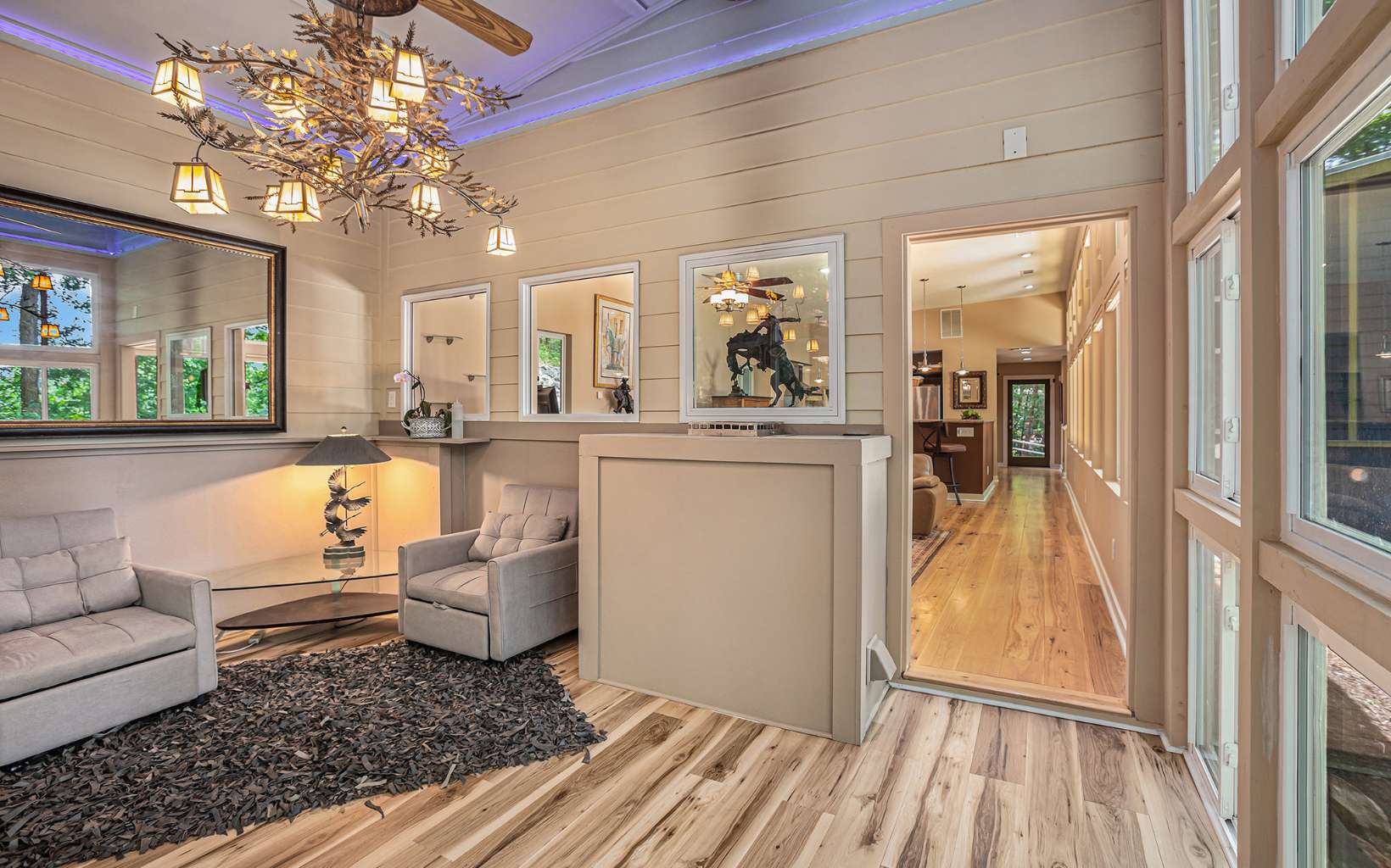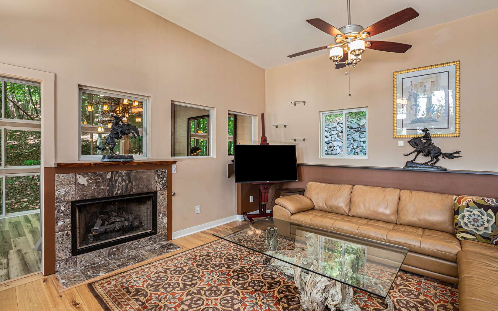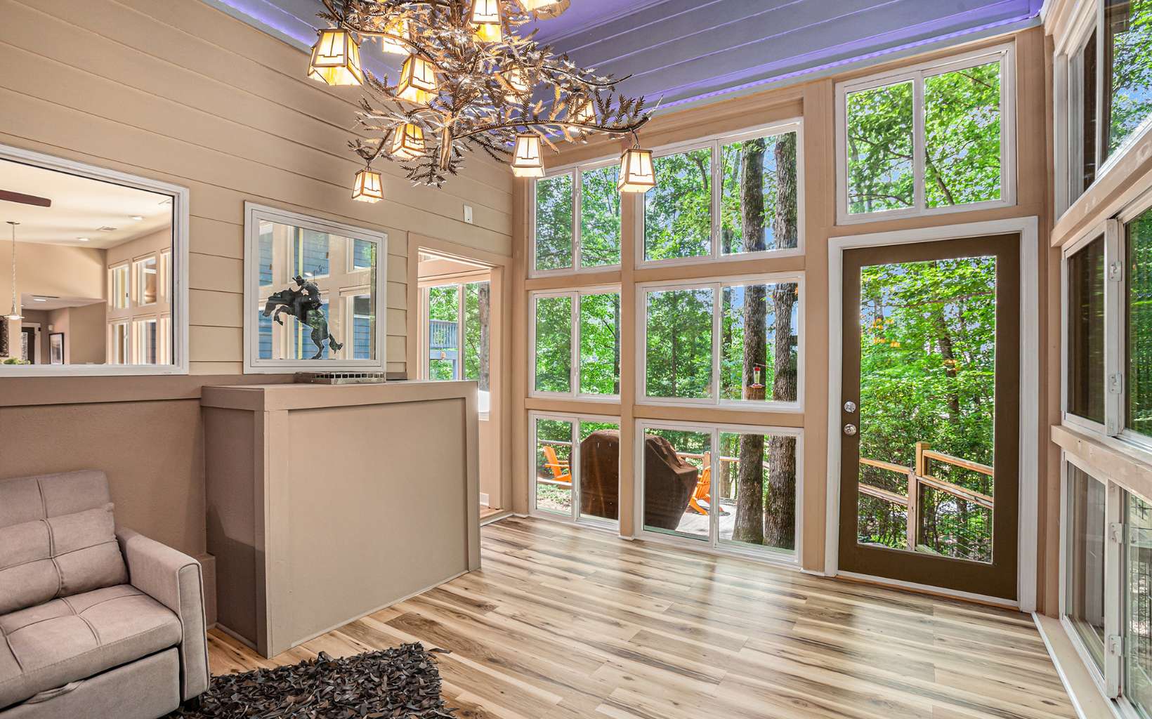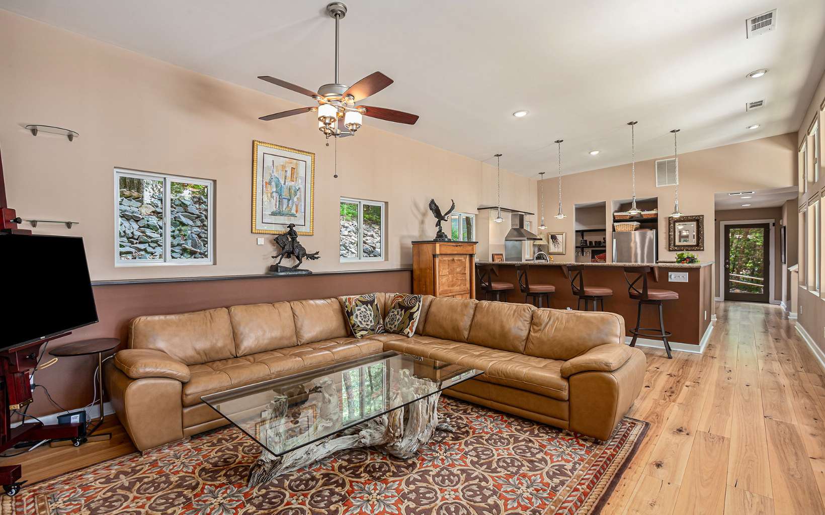 Back on market at no fault of seller or property! Discover the epitome of mountain modern living in this remarkable home. This property offers awe-inspiring mountain views, a rolling meadow, and is just 15 minutes from Lowes, Walmart, Ingles and eateries with high speed internet of up to 2 gigs of speed. Step inside & be greeted by an abundance of natural light flooding through 54 large windows. The open-style kitchen features ample countertop space, a large entertaining bar with stools, & brand new stainless steel appliances. Indulge in year-round relaxation in the enclosed sunroom with floor-to-ceiling windows, or unwind in the fenced-in stamped concrete patio area in the front yard, surrounded by nature. The living room boasts tall ceilings & panoramic windows, allowing you to immerse yourself in the tranquil mountain atmosphere. Two spacious bedrooms offer comfort, while radiant floor heating and hardwood & tile flooring add a touch of luxury. The thoughtfully designed bathrooms provide the perfect place to unwind. The laundry room, complete with a half bath, offers convenience & space. With an attached garage and an oversized detached garage featuring epoxy floors, finished walls, & a 220-volt outlet for electric car charging, this property caters to car enthusiasts. Enjoy the fresh mountain air and breathtaking views from the new deck at the front of the house. Hardwood flooring spans all three levels, while the bathrooms and laundry area feature elegant tile flooring.