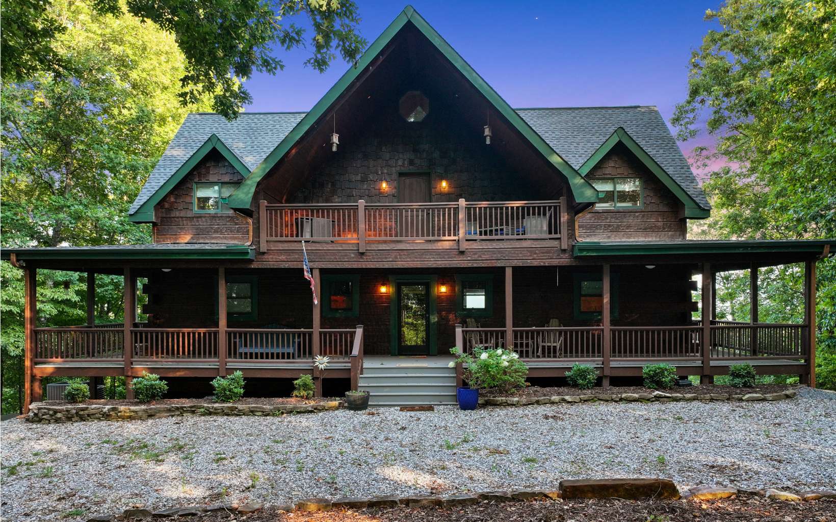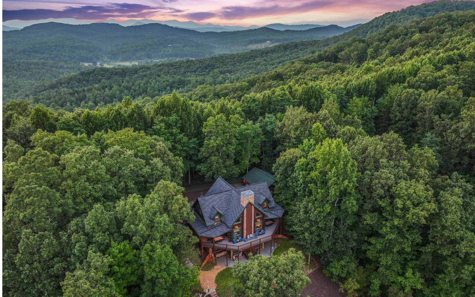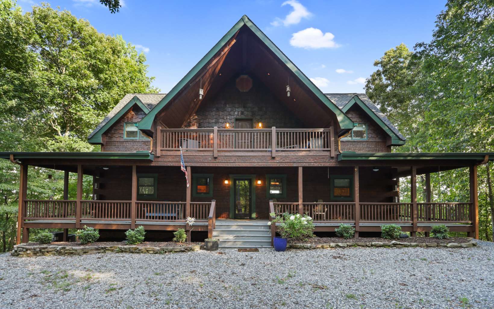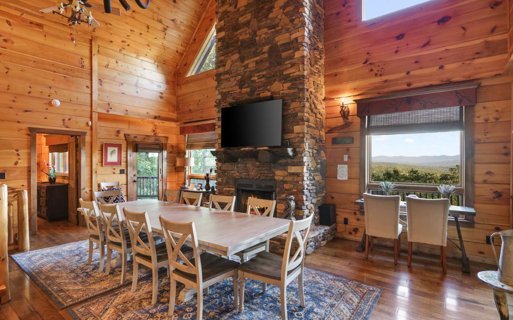 Luxury lodge style retreat completely updated with 180 degree Long range mountain views – offered turnkey!! Paved road access with circular drive and plenty of parking, and easily accommodating up to 18 guests, this 6 bedroom plus bunk house is the ultimate true log mountain escape! Upscale finishes and designer touches throughout with a comfortable layout including 2 primary suites on main. With views from every room and wrap around porches and multi-level decks there are plenty of gathering areas inside and out. Massive floor to ceiling stone fireplaces (one that can be converted to wood burning, oversized bedrooms, huge open loft space with private balcony and impressive terrace level great room with 12ft ceilings and wet bar. Entertainers dream with large indoor and outdoor dining options, and amazing new fire pit area off the terrace level patio. Meticulously maintained and recent updates that include whole house staining, new roof, fire pit, appliances, updated dual HVAC system, and 3 car oversized garage finished as additional great room space with game room, TV and AC system! New TV in each bedroom and the two story bunkhouse with additional great room and bunk beds is a must see! Power for EV hookup and high speed internet with easy access to all things Blue Ridge has to offer including the Toccoa River, Lake Blue Ridge, golf, shopping, dining and more. Incredible luxury rental potential!