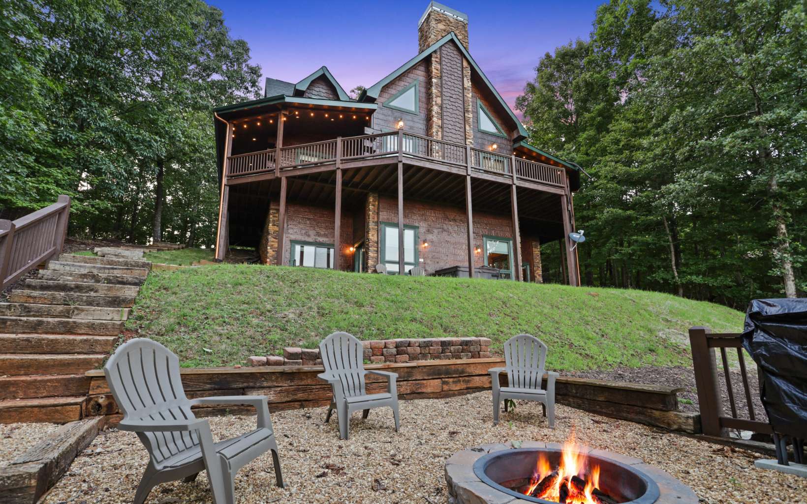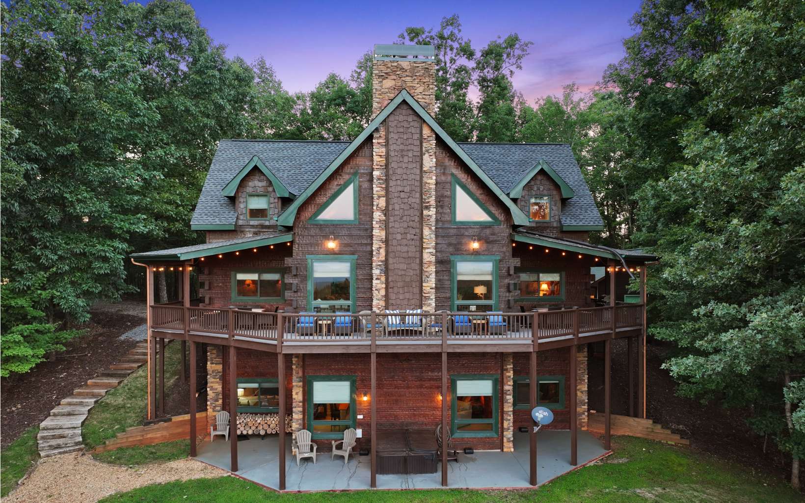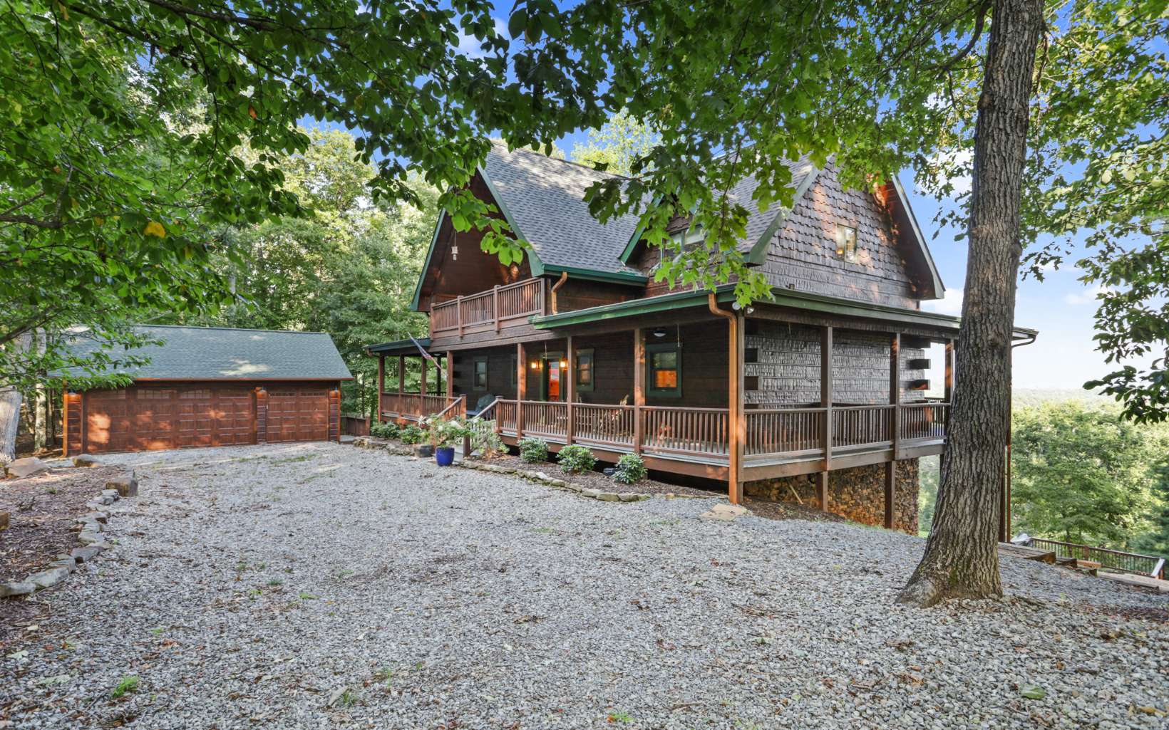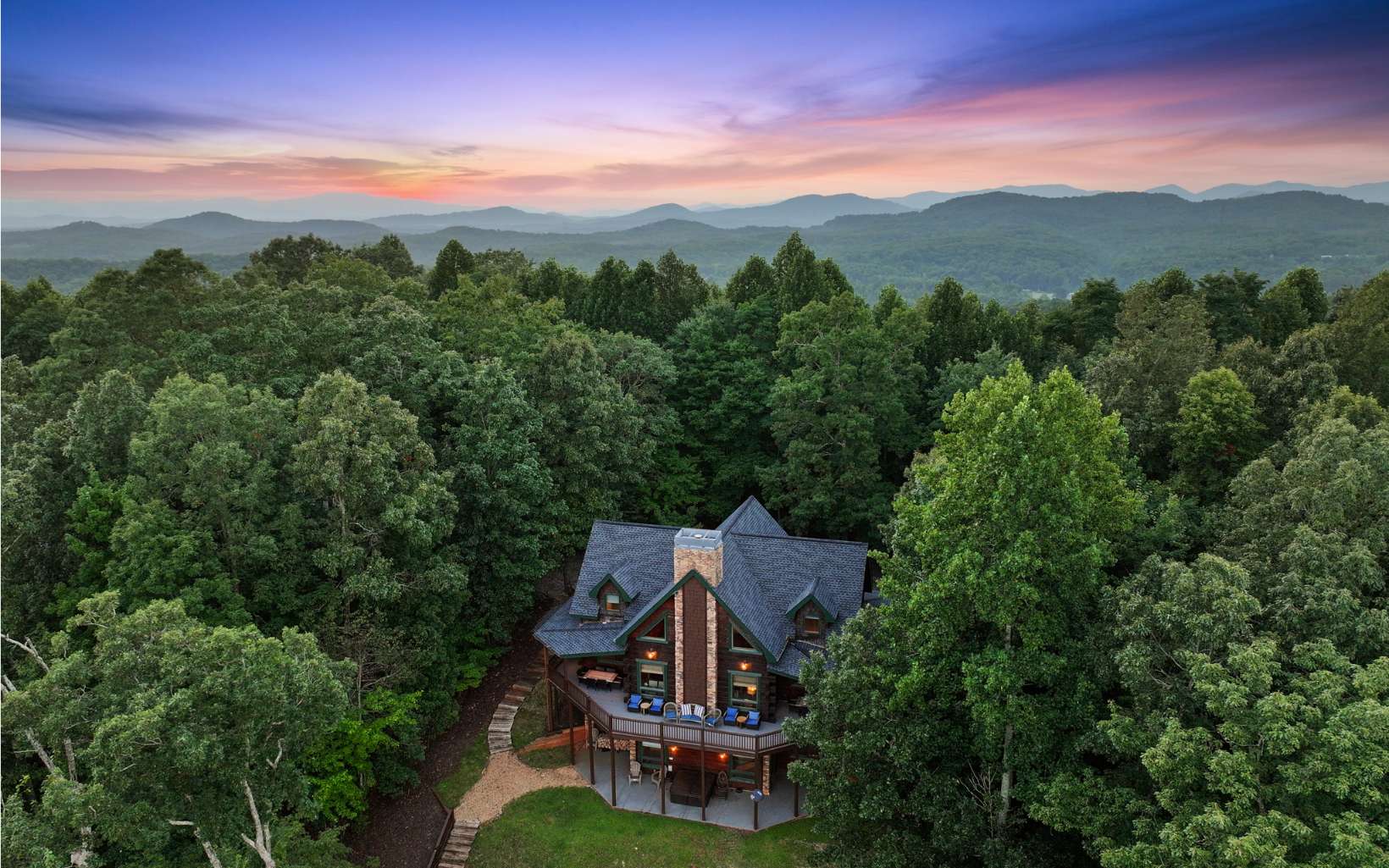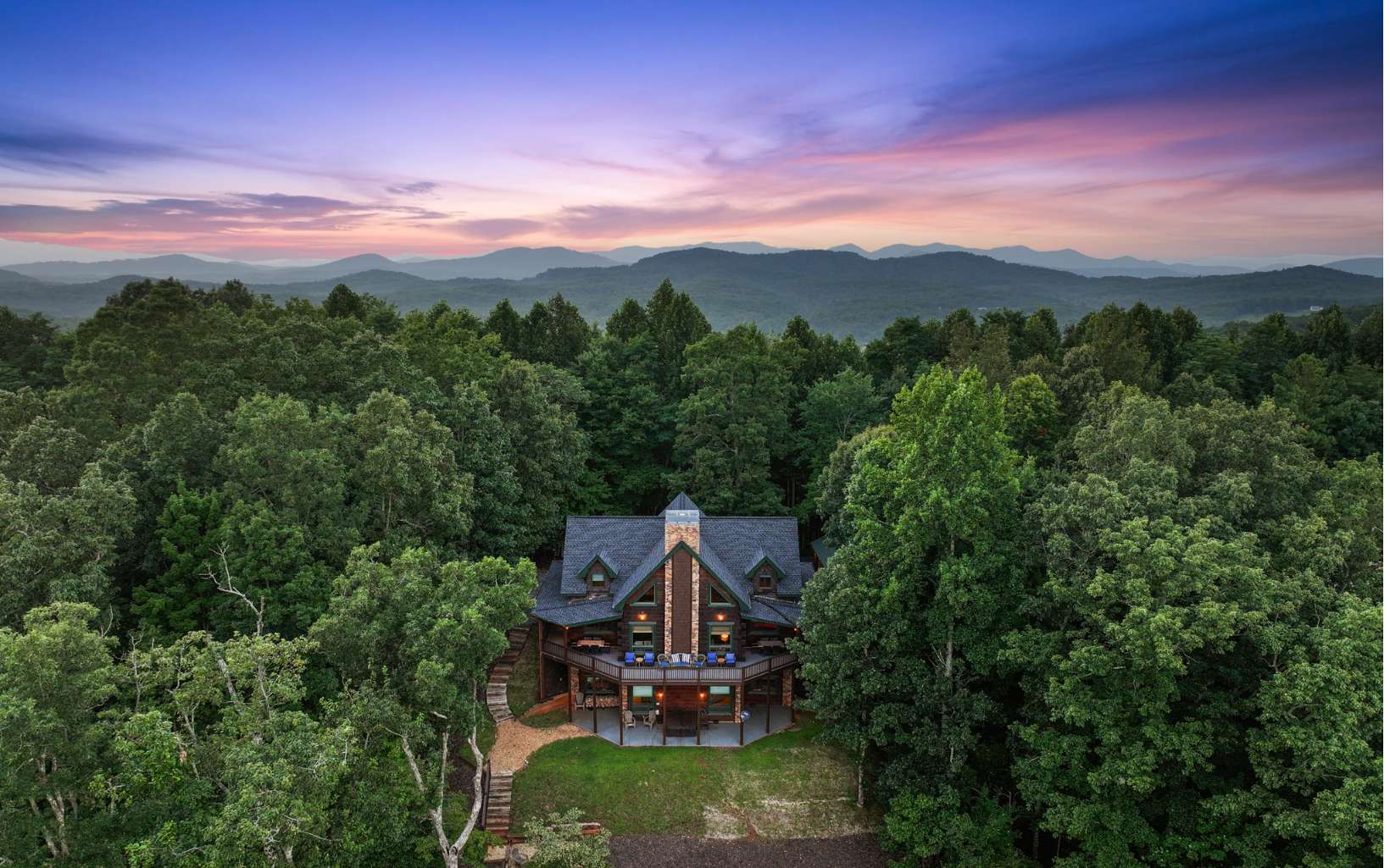Luxury lodge style retreat completely updated with 180 degree Long range mountain views – offered turnkey!! Paved road access with circular drive and plenty of parking, and easily accommodating up to 18 guests, this 6 bedroom plus bunk house is the ultimate true log mountain escape! Upscale finishes and designer touches throughout with a comfortable layout including 2 primary suites on main. With views from every room and wrap around porches and multi-level decks there are plenty of gathering areas inside and out. Massive floor to ceiling stone fireplaces (one that can be converted to wood burning, oversized bedrooms, huge open loft space with private balcony and impressive terrace level great room with 12ft ceilings and wet bar. Entertainers dream with large indoor and outdoor dining options, and amazing new fire pit area off the terrace level patio. Meticulously maintained and recent updates that include whole house staining, new roof, fire pit, appliances, updated dual HVAC system, and 3 car oversized garage finished as additional great room space with game room, TV and AC system! New TV in each bedroom and the two story bunkhouse with additional great room and bunk beds is a must see! Power for EV hookup and high speed internet with easy access to all things Blue Ridge has to offer including the Toccoa River, Lake Blue Ridge, golf, shopping, dining and more. Incredible luxury rental potential!