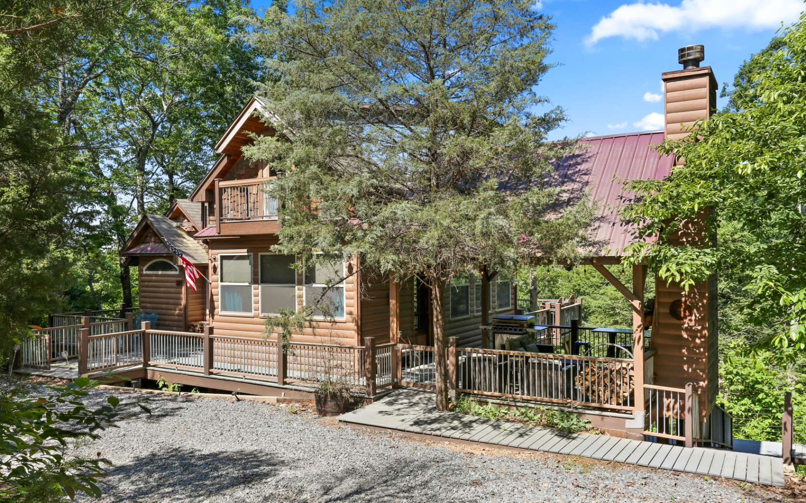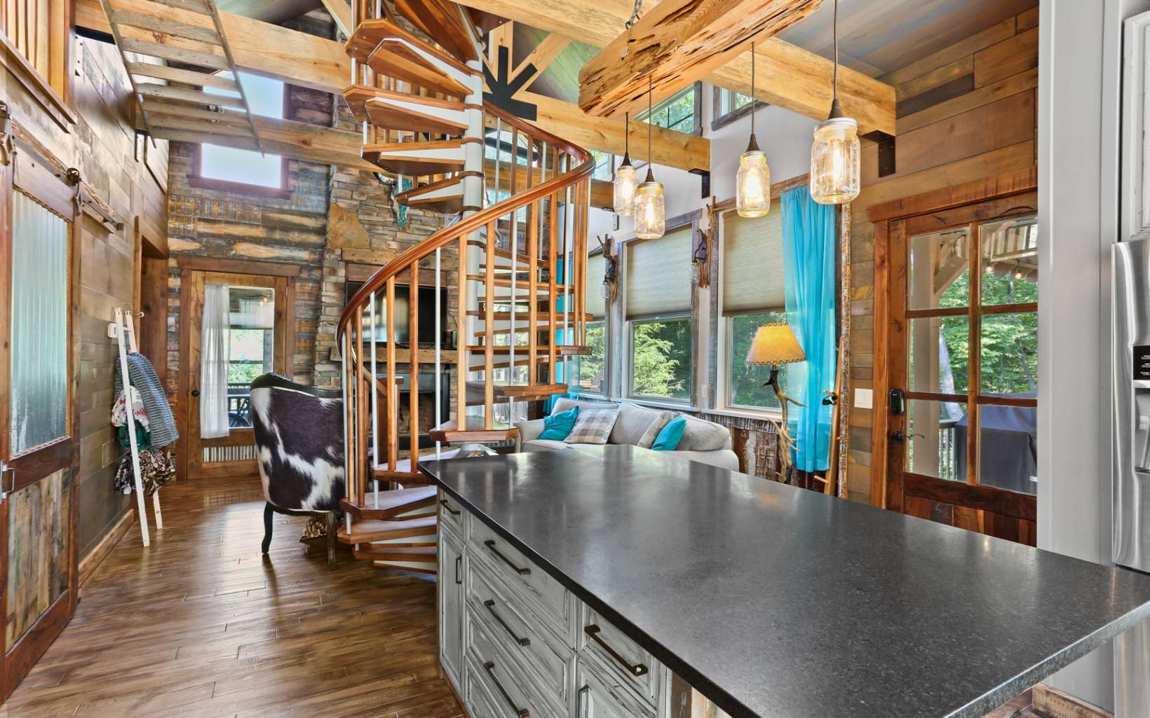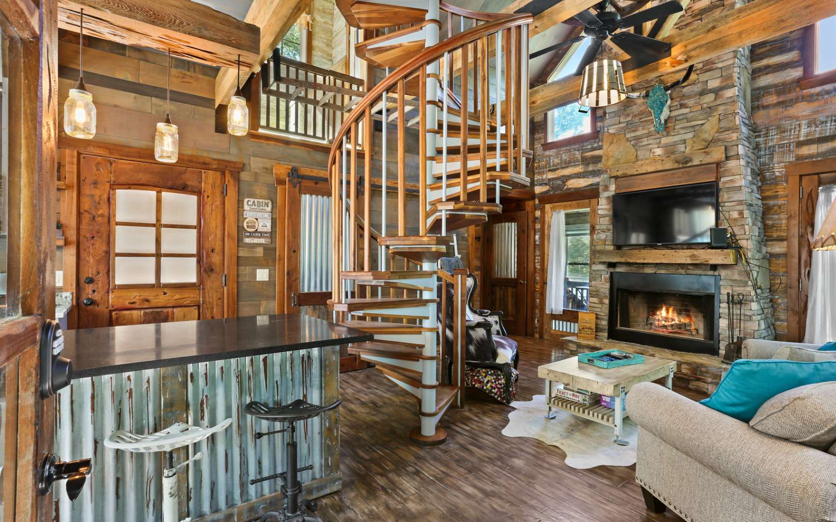 Welcome to Whimsy Way Chalet! Stepping into this chalet is a truly unique and creative experience! The blend of rustic and artistic elements, such as barrels, tin, rock, and various unique woods, creates an enchanting atmosphere. The cabin's design reflects imagination and practicality, offering a cozy and charming space. One of the highlights of this chalet is its year-round mountain views, allowing you to enjoy breathtaking sunsets. The outdoor living spaces are extensive, including a large, covered porch with a fireplace and a fire pit for cozy gatherings. Additionally, there is an intriguing "Dr. Seuss style" outbuilding that could serve as a lounge area and even accommodate two people upstairs, adding to the cabin's charm. Additionally, a hot tub is on the deck, further enhancing the outdoor experience. Inside, the kitchen has been upgraded, providing modern amenities for convenience. The cabin is available completely furnished, saving you the hassle of finding furniture and décor. The second bedroom on the top floor, accessible by spiral staircase features a full bathroom with a barrel entrance and Juliette Balcony adding a touch of whimsy. The lower level of the chalet offers a wet bar, pool table and a half bathroom, perfect for entertaining guests. This space could be configured as a third bedroom. It's worth noting that the original cabin was built in 1995 as a master suite, and a recent addition and remodel were completed in 2020. With its unique design and appeali