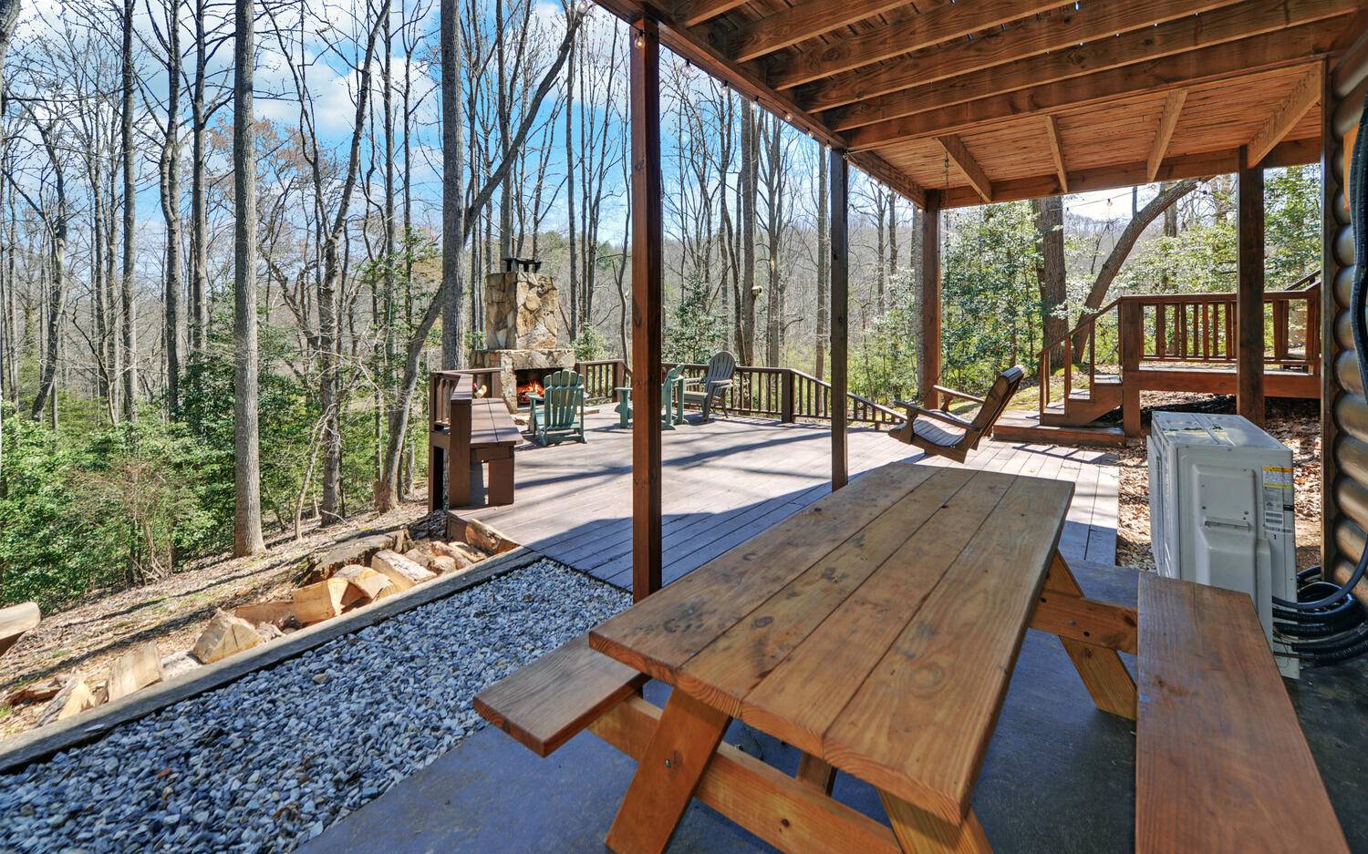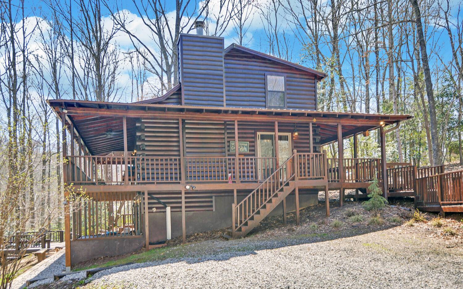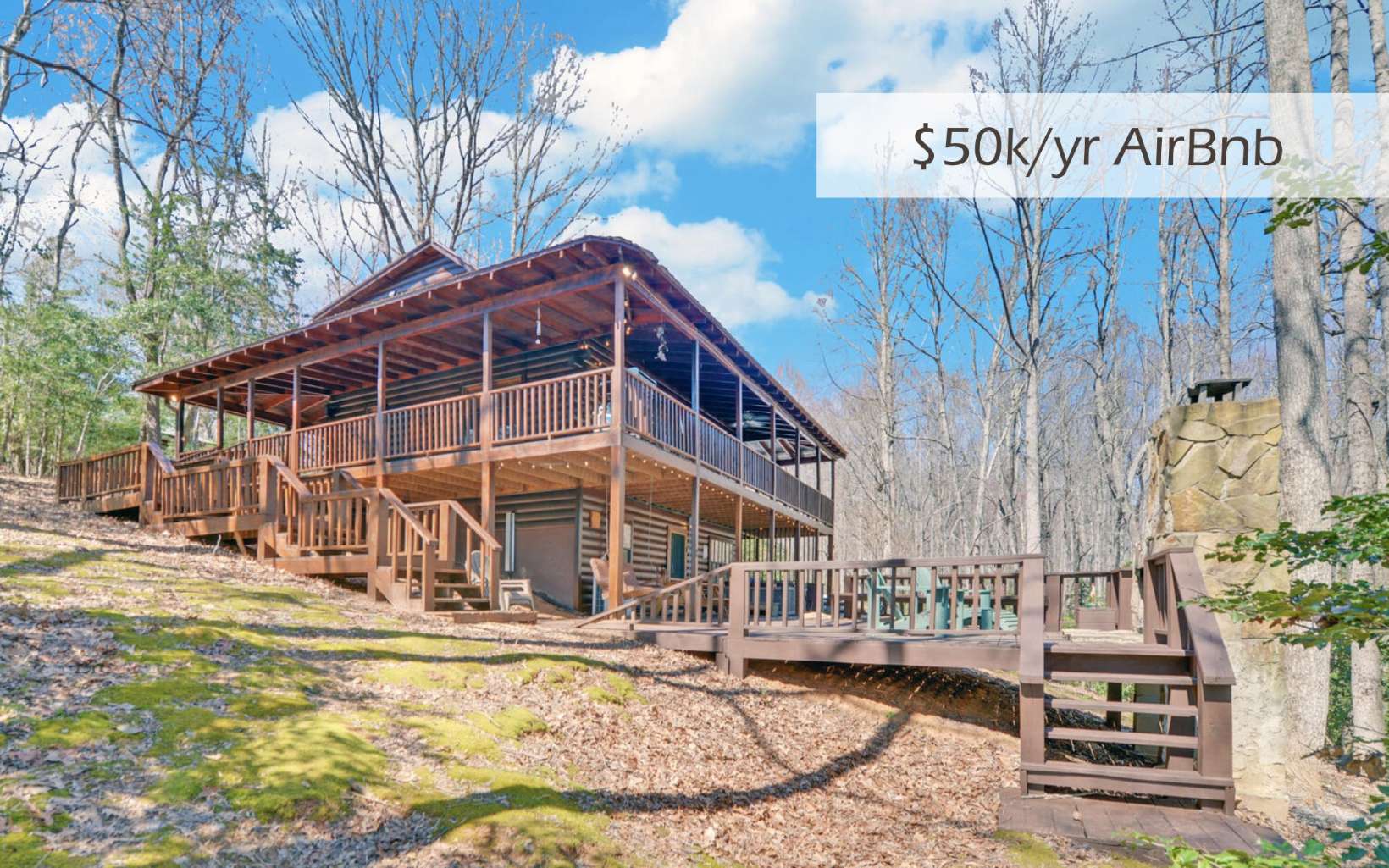Cash Cow Rental...5 Star Vacation Home~$50K/year! Fully-furnished, turn-key, log cabin feels worlds away from the hustle and bustle of life but is only a 10 minute drive into downtown Blairsville and 6 minutes from Lake Nottley Marina and a scenic 20 mile drive from Downtown Blue Ridge!Let this work horse pay for your mountain dream home! Walk across the large, wrap around porches into the home with soaring wood ceilings and a stone, gas-log fireplace. Main level includes exposed wooden beams throughout, master suite, and laundry. Master bathroom features custom, wooden cabinetry and accents. Granite counters, farmhouse sink, and stainless steel appliances in the kitchen, with plenty of room for a large dining table. Upstairs includes sleeping loft and a separate, private en-suite bedroom. Terrace-level boasts a private en-suite bedroom, a large rec-room with custom, built-in bunks, mini fridge, and a HVAC/mini split. Terrace-level opens out onto spectacular, outdoor living space with a spa hot tub and a custom, stone-built, wood-burning fireplace on a spacious, open deck to enjoy the close range mountain views and stargazing at night! Spot the deer, who pass by daily.Walk through your private wooded trails to the creek for a closer look at the horses.Detached,one-car garage perfect for all your mountain and lake toys! There's no place like this!Did I mention that it is a turn-key, fully furnished,money-making short-term rental with a full service rental agency!No drive-by's.