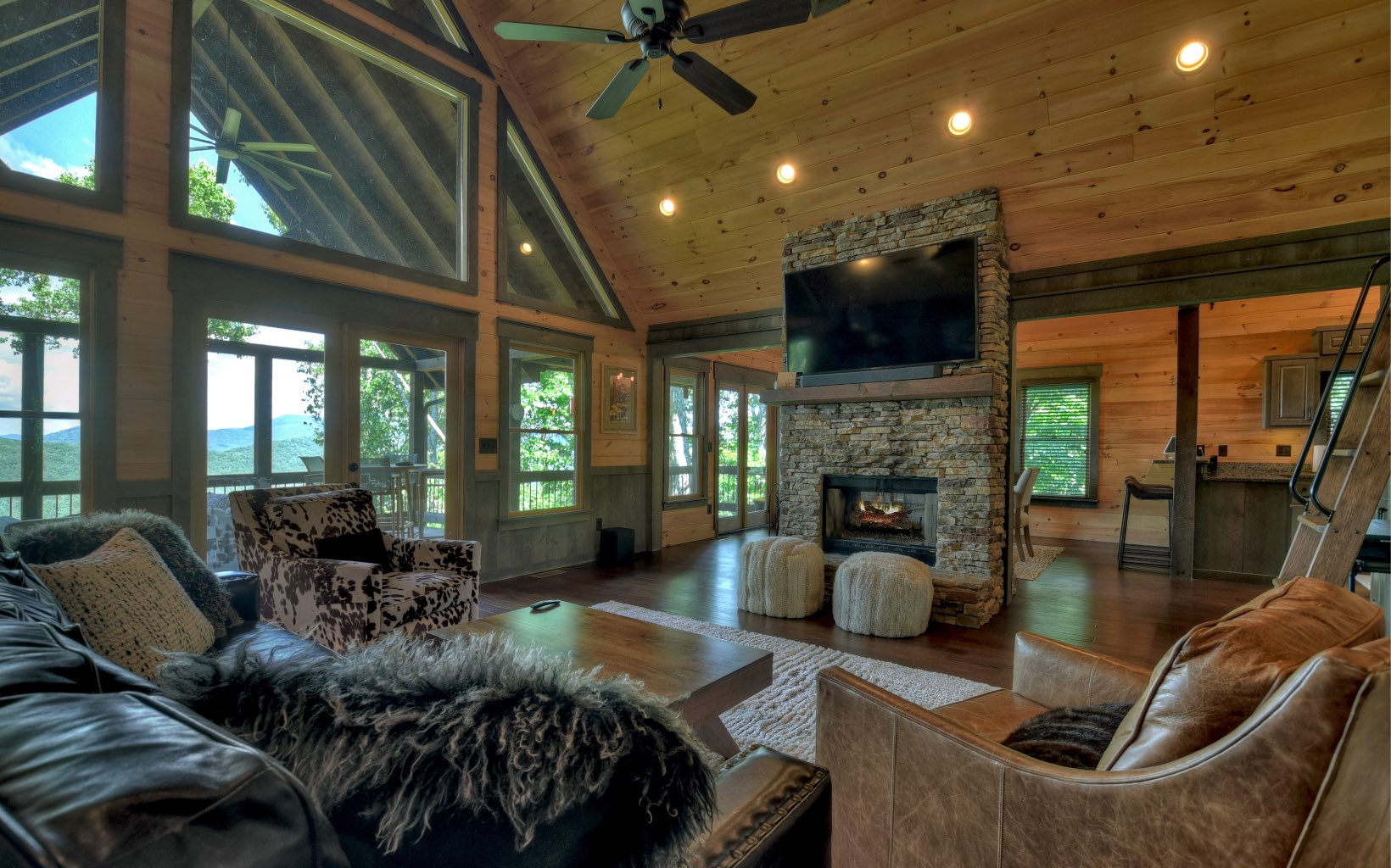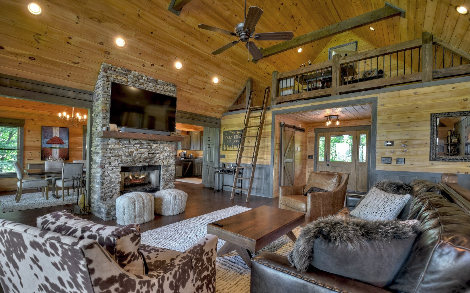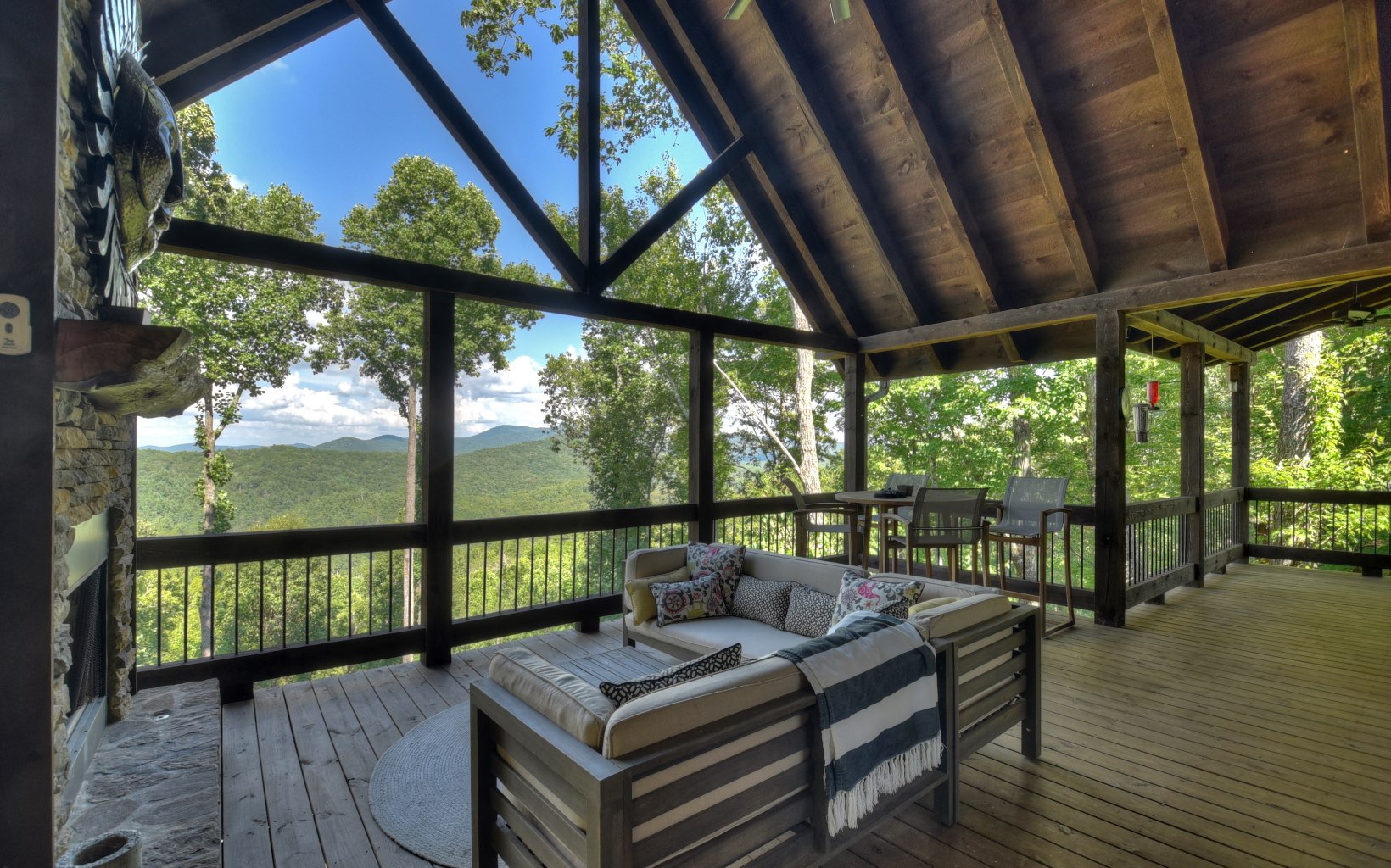 Untouched Long Range Mountain Views & Deeded Toccoa River Access in …Aska Adventure Area..A rare find indeed! Stunning like new rustic ranch home close to historic downtown BR & recreation areas, true craftsman quality with rustic flair & distinct detail...3 bedroom/3.5 bath + loft cabin is perched on large wooded tract with towering hardwoods & lush landscape, lavish living area boasts sky high ceilings & glass front with lovely loft, "see thru" fireplace in family/dining room, unique & warm industrial finishes, plentiful glass, custom cabinetry w/granite & stone counters & showers, upscale fixtures & free standing tub, finished terrace level w/wet bar & guest rooms w/private baths, massive stone fireplaces inside & on oversize "party porch", private deeded river access just a short walk away, fabulous firepit area, small end of road community w/ultimate privacy, convenient & tucked away…tastefully furnished and turn key for fab full time living or much needed getaway…great investment!