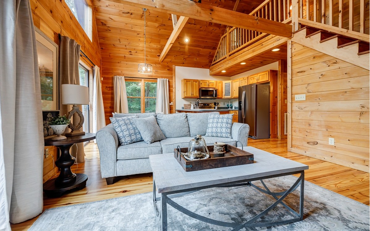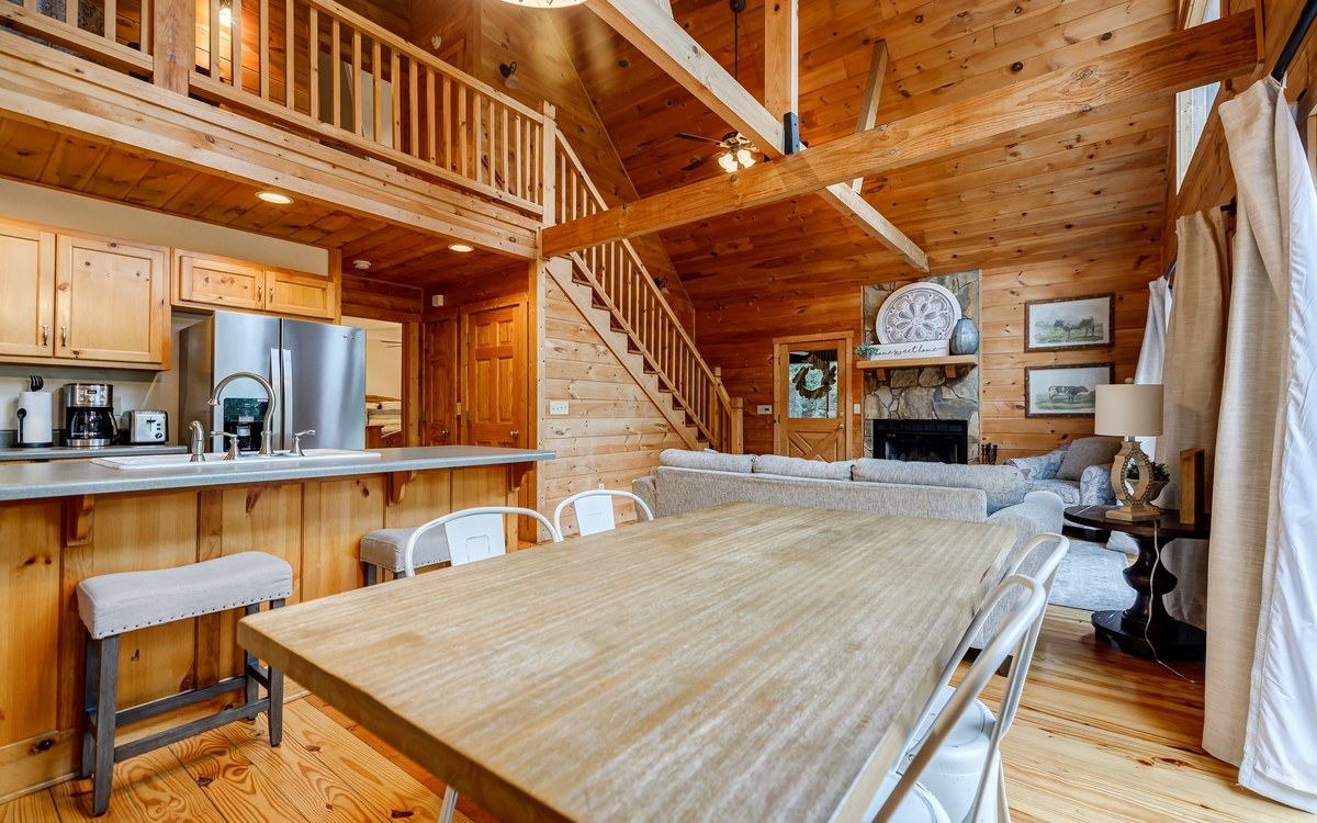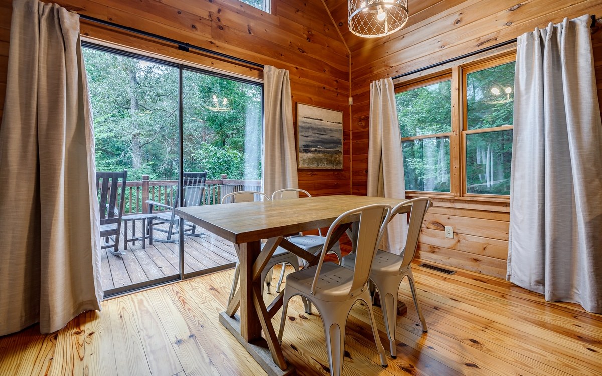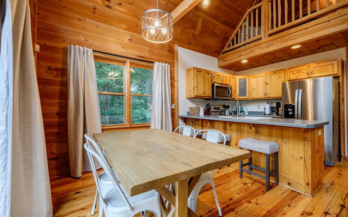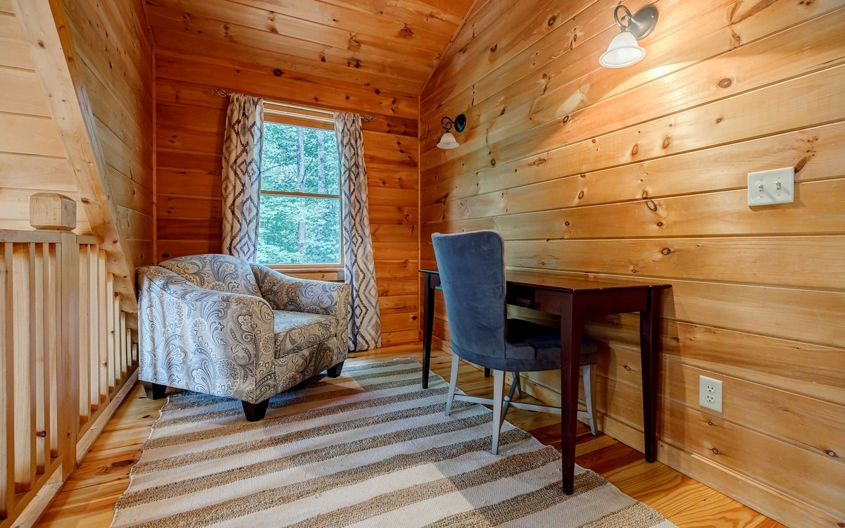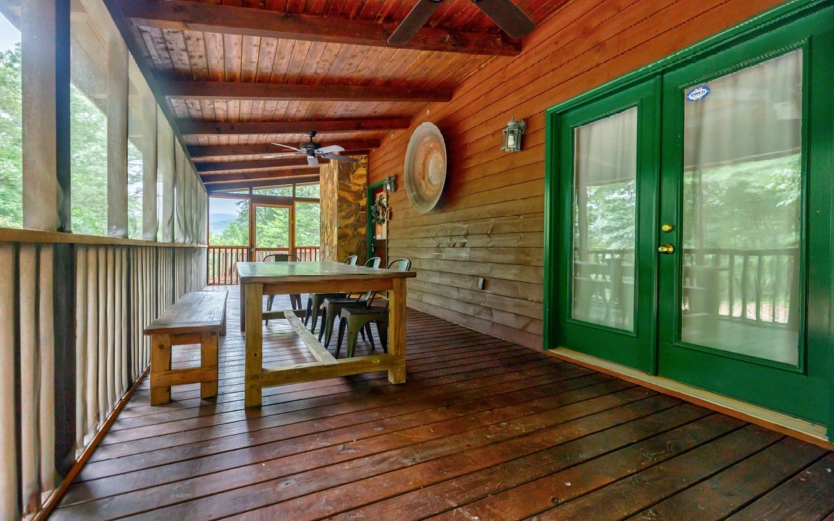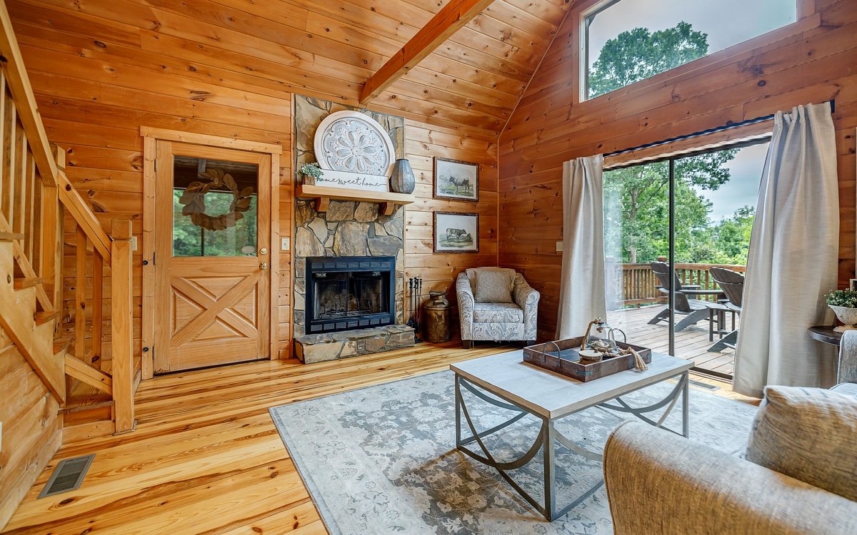 A large porch with year road mountain views is what a true mountain house is made of! This FULLY FURNISHED cabin is far enough away to enjoy the quiet seclusion of the mountains but only 15-20 minutes away from the hustle and bustle of quaint downtown Ellijay, rafting outfitters and many more orchards and vineyards. Two primary suits along with a second family room on the terrace level for movie/game night (don’t miss an intense round of Pac Man), full bath and bonus room also gives access to the hot tub and pathway to enjoy smores around the large fire pit. The main living level not only has an oversized porch with beautiful mountain view but also has a screened in porch already set for alfresco dinners under the stars. Wood burning, stacked stone fireplace is the perfect accent to the wood walls and cathedral ceiling. 2 sets of sliding glass doors and large windows in the peak bring light in on the wood beams and give the views you buy the property for! Both primary suites have private en suites and walk in closets on the main floor as well as upstairs along with a loft area, a perfect book nook. All furniture and accessories, chosen by a designer, are to stay with the cabin. The community also offers picnic tables, fire pit, pavilion and babbling brook with swings just a short walk from the property.