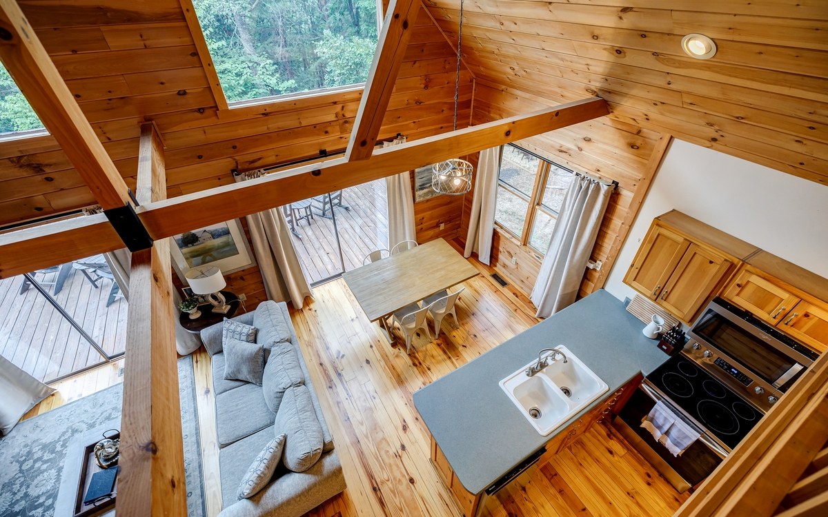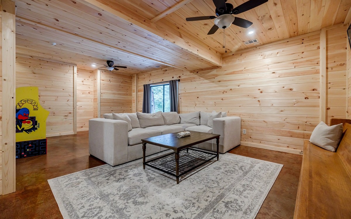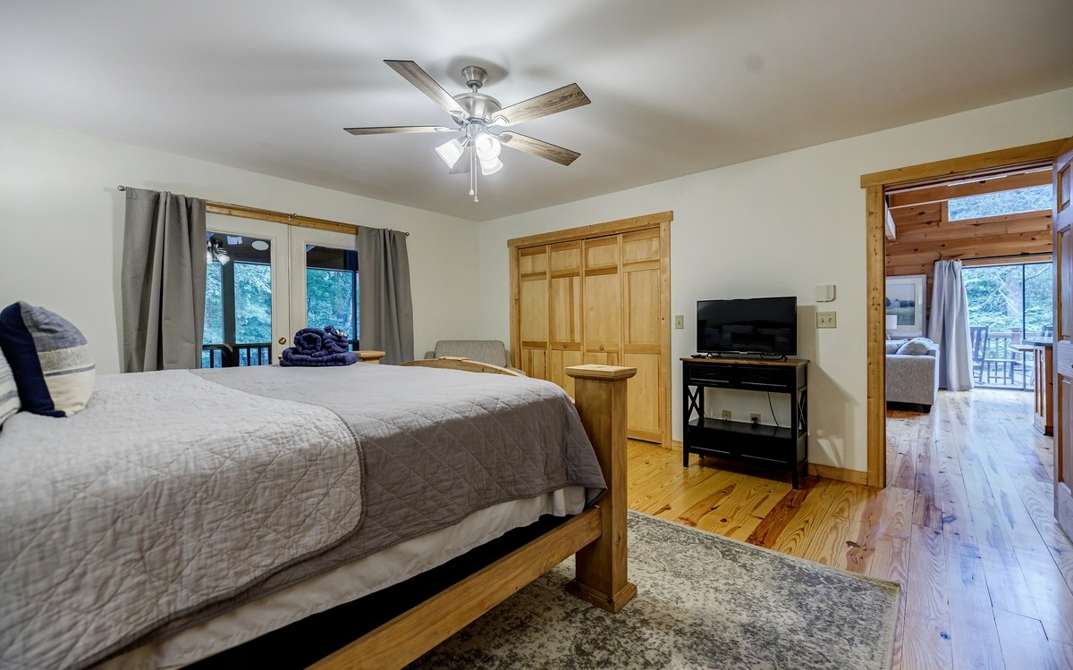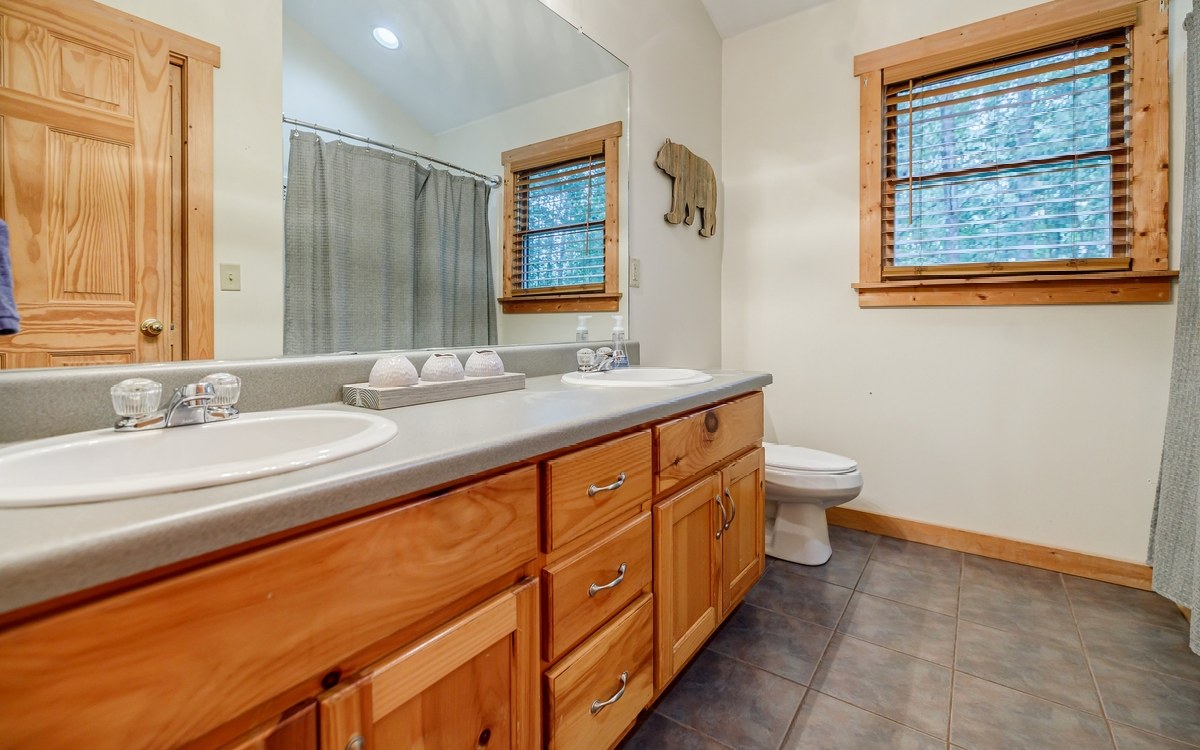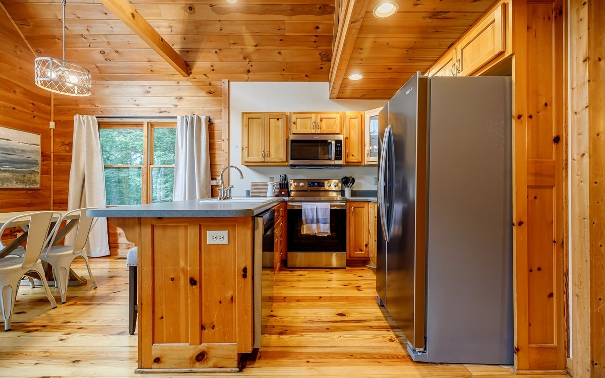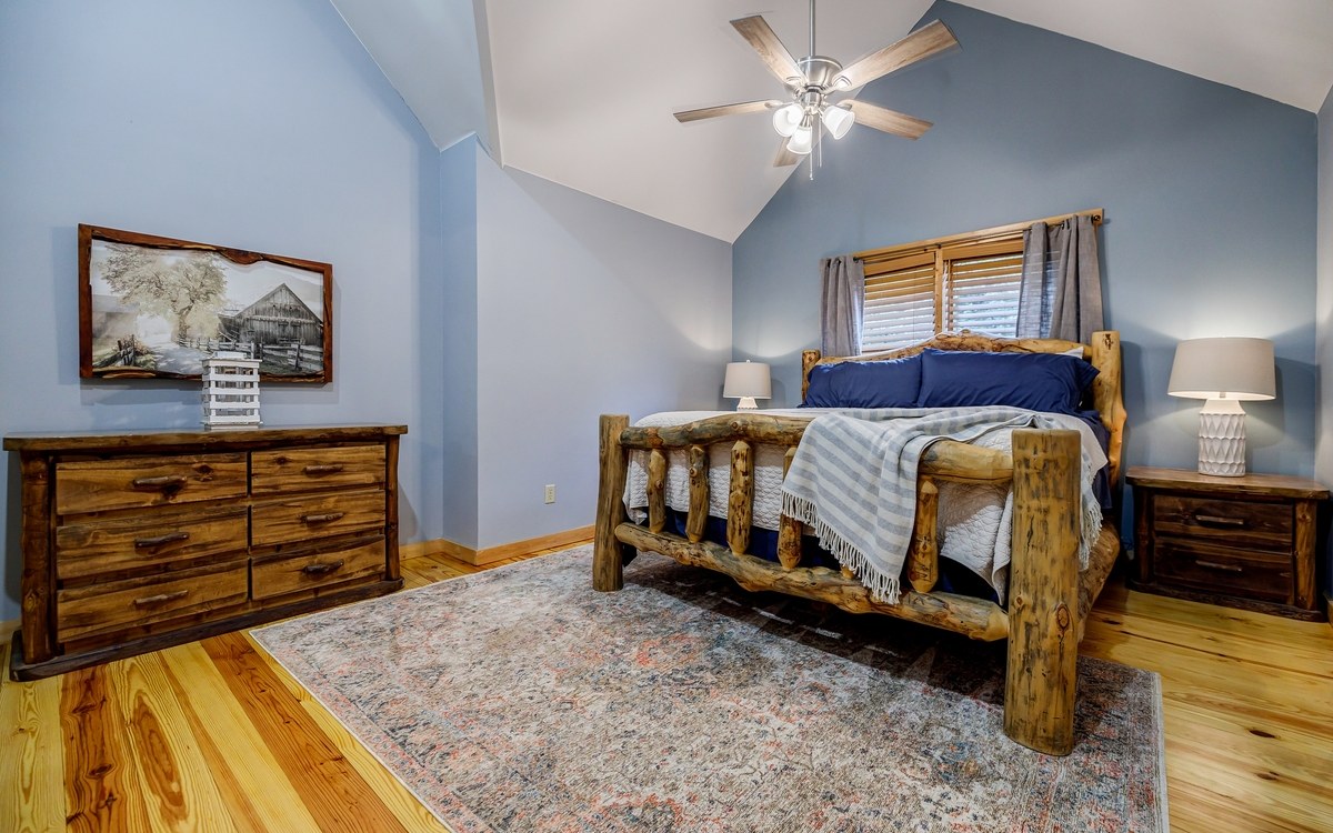 A large porch with year road mountain views is what a true mountain house is made of! This FULLY FURNISHED cabin is far enough away to enjoy the quiet seclusion of the mountains but only 15-20 minutes away from the hustle and bustle of quaint downtown Ellijay, rafting outfitters and many more orchards and vineyards. Two primary suits along with a second family room on the terrace level for movie/game night (don’t miss an intense round of Pac Man), full bath and bonus room also gives access to the hot tub and pathway to enjoy smores around the large fire pit. The main living level not only has an oversized porch with beautiful mountain view but also has a screened in porch already set for alfresco dinners under the stars. Wood burning, stacked stone fireplace is the perfect accent to the wood walls and cathedral ceiling. 2 sets of sliding glass doors and large windows in the peak bring light in on the wood beams and give the views you buy the property for! Both primary suites have private en suites and walk in closets on the main floor as well as upstairs along with a loft area, a perfect book nook. All furniture and accessories, chosen by a designer, are to stay with the cabin. The community also offers picnic tables, fire pit, pavilion and babbling brook with swings just a short walk from the property.