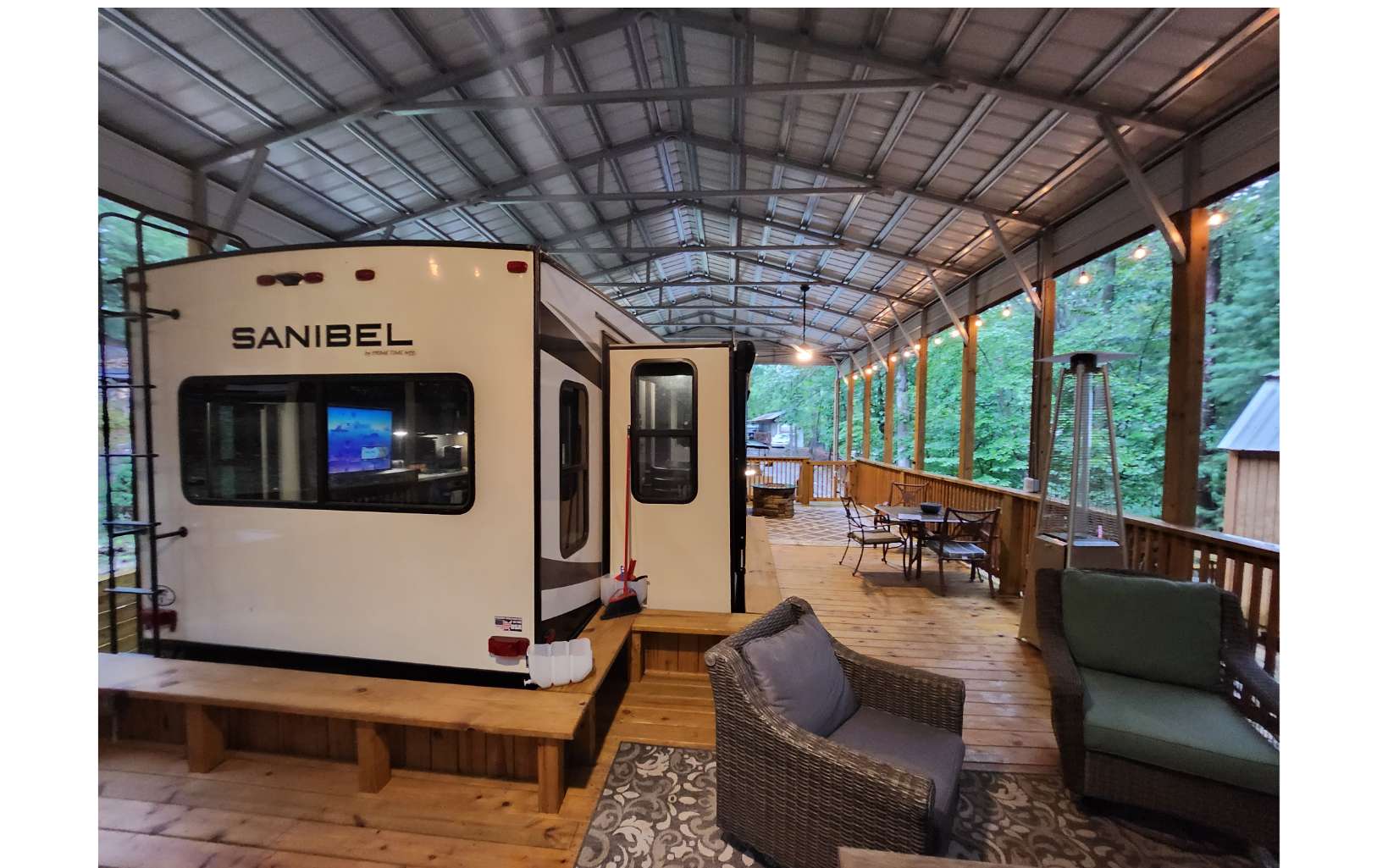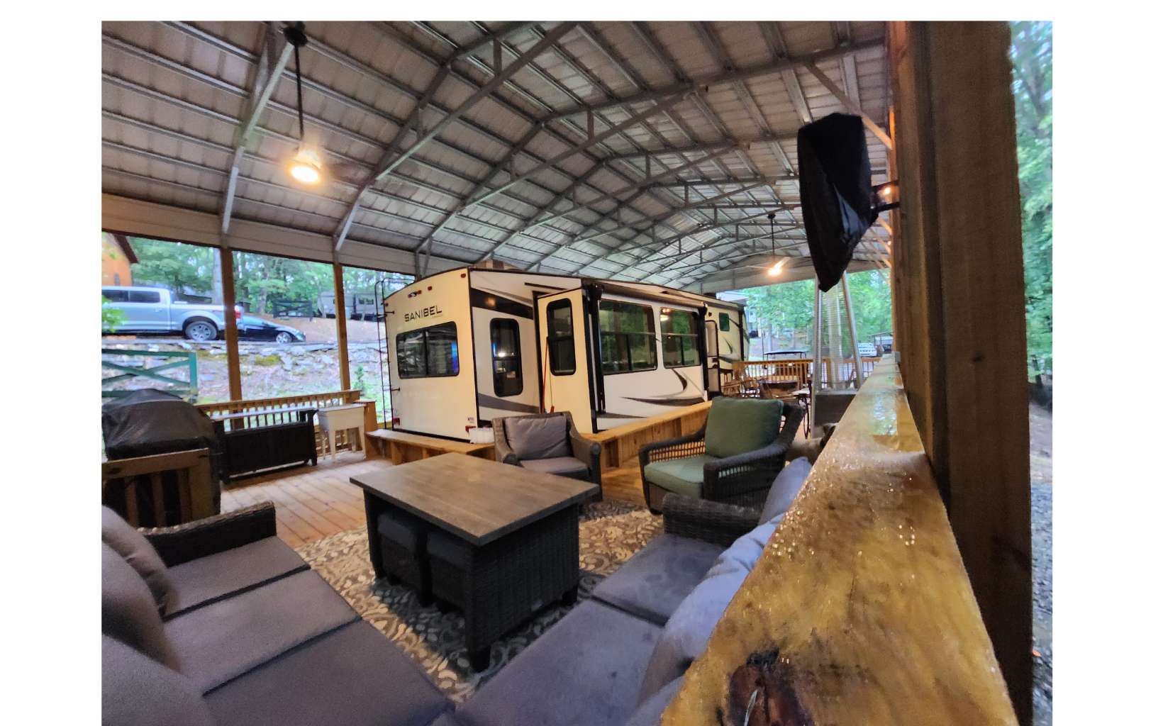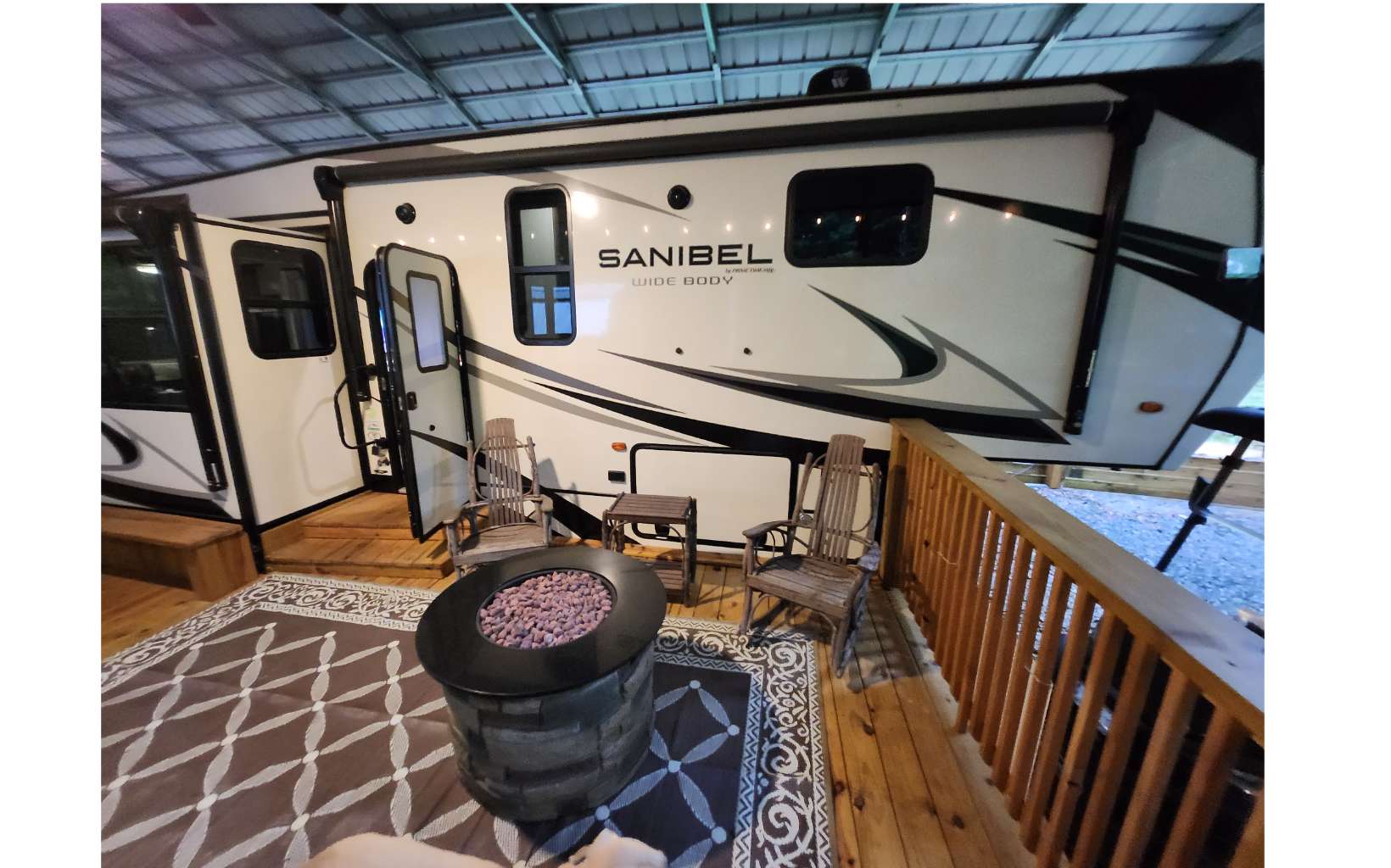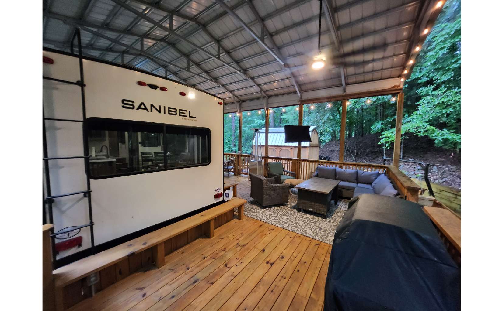 Amazing level RV lot in the beautiful Coosawattee River Resort has all the bells & whistles that few if any others provide. . Gorgeous green space panorama gives you an amazing & peaceful view. Full time or part time living. Just bring your toothbrush as everything you see stays. This like new 2021 Forest River Sanibel with all the works, along with some upgrades. Spectacular state of the art kitchen comes w/ full-size stainless steel appliances, large island & pantry. King bed in bedroom, queen pullout couch, reclining theatre seating, electric fireplace, bluetooth speakers, black out shades Washer/Dryer. Deck has gorgeous touches, w/ handrails and bench seating + 2 large fans, electrical outlets, lighting & outside tv and gas grill. Overlook the greenspace behind you with tons of wildlife. Don't forget to bring your camera! Bonus: Storage building with power. Upgraded 25x50 roof-over, with reinforced support brackets, NEW 51' x 25' covered roof over. See pics for the array of amazing Resort amenities