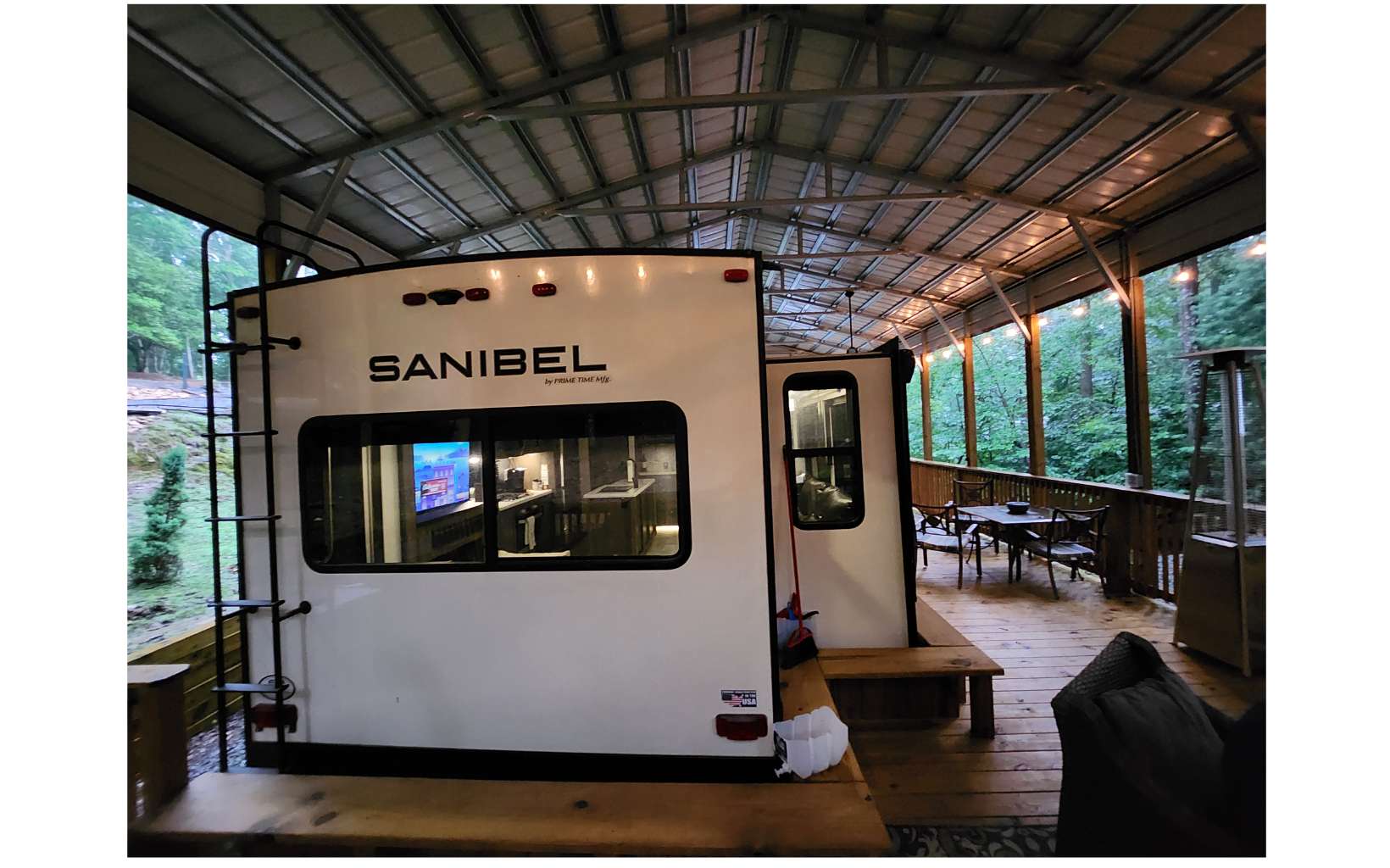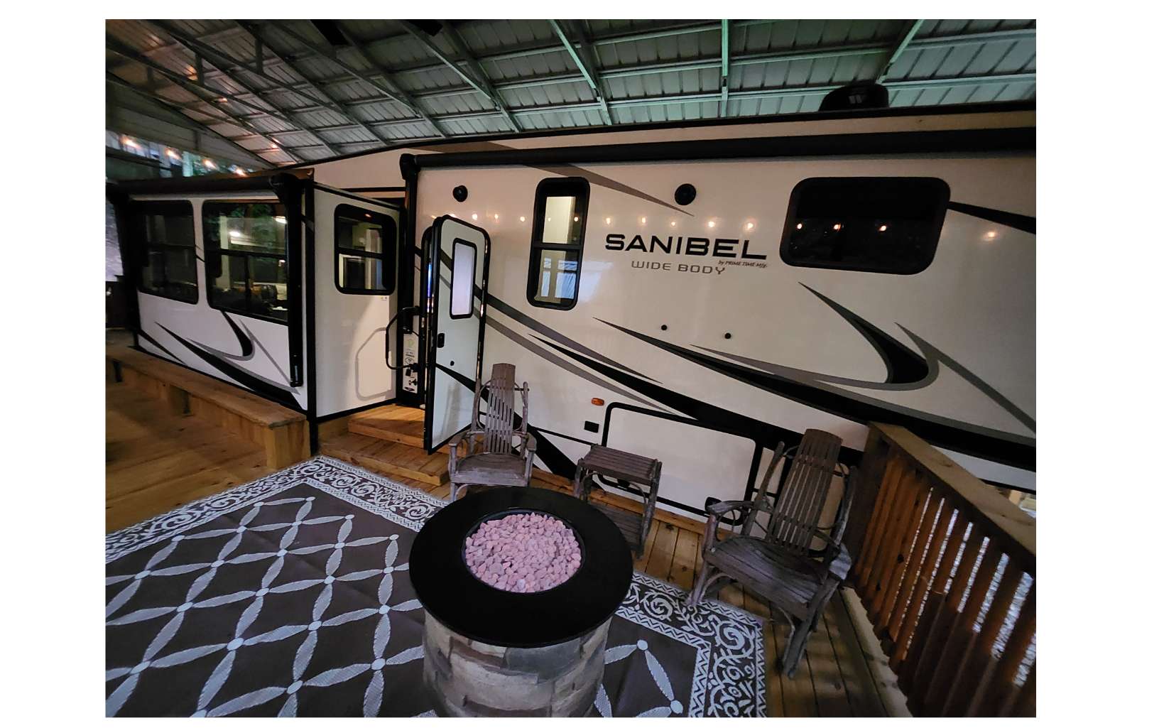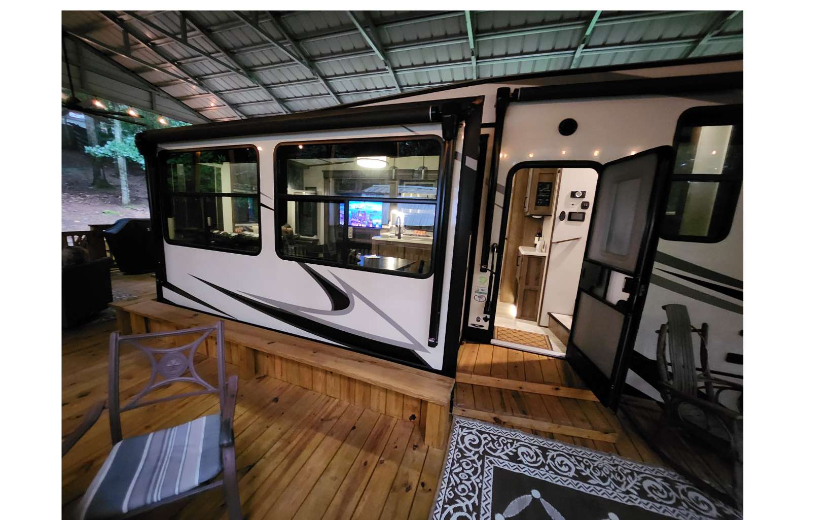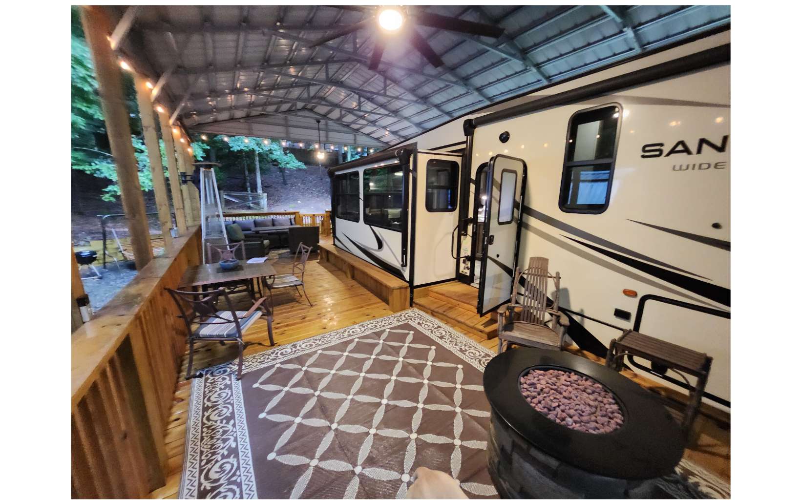 Amazing level RV lot in the beautiful Coosawattee River Resort has all the bells & whistles that few if any others provide. . Gorgeous green space panorama gives you an amazing & peaceful view. Full time or part time living. Just bring your toothbrush as everything you see stays. This like new 2021 Forest River Sanibel with all the works, along with some upgrades. Spectacular state of the art kitchen comes w/ full-size stainless steel appliances, large island & pantry. King bed in bedroom, queen pullout couch, reclining theatre seating, electric fireplace, bluetooth speakers, black out shades Washer/Dryer. Deck has gorgeous touches, w/ handrails and bench seating + 2 large fans, electrical outlets, lighting & outside tv and gas grill. Overlook the greenspace behind you with tons of wildlife. Don't forget to bring your camera! Bonus: Storage building with power. Upgraded 25x50 roof-over, with reinforced support brackets, NEW 51' x 25' covered roof over. See pics for the array of amazing Resort amenities