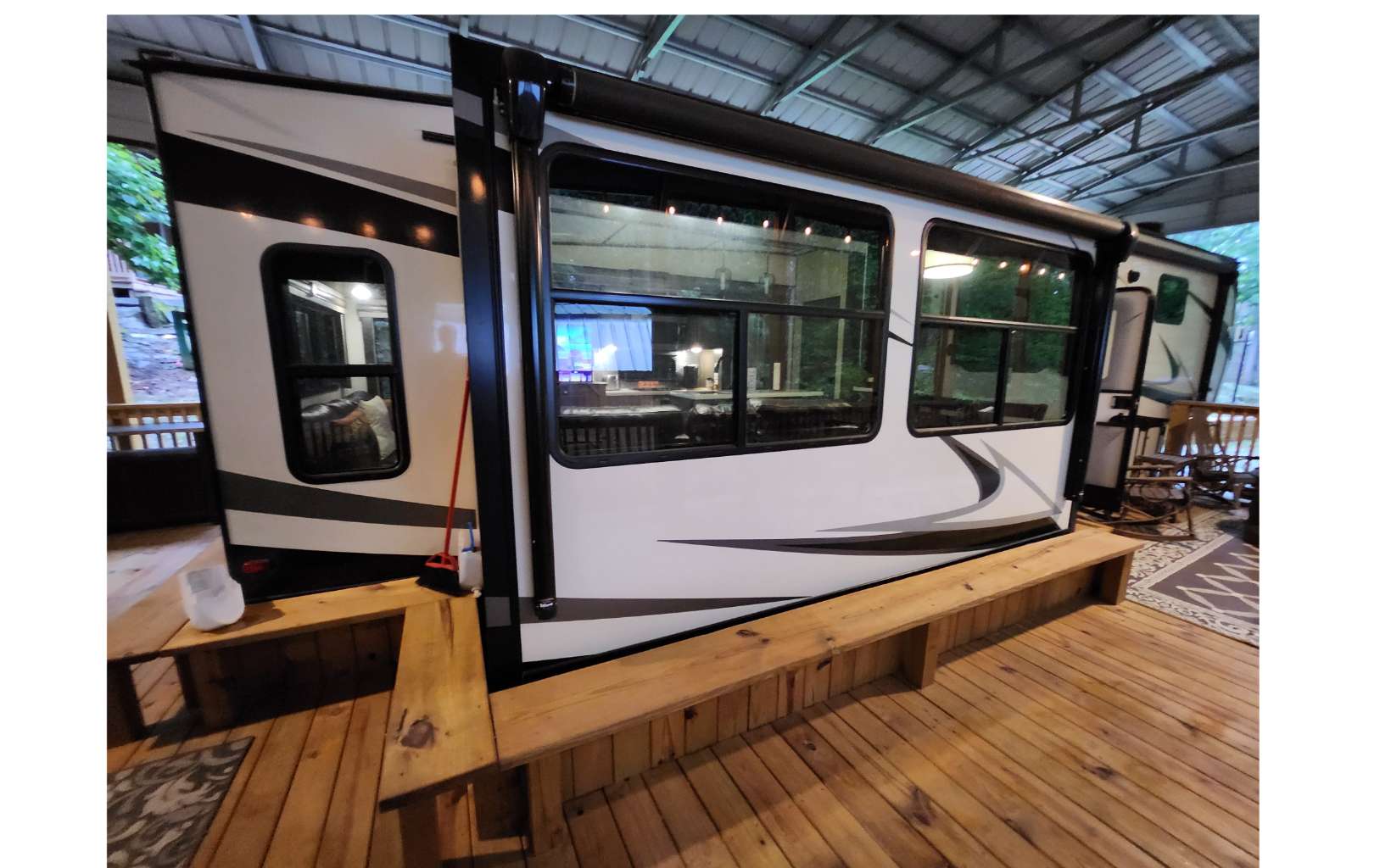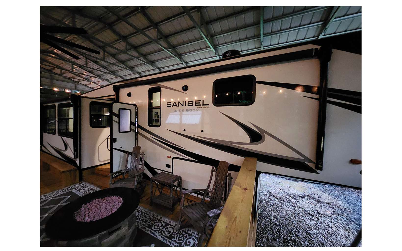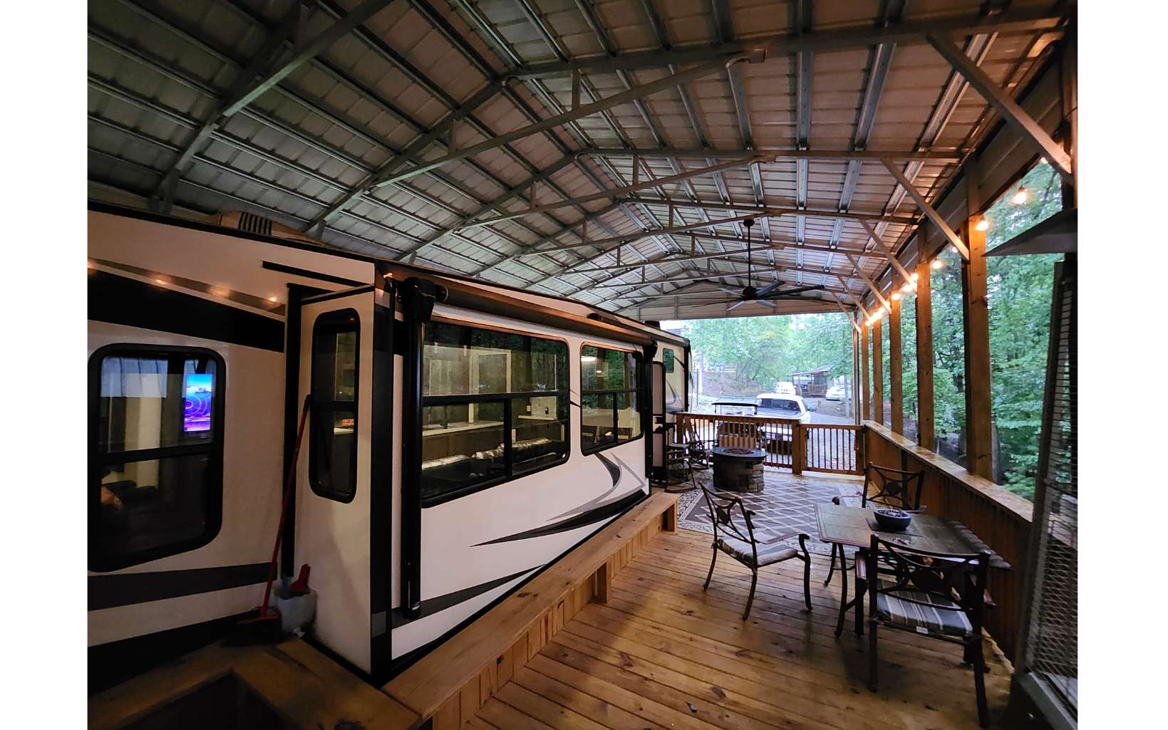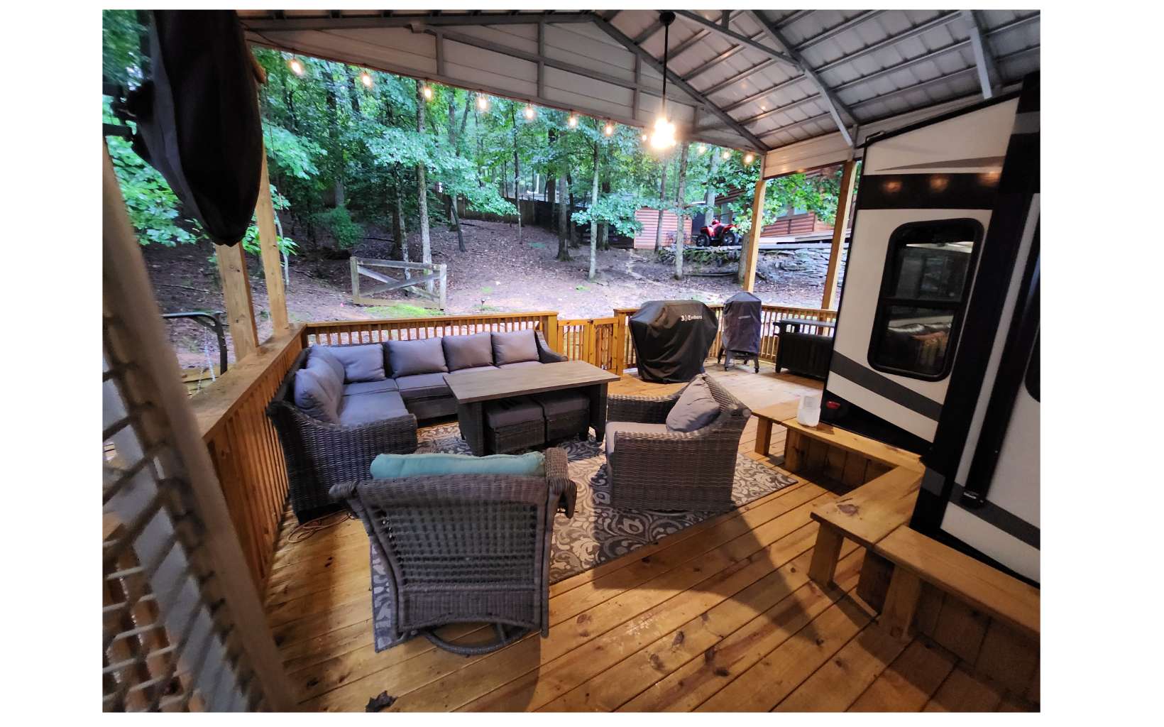 Amazing level RV lot in the beautiful Coosawattee River Resort has all the bells & whistles that few if any others provide. . Gorgeous green space panorama gives you an amazing & peaceful view. Full time or part time living. Just bring your toothbrush as everything you see stays. This like new 2021 Forest River Sanibel with all the works, along with some upgrades. Spectacular state of the art kitchen comes w/ full-size stainless steel appliances, large island & pantry. King bed in bedroom, queen pullout couch, reclining theatre seating, electric fireplace, bluetooth speakers, black out shades Washer/Dryer. Deck has gorgeous touches, w/ handrails and bench seating + 2 large fans, electrical outlets, lighting & outside tv and gas grill. Overlook the greenspace behind you with tons of wildlife. Don't forget to bring your camera! Bonus: Storage building with power. Upgraded 25x50 roof-over, with reinforced support brackets, NEW 51' x 25' covered roof over. See pics for the array of amazing Resort amenities