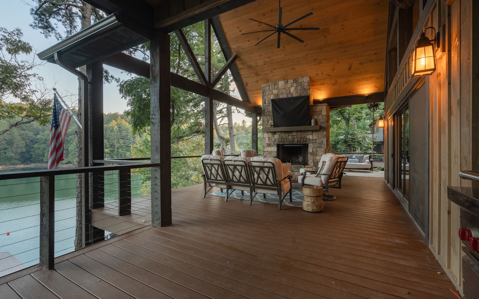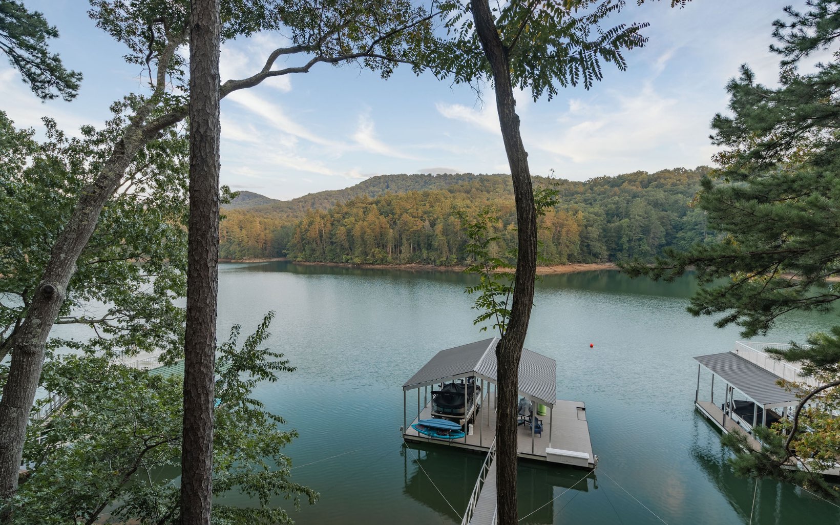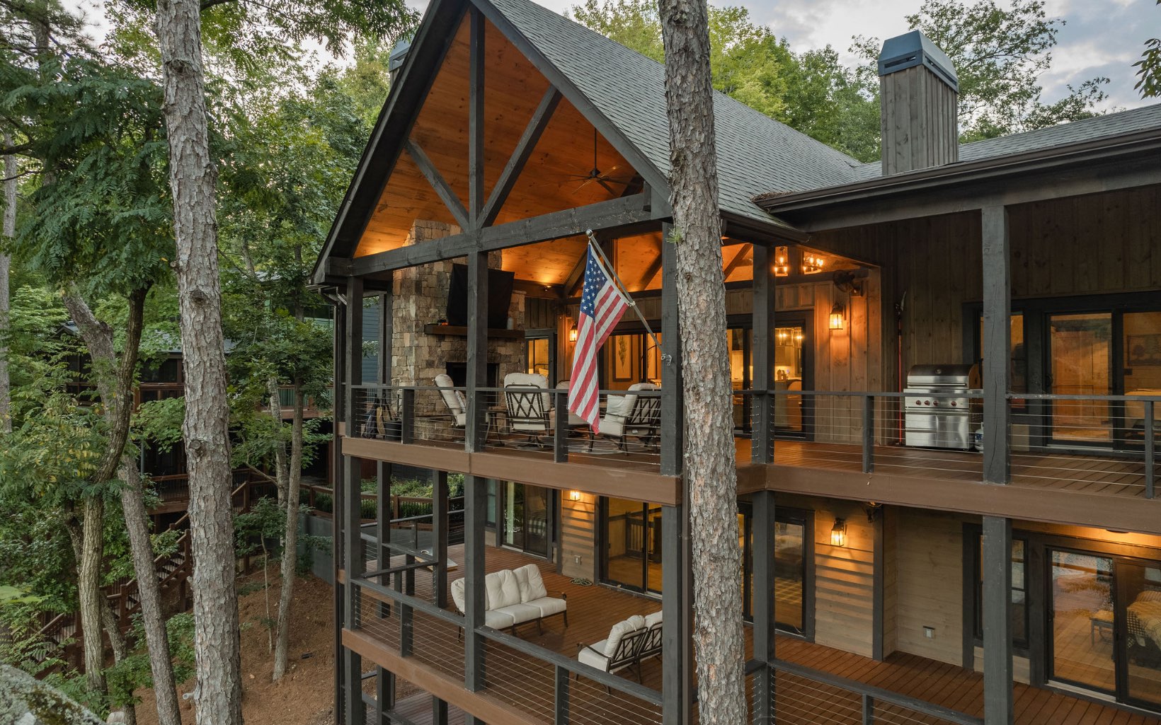 A quintessential mountain oasis blending stunning craftsmanship and refined contemporary elements throughout, 1288 Fishhook Point gives new meaning to lakefront living. Complete with two levels of open-concept living, sprawling outdoor space with three levels of covered outdoor decks and wide-open views of the lake and USNF across the channel, this home has four full bedroom suite with an additional bunk room and two powder rooms, making it the perfect gathering retreat. Cathedral ceilings on the main level and stunning beam work blend seamlessly with walls of glass from the living room and bedrooms for ideal indoor-outdoor living. Masonry fireplaces inside and outside create a rustic ambiance perfect for all seasons. Equipped with Wolf appliances throughout the home, custom inset cabinetry, quartzite countertops, hardwood floors, trex decking and custom lighting. Terrace level complete with large den and coffered ceilings, large F/P, full wet bar, addt’l bunk room and large party deck. Home is located in the highly desired Aska Adventure Area minutes away from sought-after hiking and biking trails. The home is on a gorgeous year-round deep water lot w/ a brand new boat dock and Nat’l Forest views across the water. Built in 2021 and a rarity in the mountains, call today!