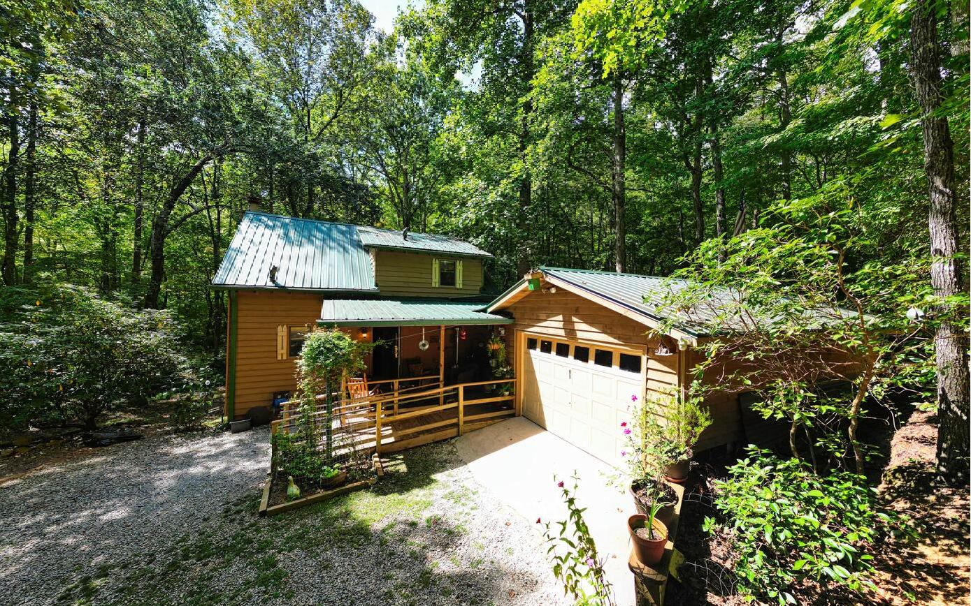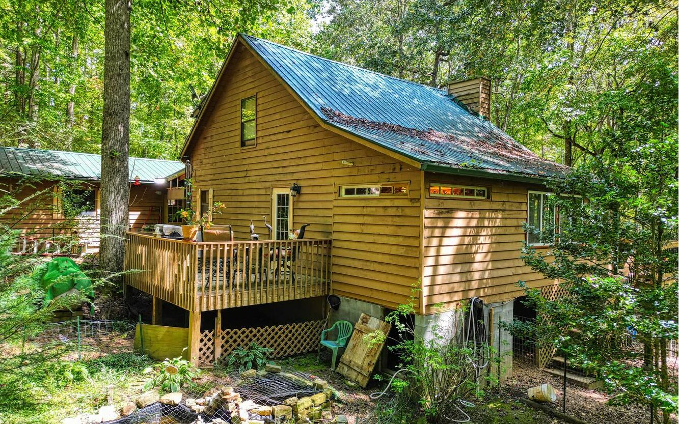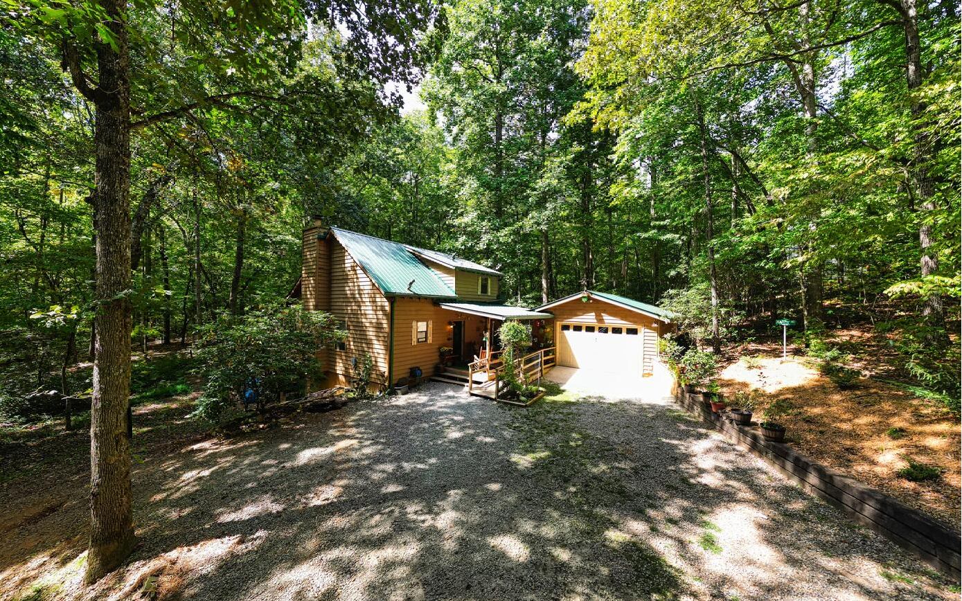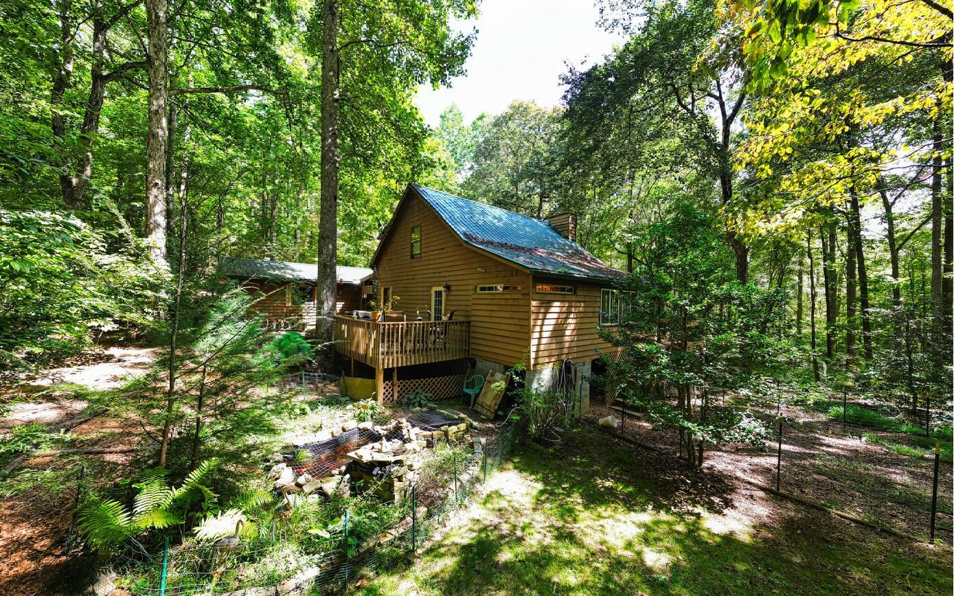 Beautiful cabin nestled in the North Georgia mountains for peace and tranquility. Vaulted ceiling in the living room and kitchen with wood hand hewn beams for an open spacious feeling. Rock fireplace, in living room with and add on dining room, that has lots of windows to enjoy natural lighting and the outdoor atmosphere. Master suite, on main level, has a tile walk in shower. Laundry on main level as well. Natural pine flooring throughout home. Guest suite upstairs with private bath. House is handicap accessible. Enjoy the outside deck for grilling, and entertaining while overlooking the Koi pond with waterfall below.