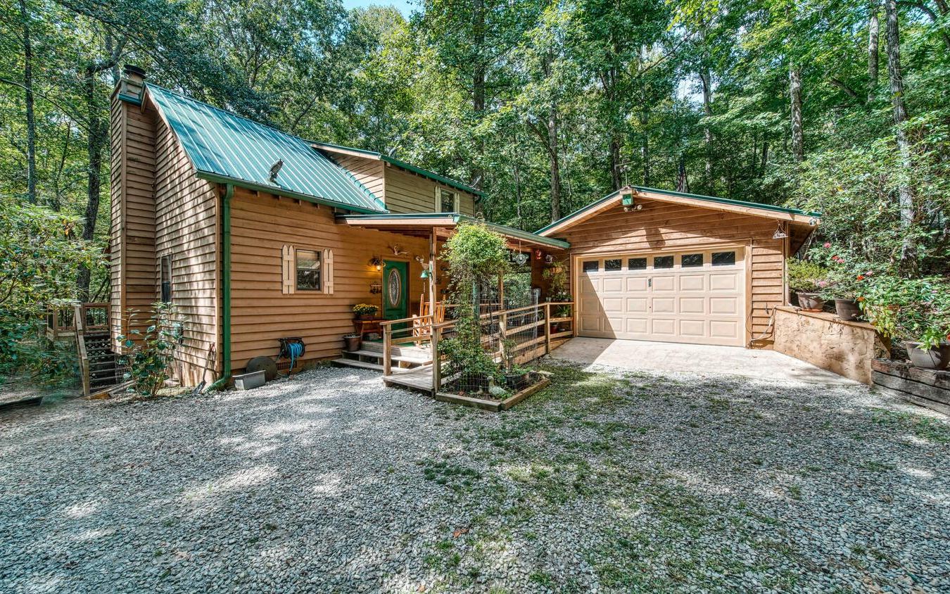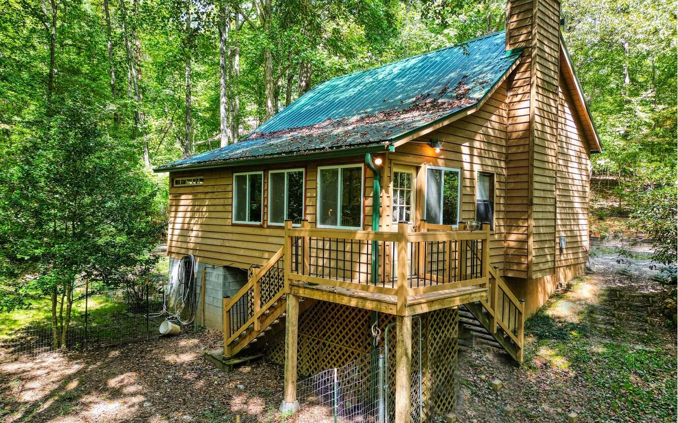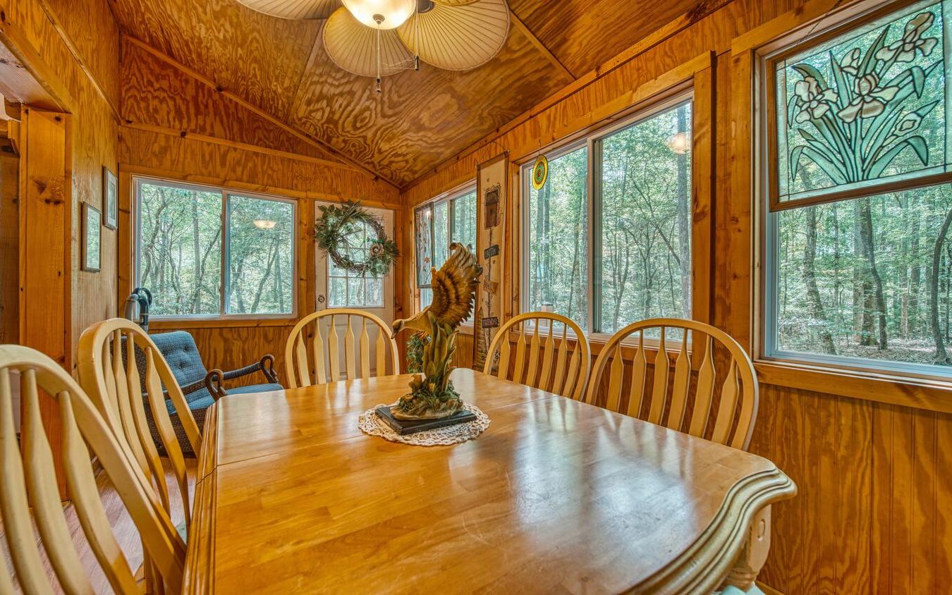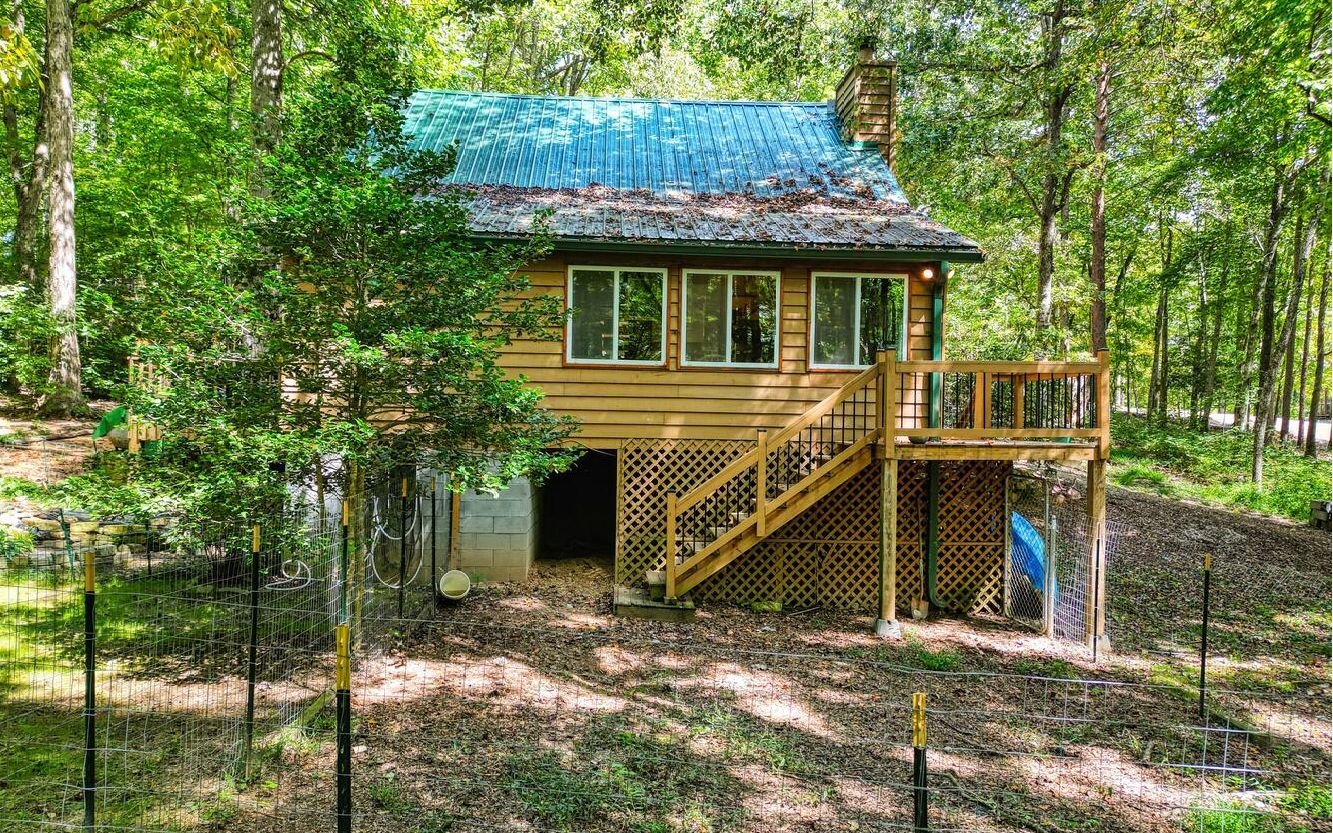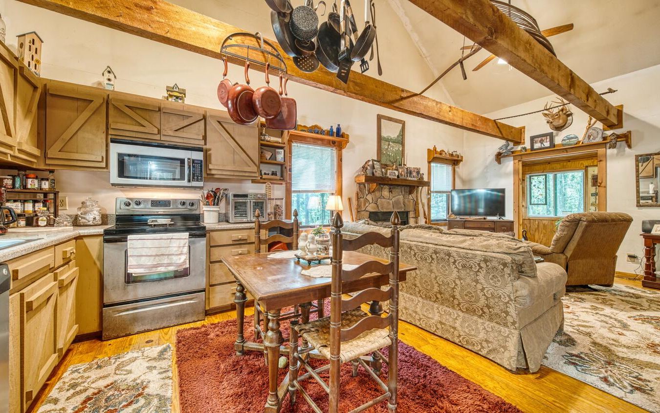 Beautiful cabin nestled in the North Georgia mountains for peace and tranquility. Vaulted ceiling in the living room and kitchen with wood hand hewn beams for an open spacious feeling. Rock fireplace, in living room with and add on dining room, that has lots of windows to enjoy natural lighting and the outdoor atmosphere. Master suite, on main level, has a tile walk in shower. Laundry on main level as well. Natural pine flooring throughout home. Guest suite upstairs with private bath. House is handicap accessible. Enjoy the outside deck for grilling, and entertaining while overlooking the Koi pond with waterfall below.