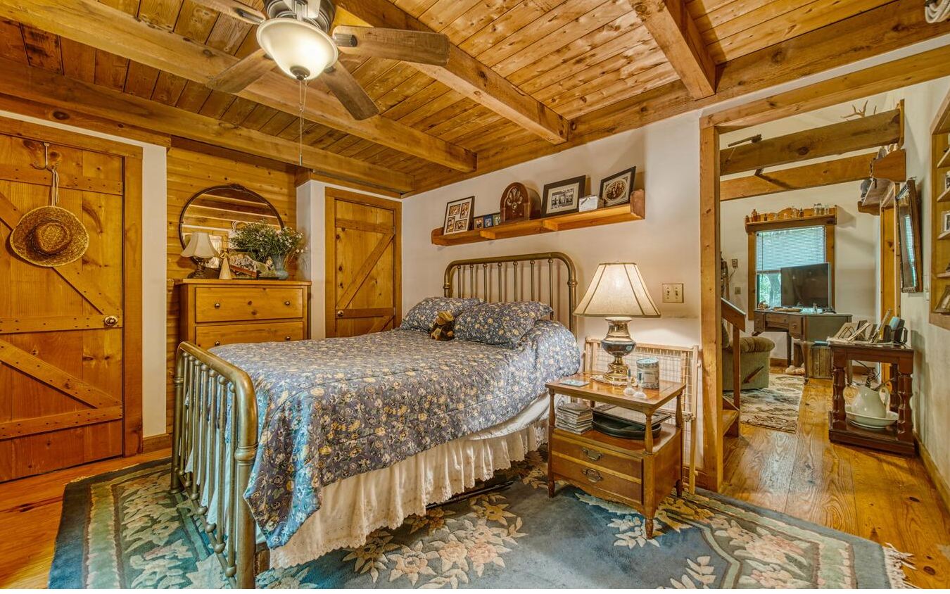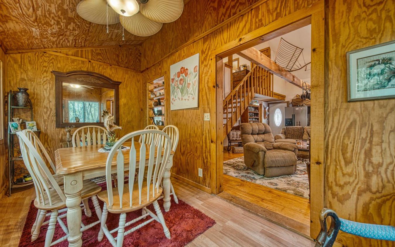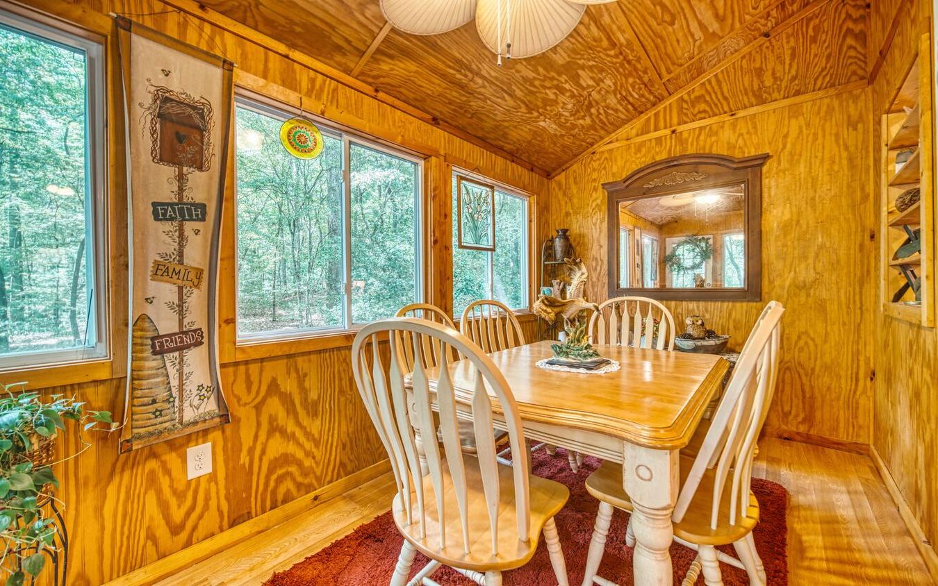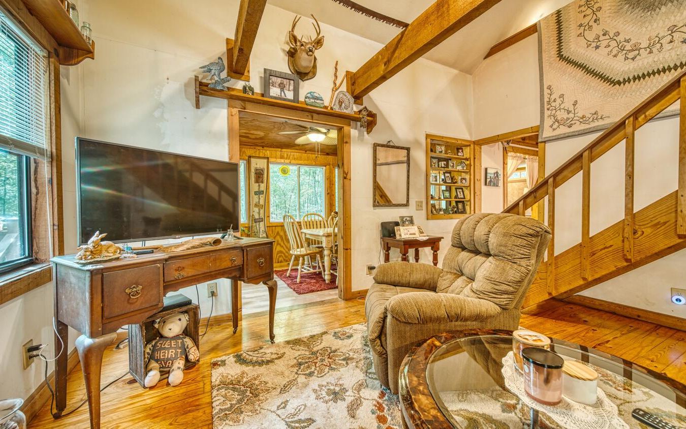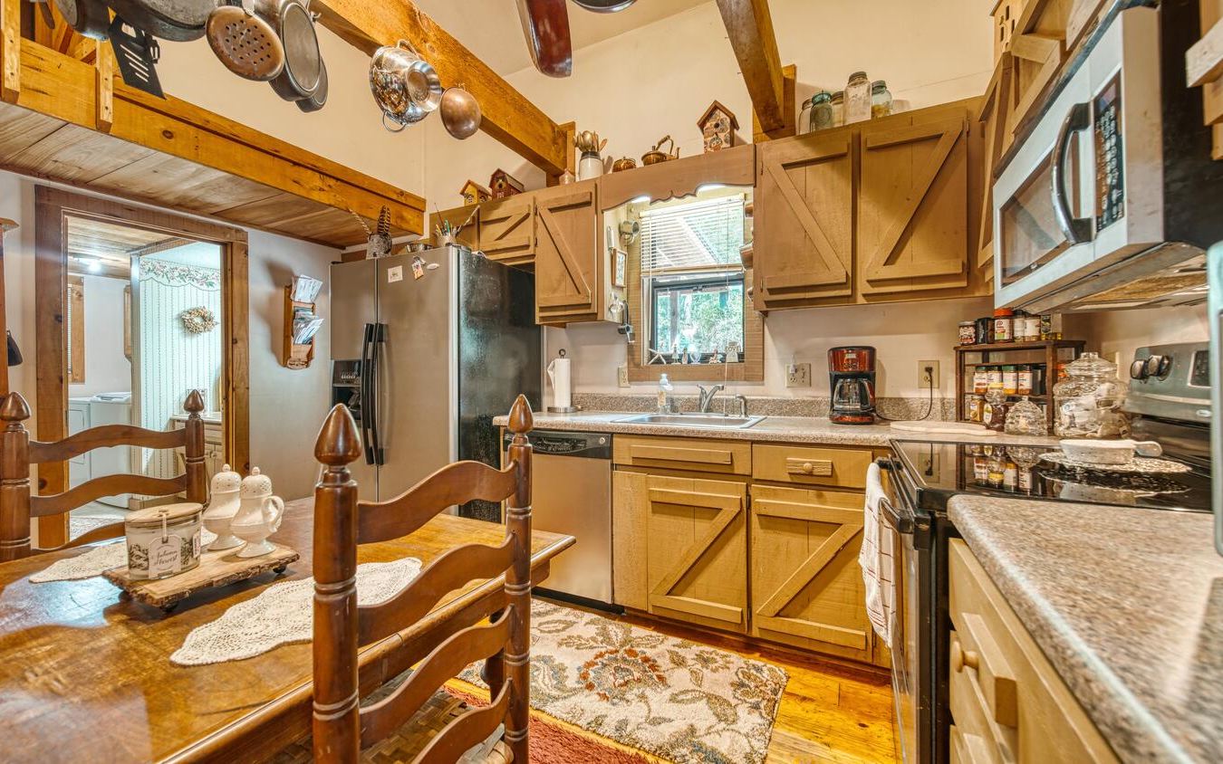 Beautiful cabin nestled in the North Georgia mountains for peace and tranquility. Vaulted ceiling in the living room and kitchen with wood hand hewn beams for an open spacious feeling. Rock fireplace, in living room with and add on dining room, that has lots of windows to enjoy natural lighting and the outdoor atmosphere. Master suite, on main level, has a tile walk in shower. Laundry on main level as well. Natural pine flooring throughout home. Guest suite upstairs with private bath. House is handicap accessible. Enjoy the outside deck for grilling, and entertaining while overlooking the Koi pond with waterfall below.